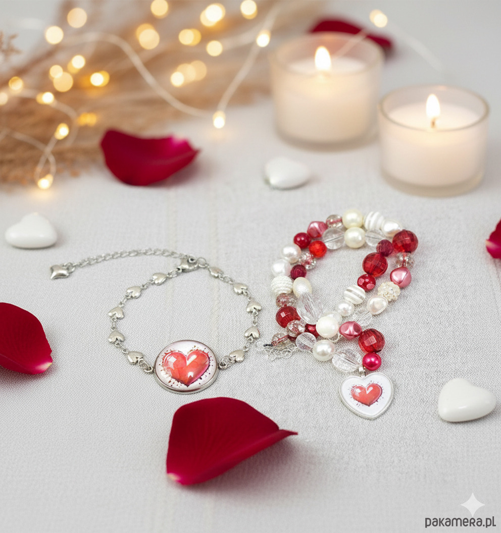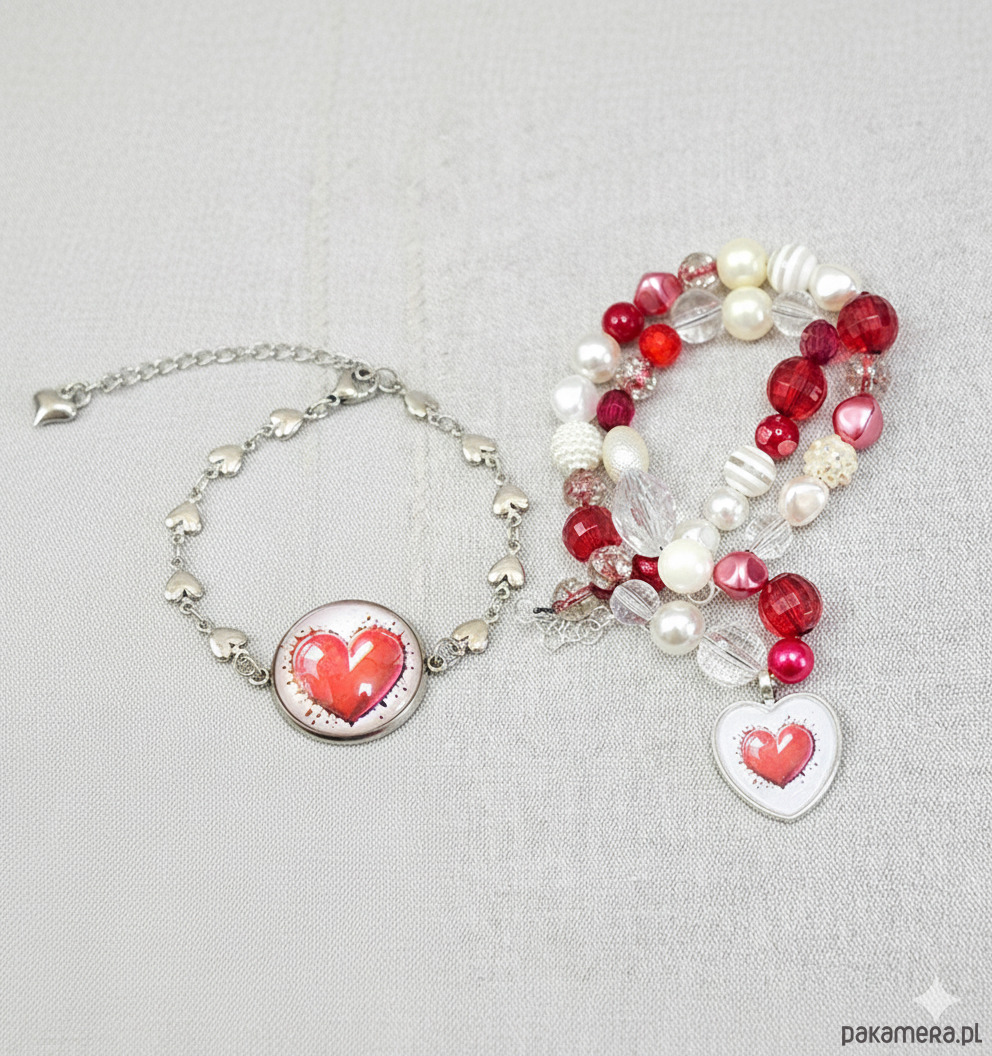 Został wykonany z bogatej mieszanki koralików w odcieniach intensywnej czerwieni oraz eleganckiej perłowej bieli i kremu.