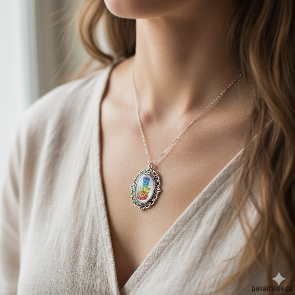 Dodatkowo, barwy tęczy na tym wisiorku wzmacniają jego symbolikę, reprezentując: