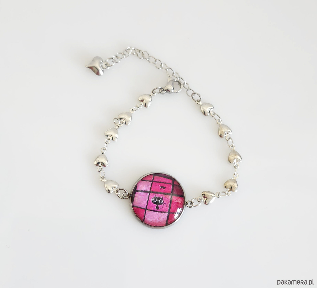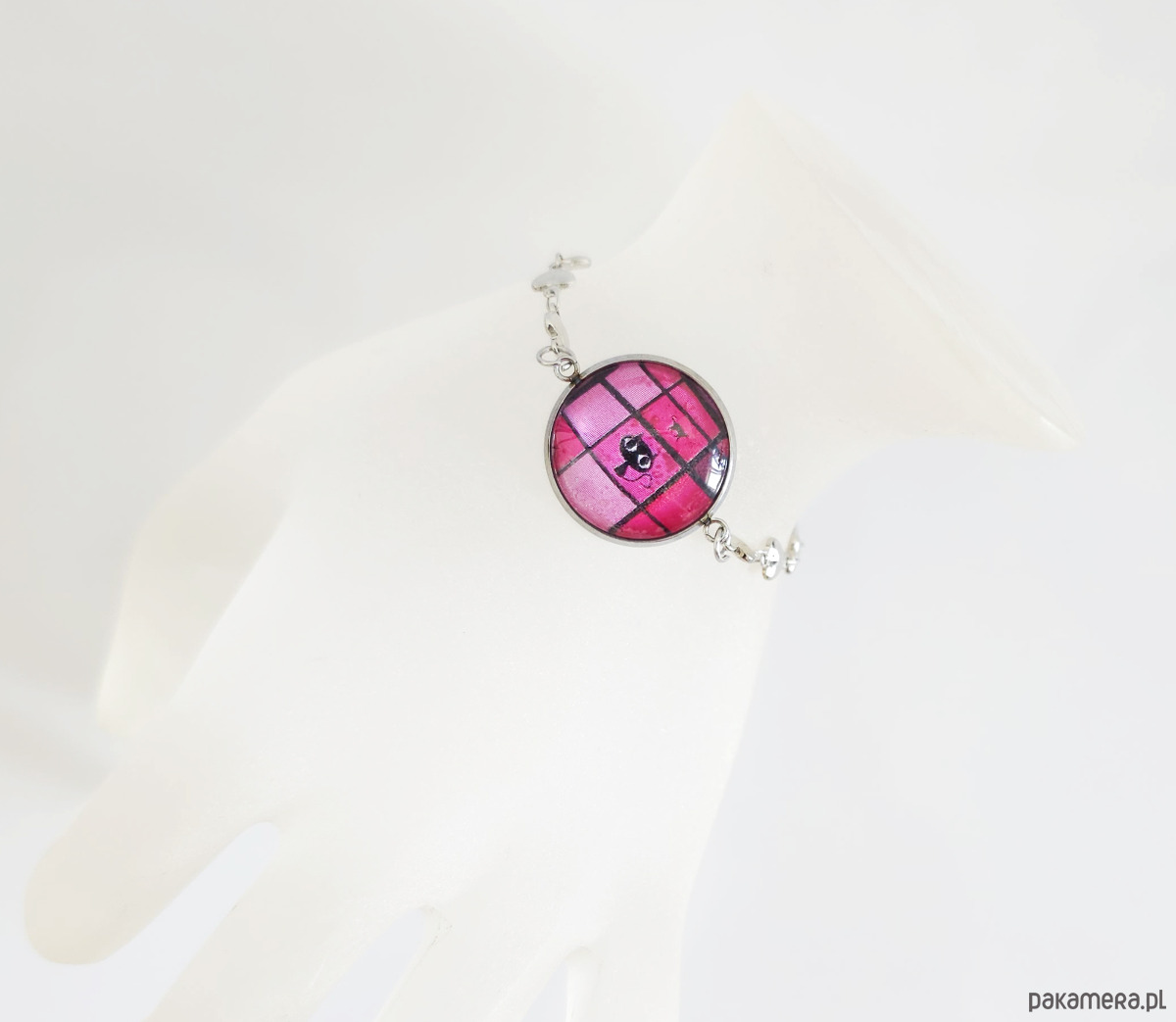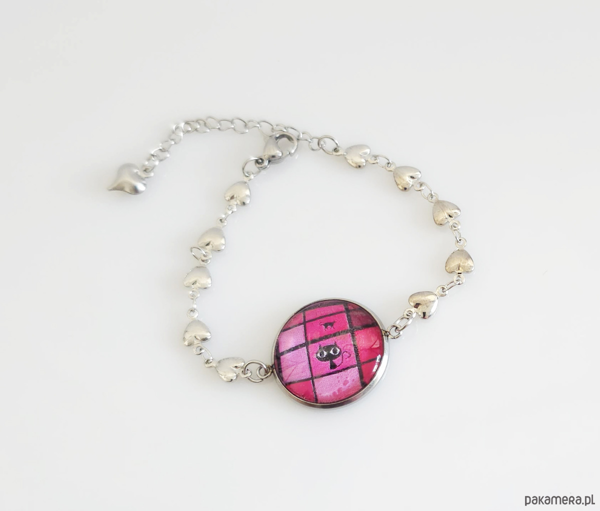 Z centralnym elementem przedstawiającym uroczego, czarnego kotka na różowym tle w kratkę, ta biżuteria doda charakteru każdej stylizacji.