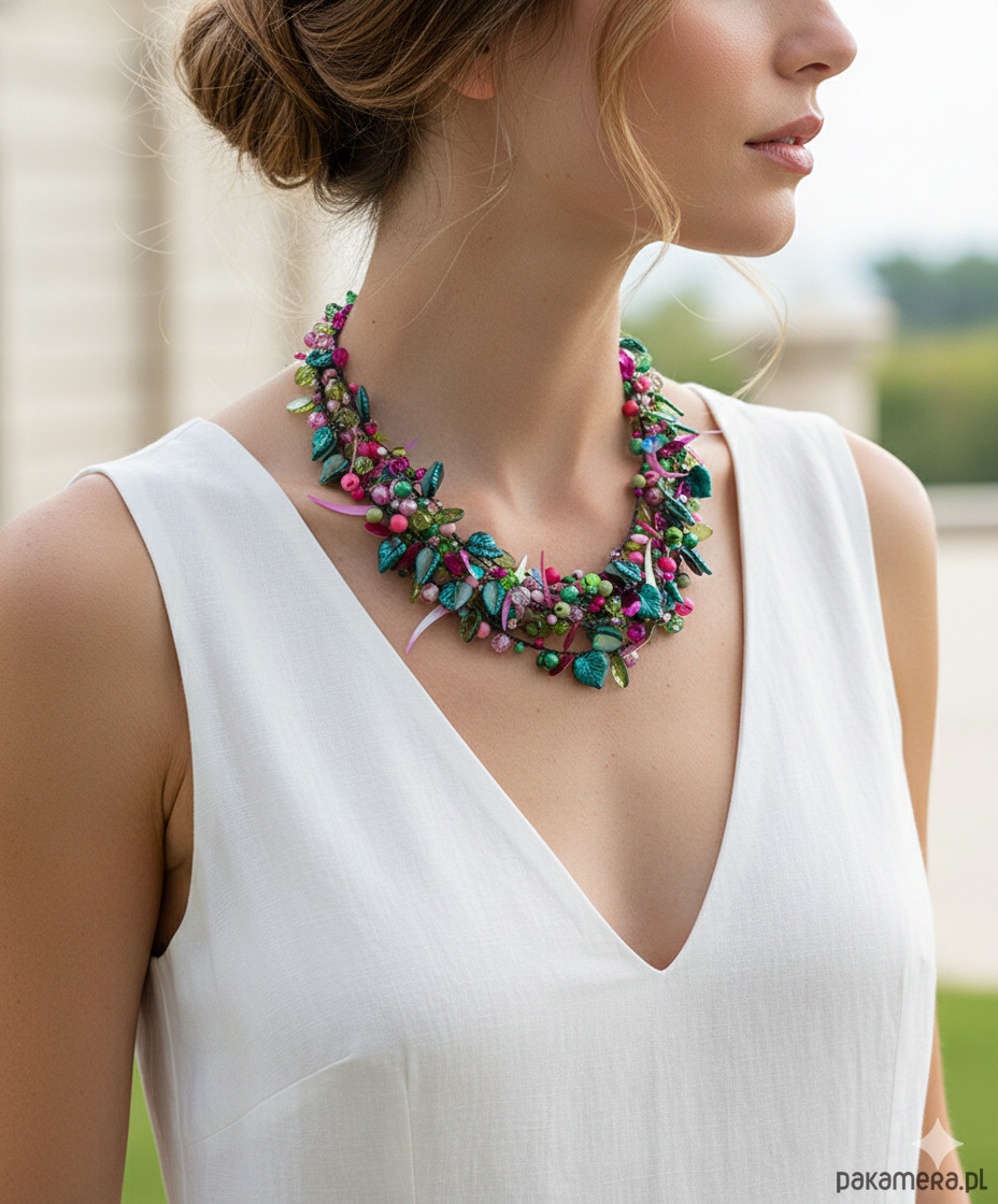 Poczuj letnią energię z naszym najnowszym naszyjnikiem! Połączenie soczystych odcieni zieleni, głębokiego turkusu i elektryzującego różu, wzbogacone o błyszczące, fasetowane elementy, przywołuje wspomnienia egzotycznych ogrodów.