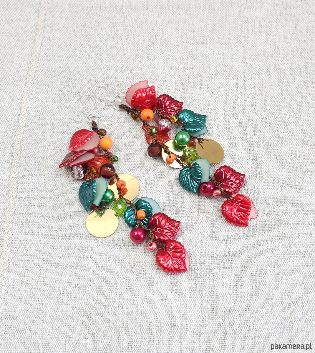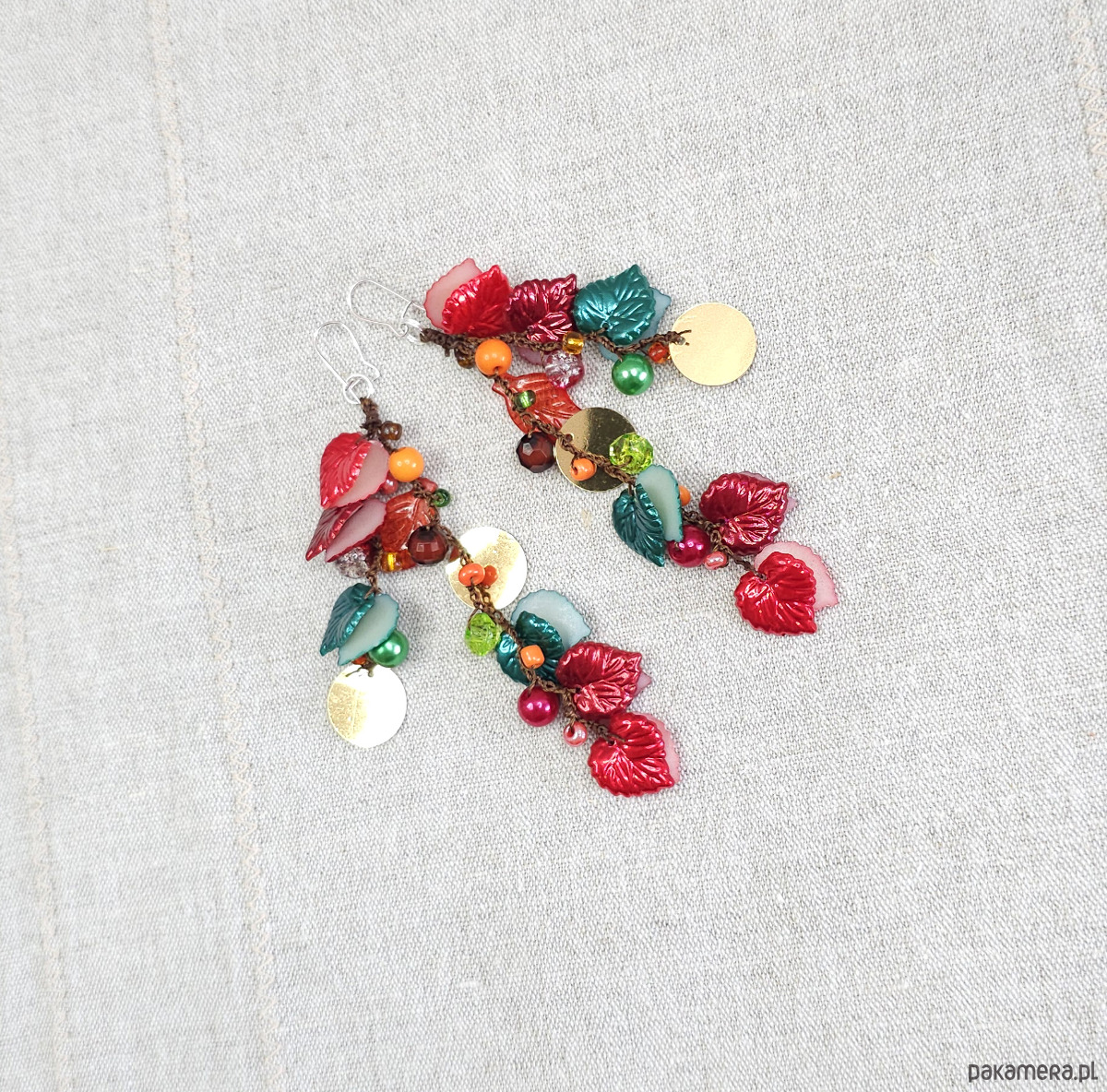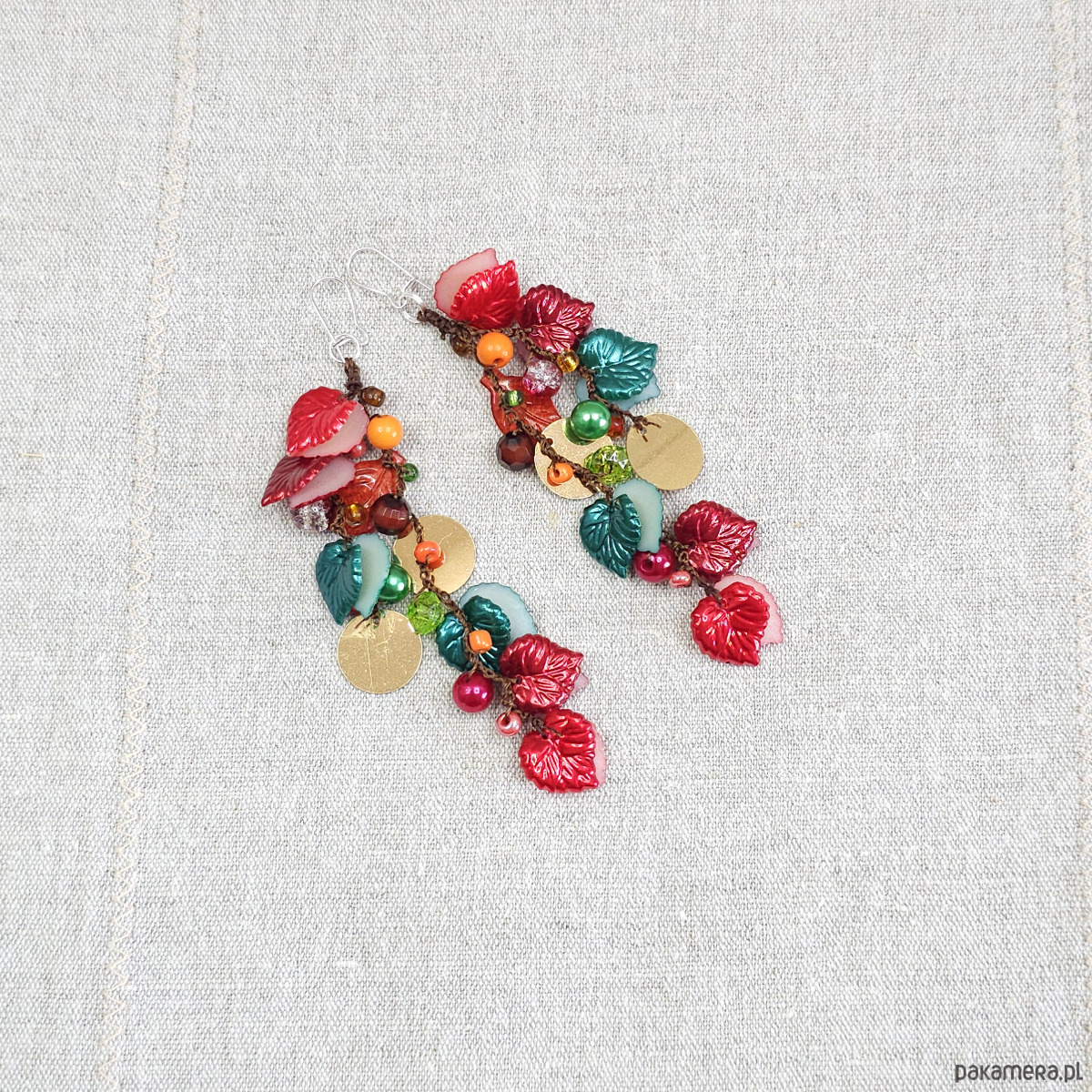 Zostały wykonane z lekkich, akrylowych elementów w kształcie liści w odcieniach głębokiej czerwieni i turkusu. Kompozycję dopełniają drobne szklane koraliki oraz lśniące, złote cekiny, które dodają im elegancji i dynamicznego charakteru.
