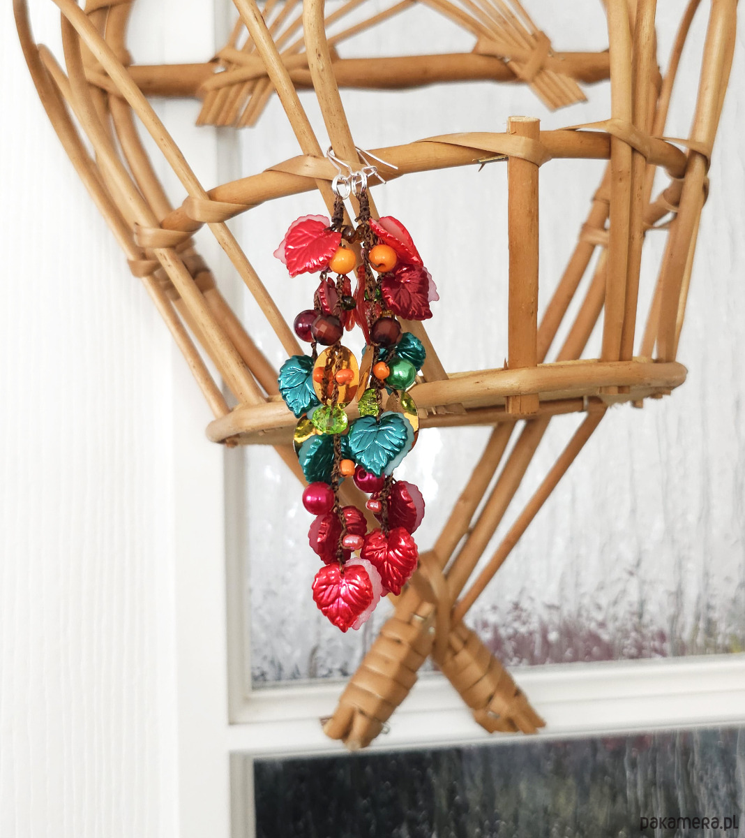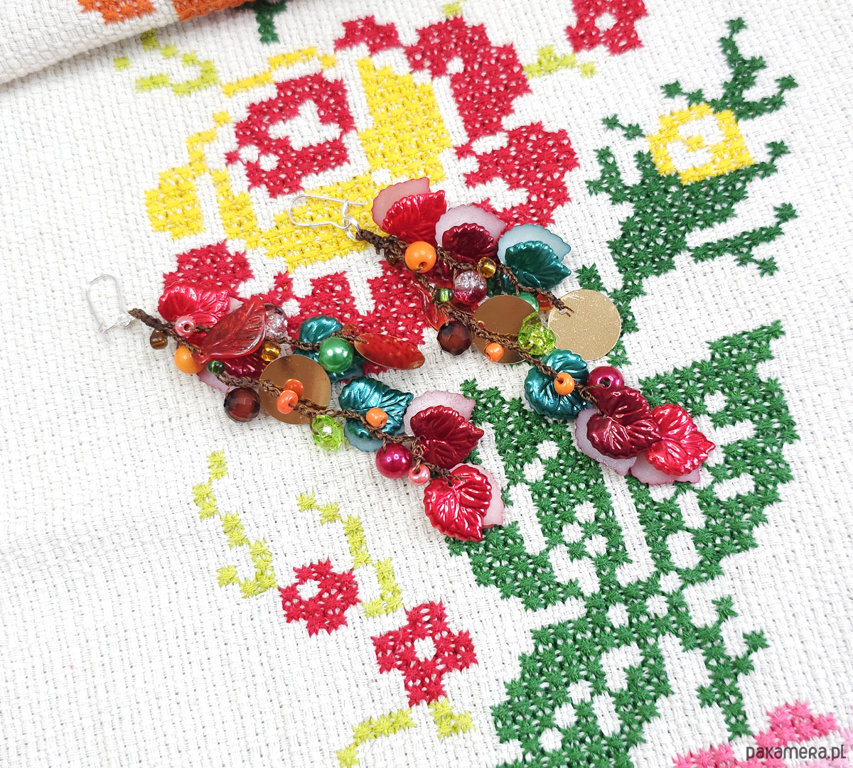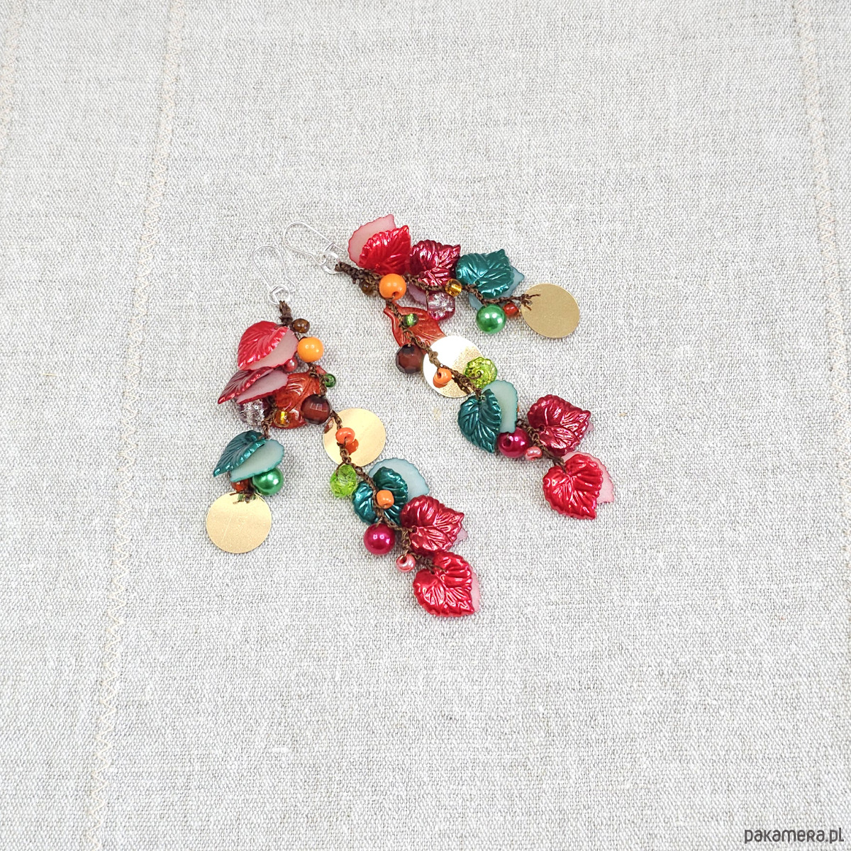 Zostały wykonane z lekkich, akrylowych elementów w kształcie liści w odcieniach głębokiej czerwieni i turkusu. Kompozycję dopełniają drobne szklane koraliki oraz lśniące, złote cekiny, które dodają im elegancji i dynamicznego charakteru.