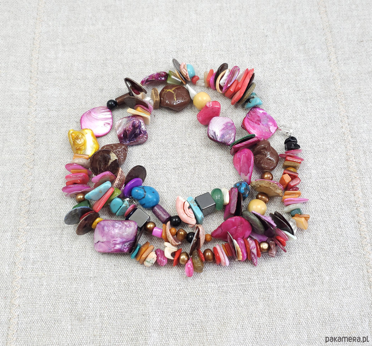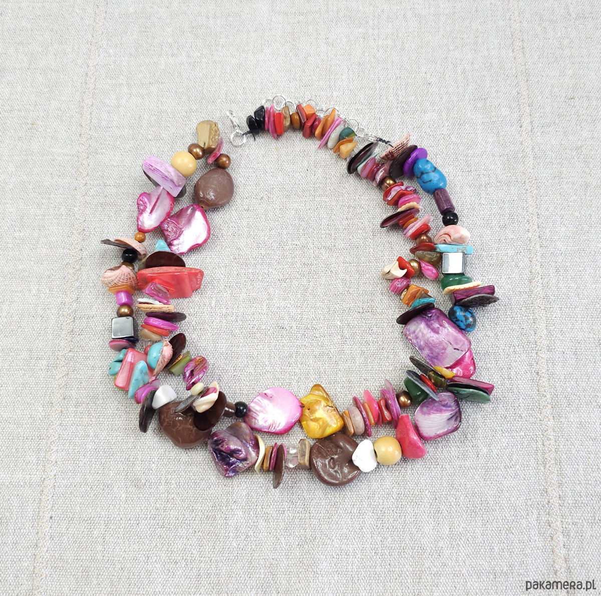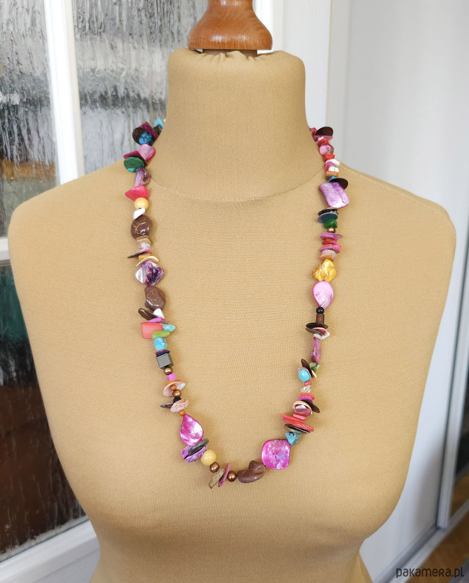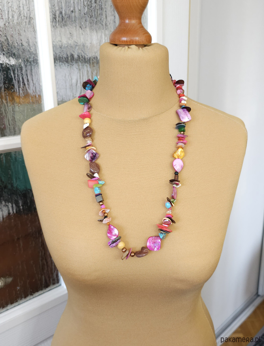 Ten wyjątkowy, ręcznie robiony naszyjnik to prawdziwa feeria barw. Wykonany z naturalnych materiałów, takich jak masa perłowa w odcieniach fuksji, różu, żółci i turkusu, oraz howlit, marmur i perły słodkowodne, dodaje stylizacjom oryginalności.