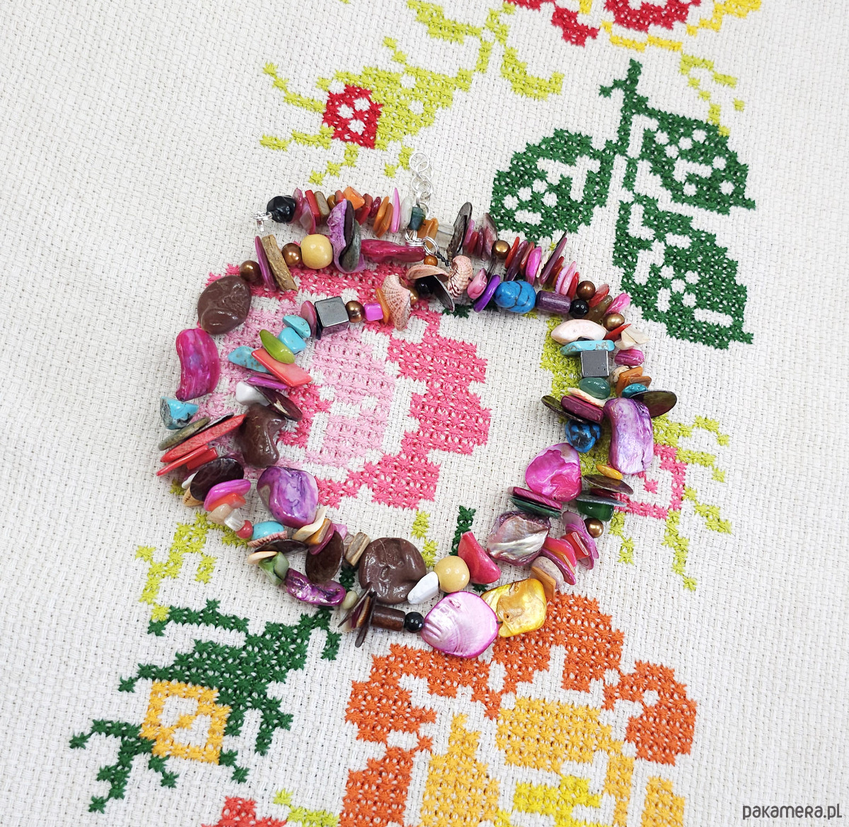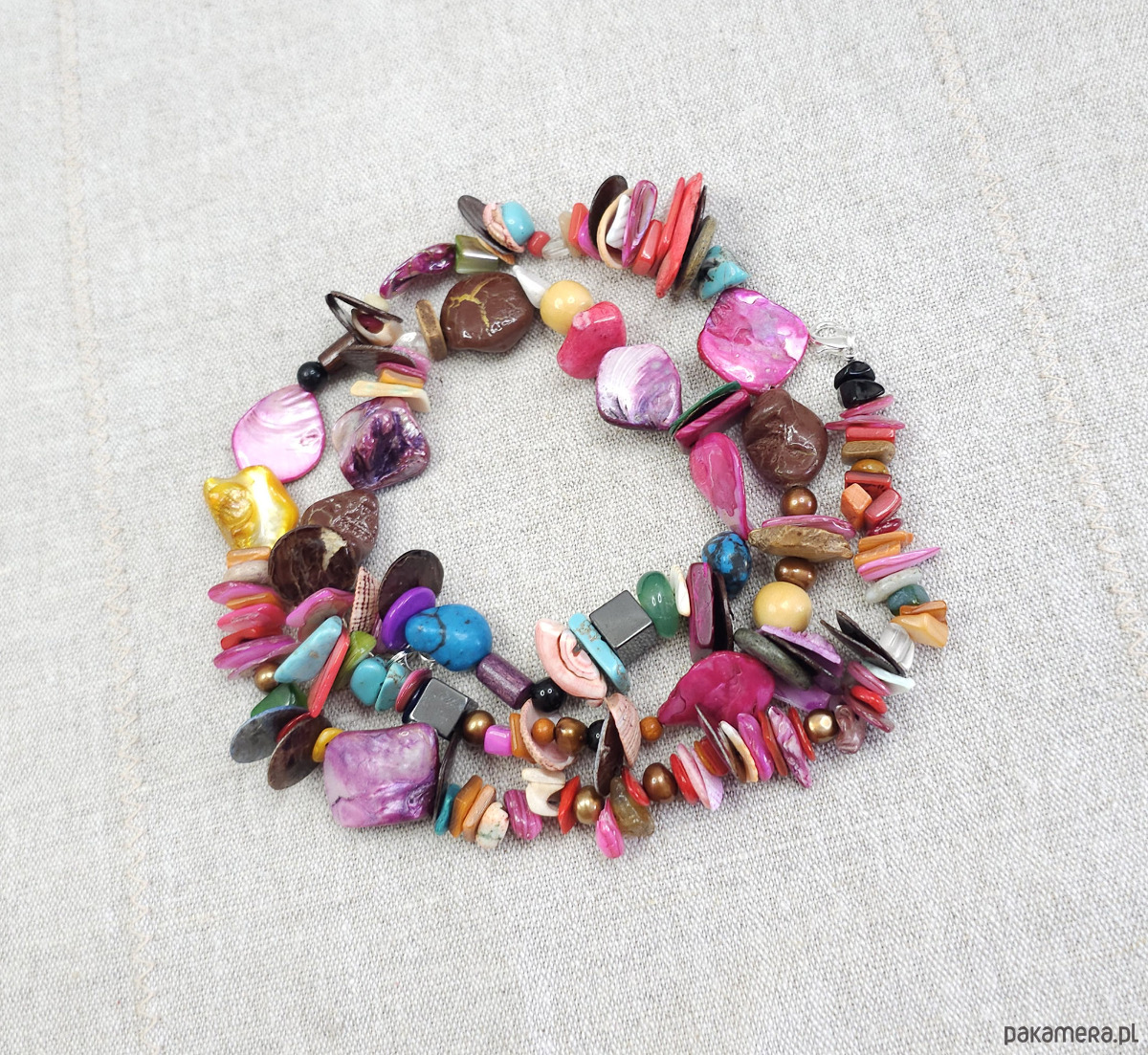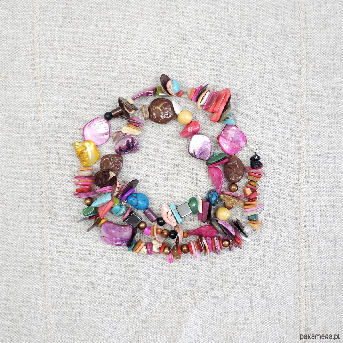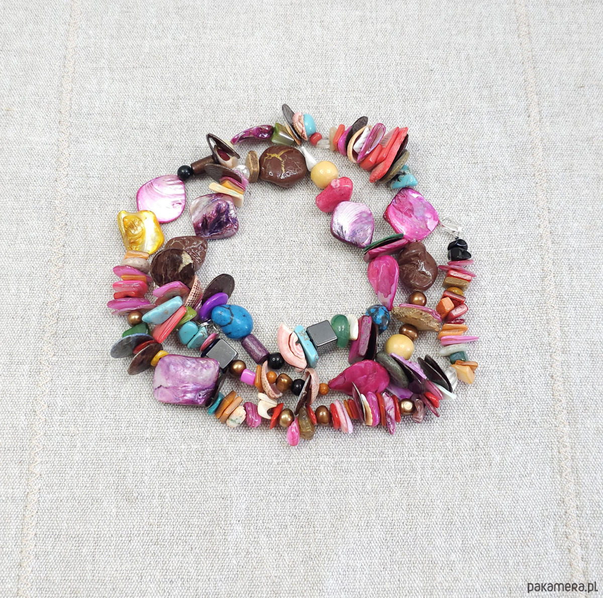 Ten wyjątkowy, ręcznie robiony naszyjnik to prawdziwa feeria barw. Wykonany z naturalnych materiałów, takich jak masa perłowa w odcieniach fuksji, różu, żółci i turkusu, oraz howlit, marmur i perły słodkowodne, dodaje stylizacjom oryginalności.