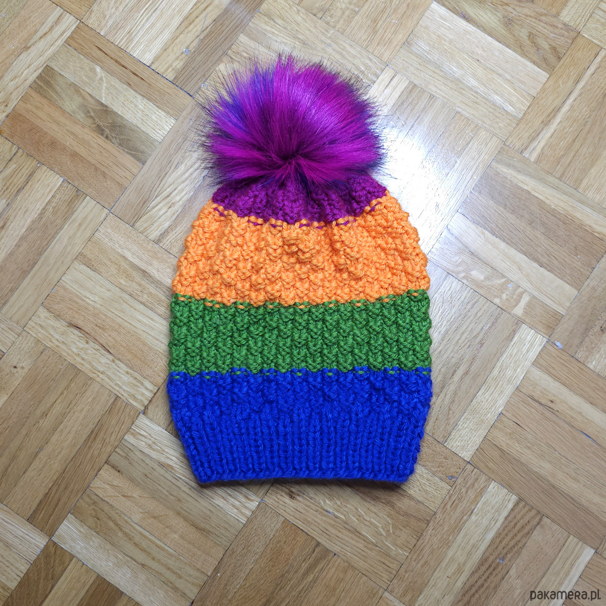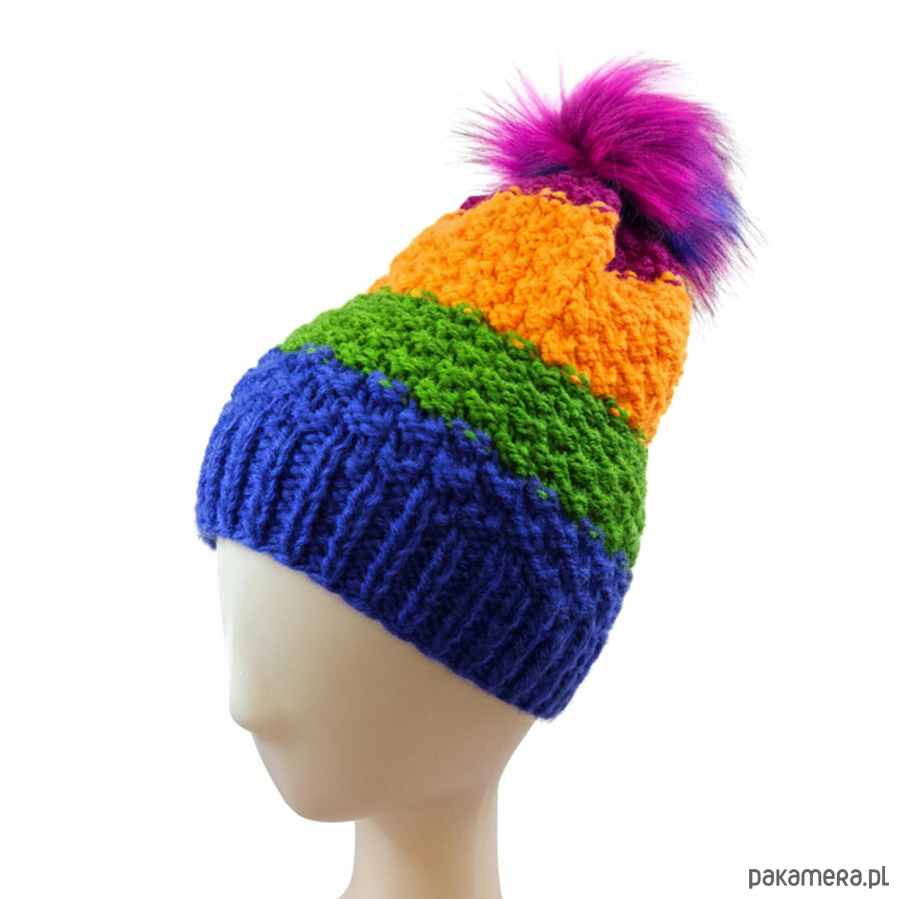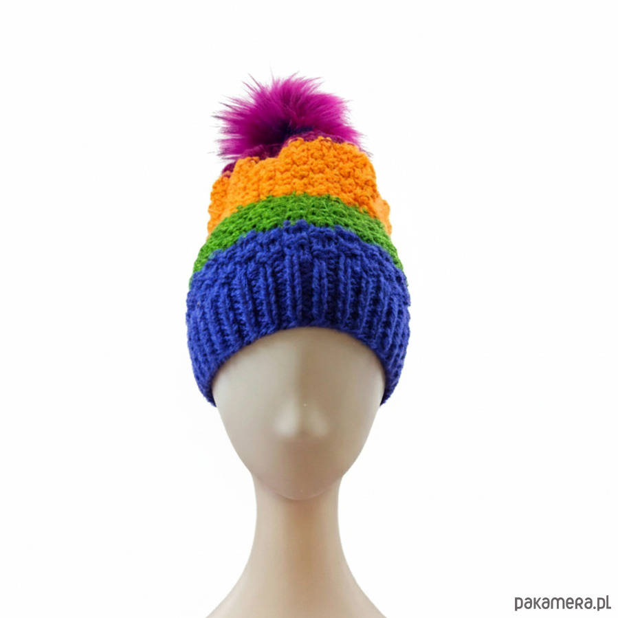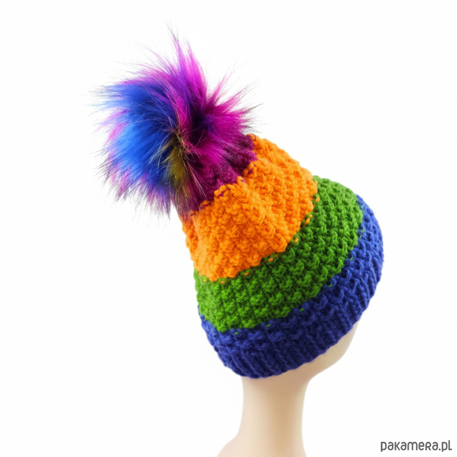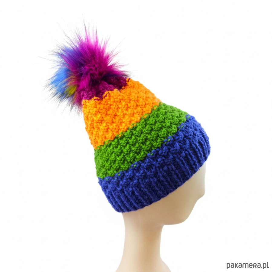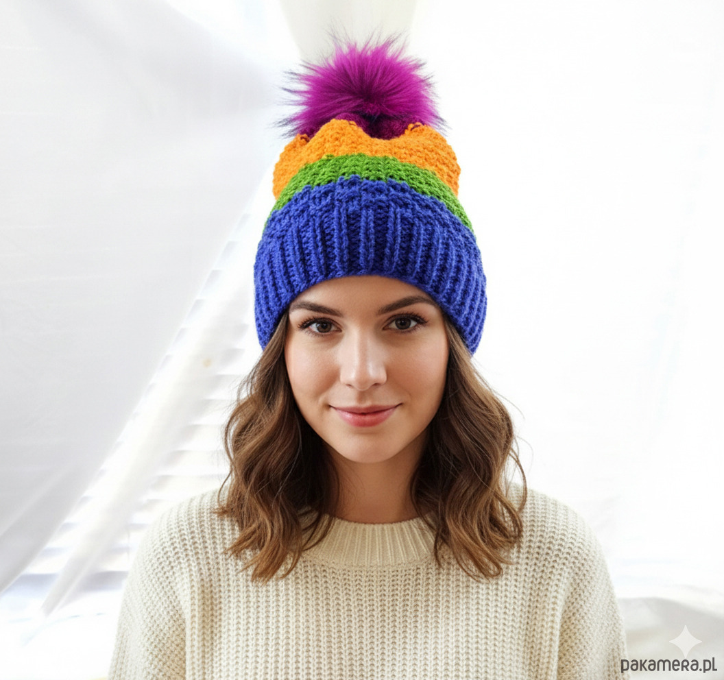 6904 Energetyczna Czapka Beanie w Żywe Pasy z Pomponem