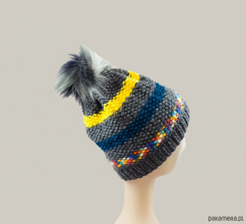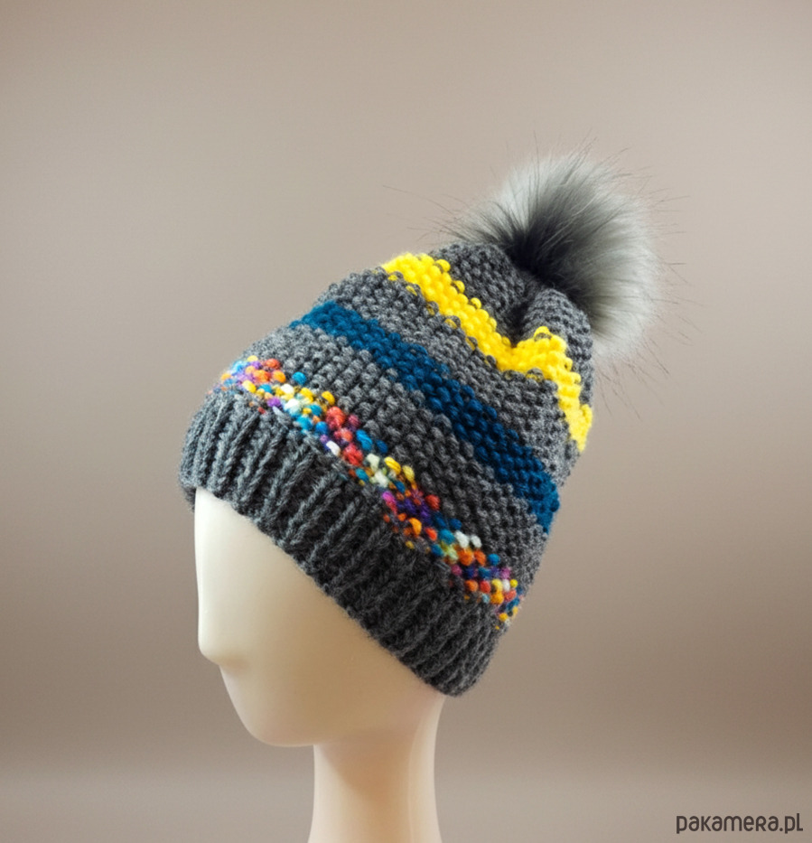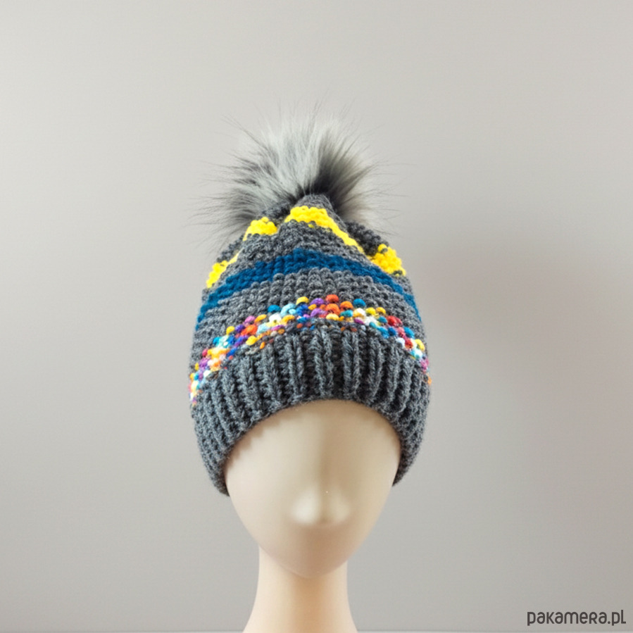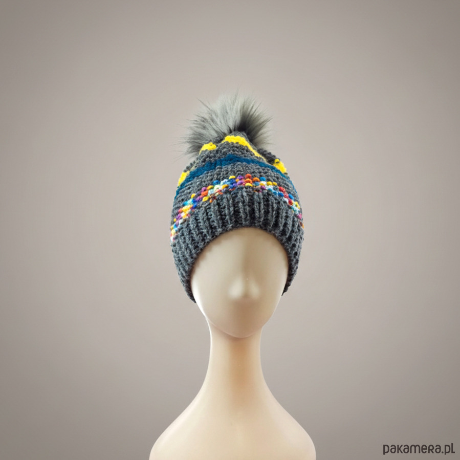 6911 Czapka zimowa szara z kolorowymi paskami i pomponem