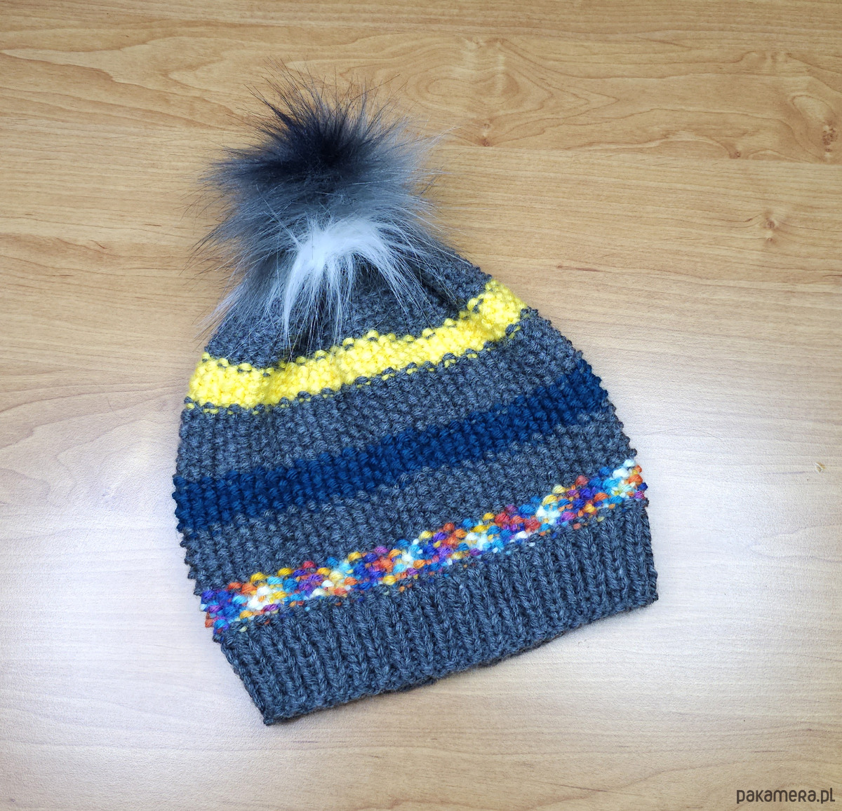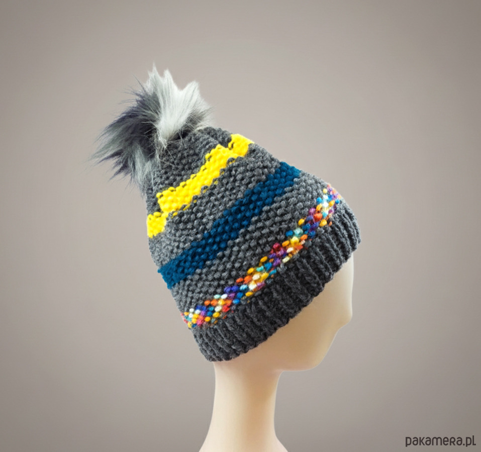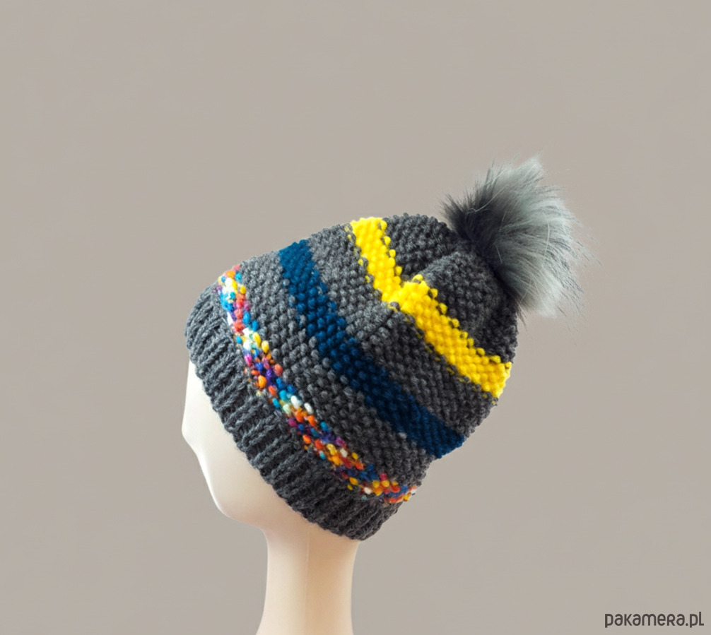 6911 Czapka zimowa szara z kolorowymi paskami i pomponem
