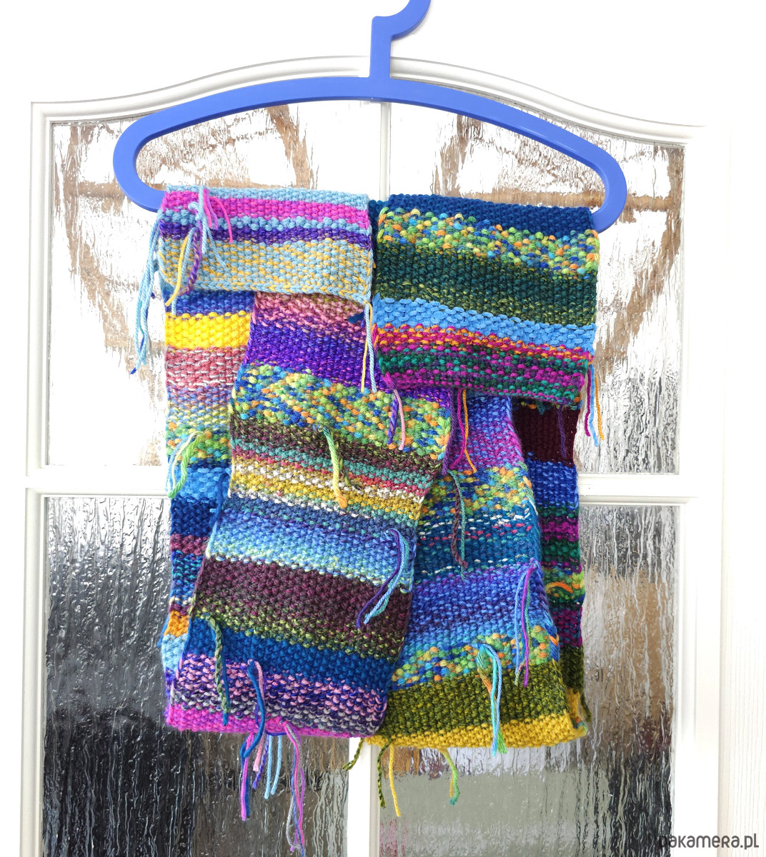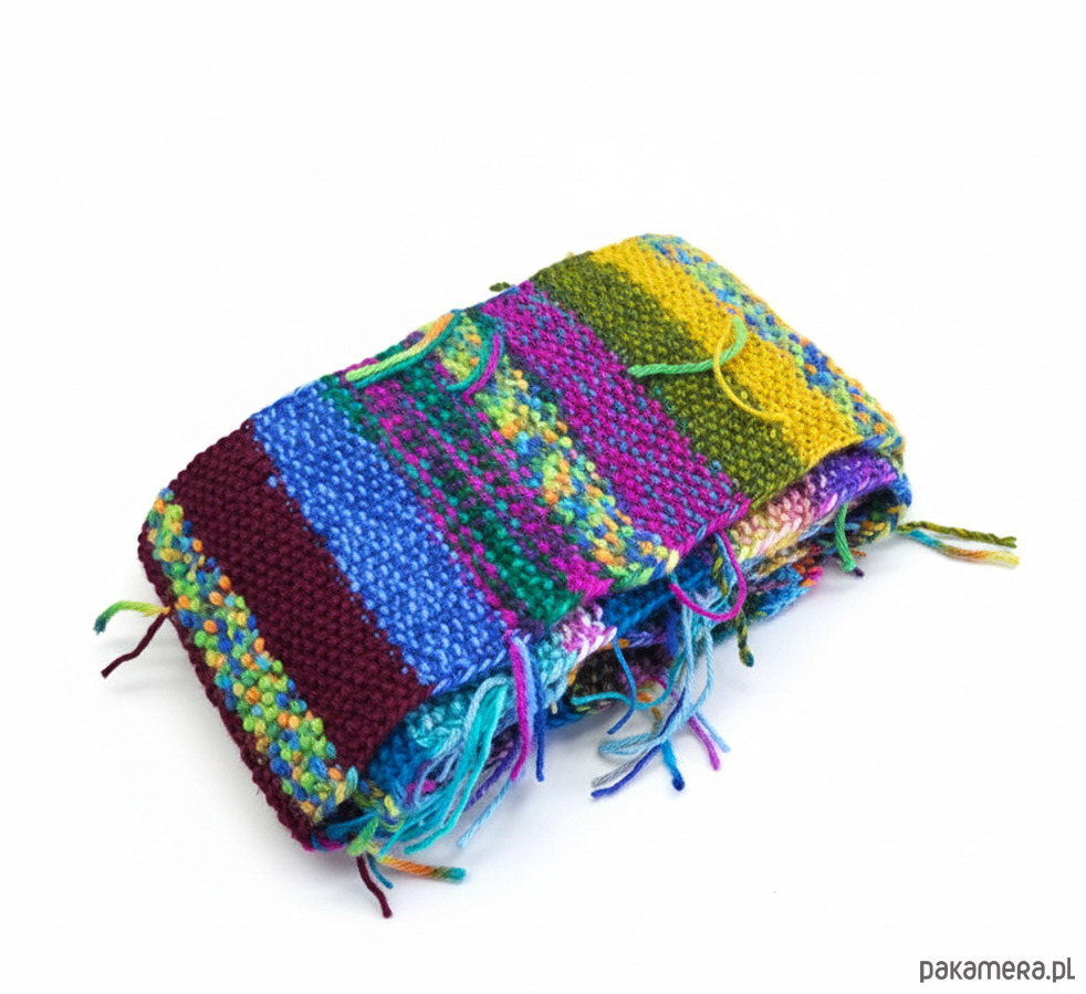 Szal zachwyca bogactwem kolorów: intensywna fuksja, soczysta żółć, turkus, głęboki granat, śliwka i oliwkowa zieleń. Grubo dziany ma fantastyczną, organiczną fakturę.