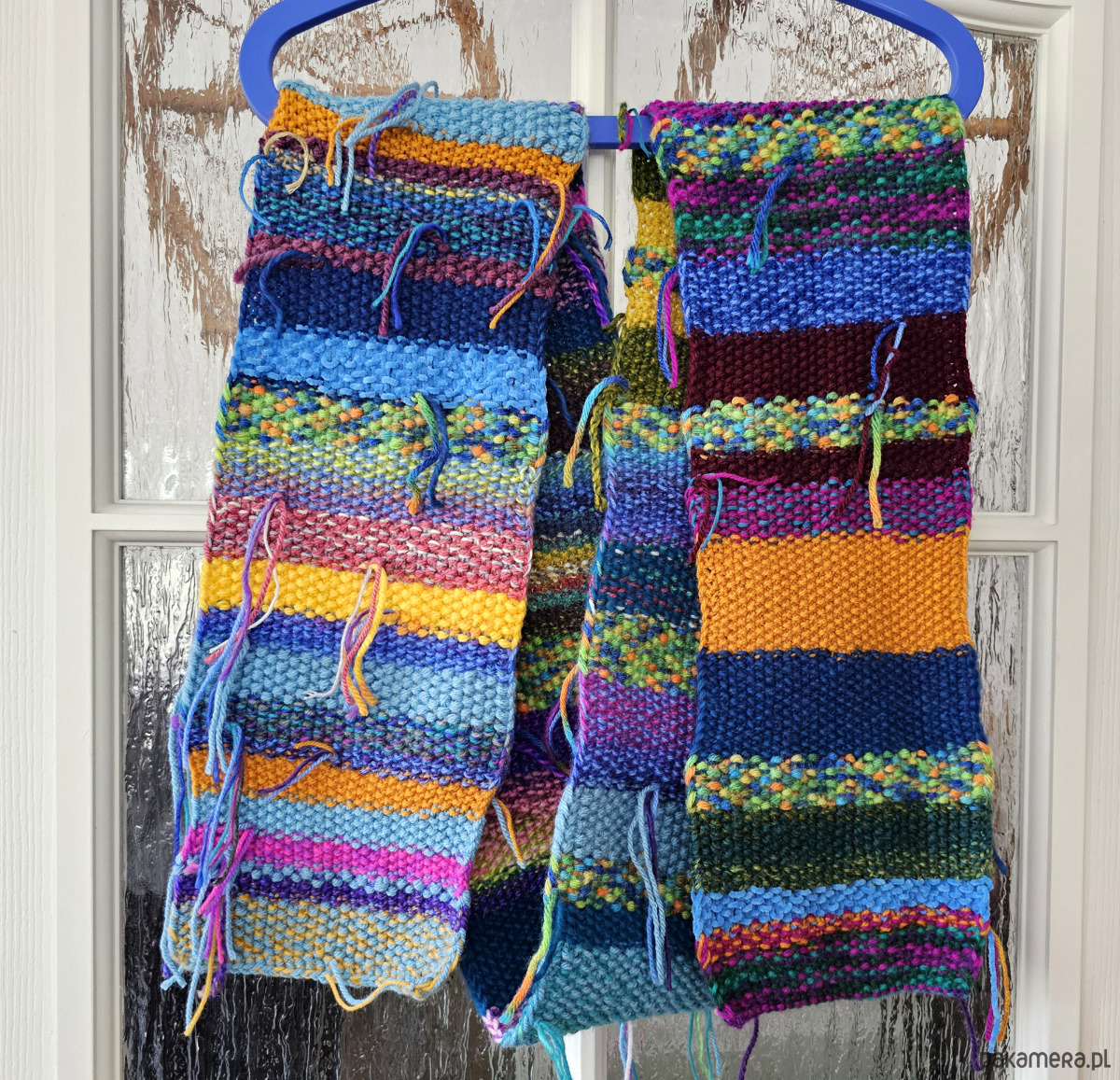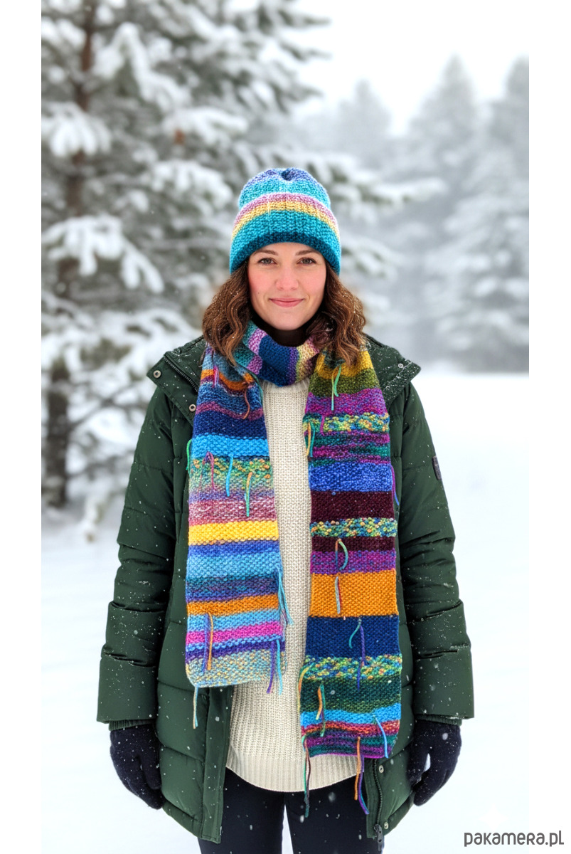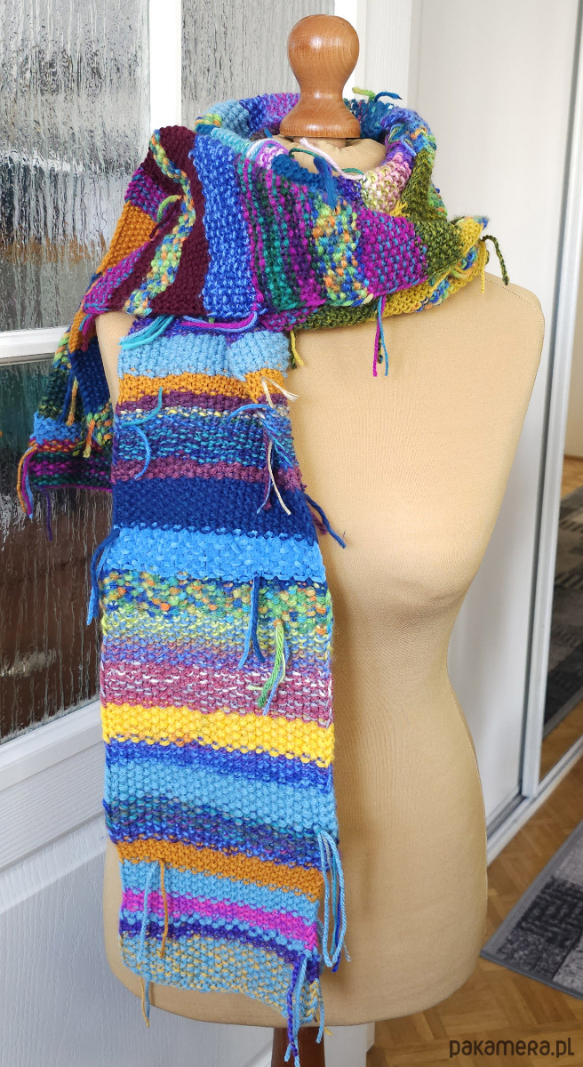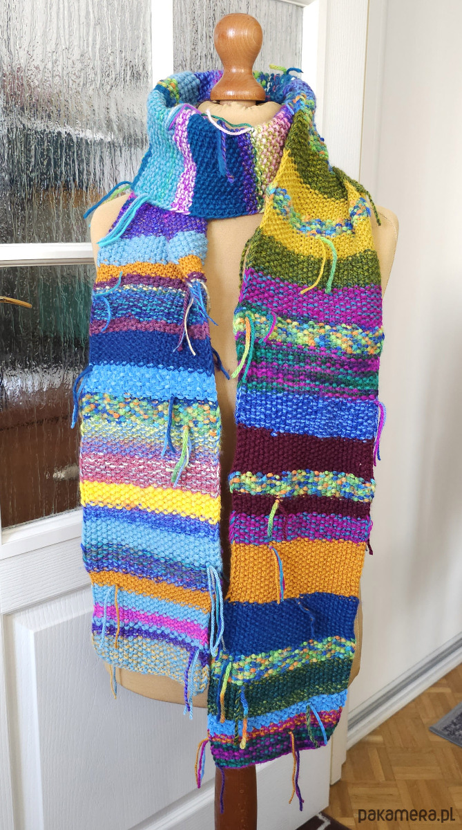 Ten wyjątkowy, długi szal został stworzony w duchu filozofii Zero Waste i upcyklingu. Powstał z miłości do planety i rękodzieła – każdy pas to cenne resztki włóczek (w różnych fakturach, odcieniach i grubościach), które zyskały drugie życie zamiast trafić do kosza.