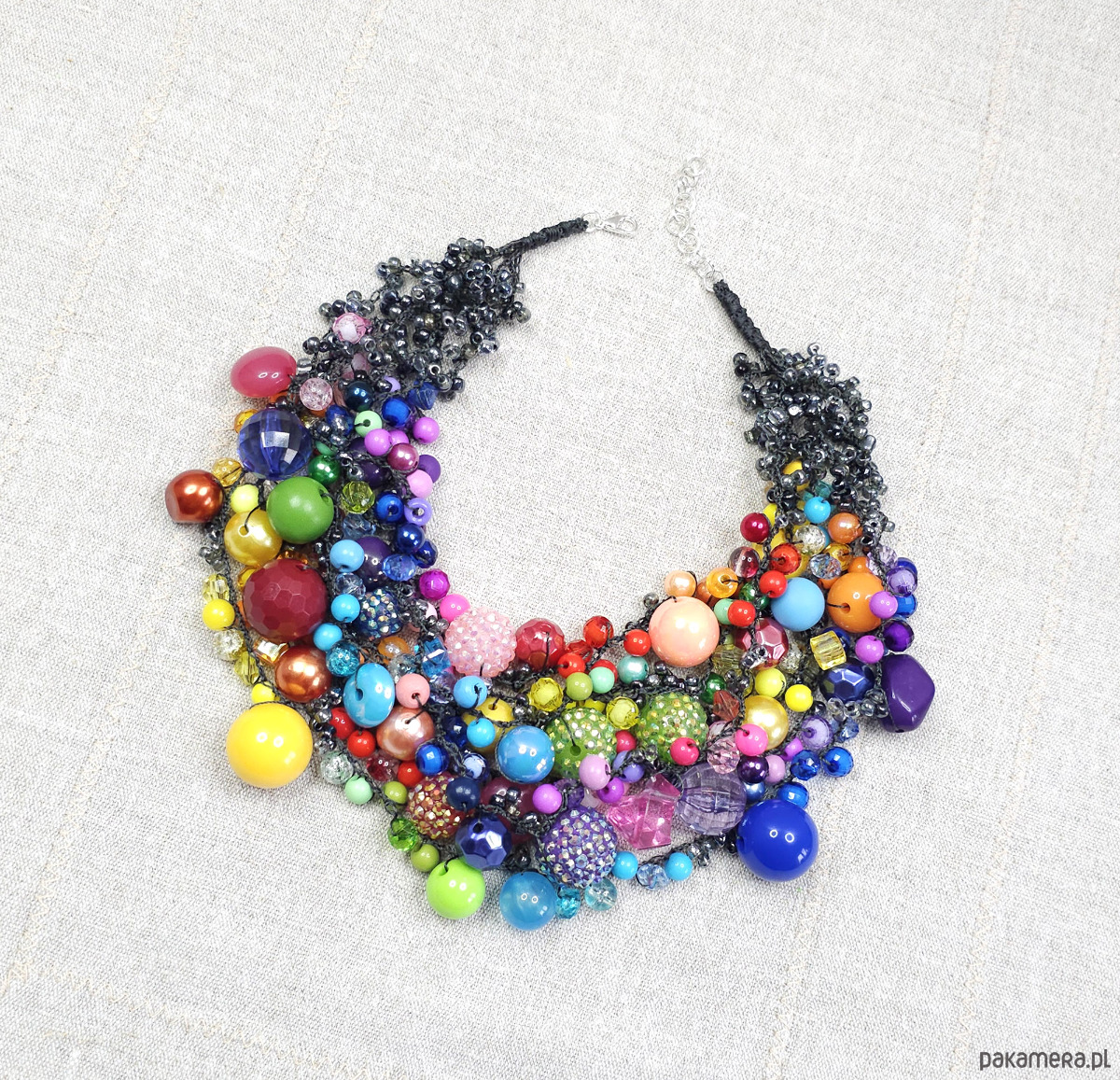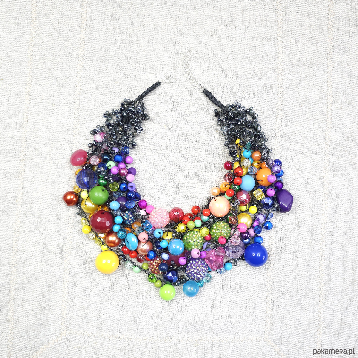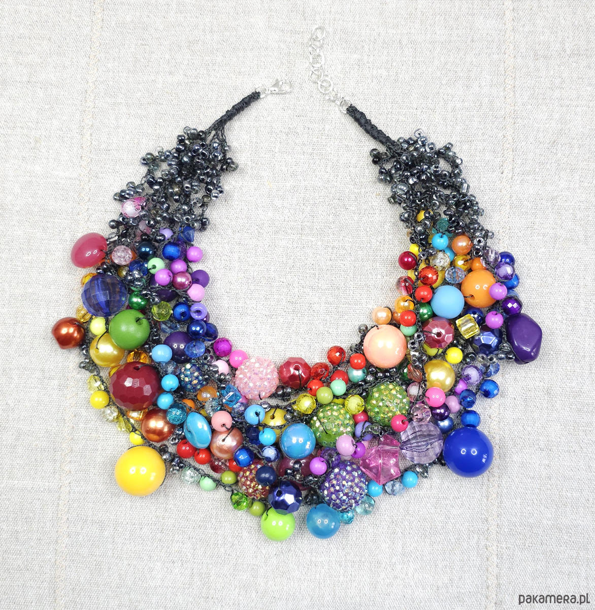 Dominują tu wszystkie kolory tęczy: soczysta czerwień, intensywny kobaltowy niebieski, energetyczna zieleń, radosna żółć i głęboki fiolet. Wszystkie te elementy są misternie wplecione w bazę z drobnych, grafitowych/czarnych koralików, które stanowią doskonałe tło dla eksplozji barw.