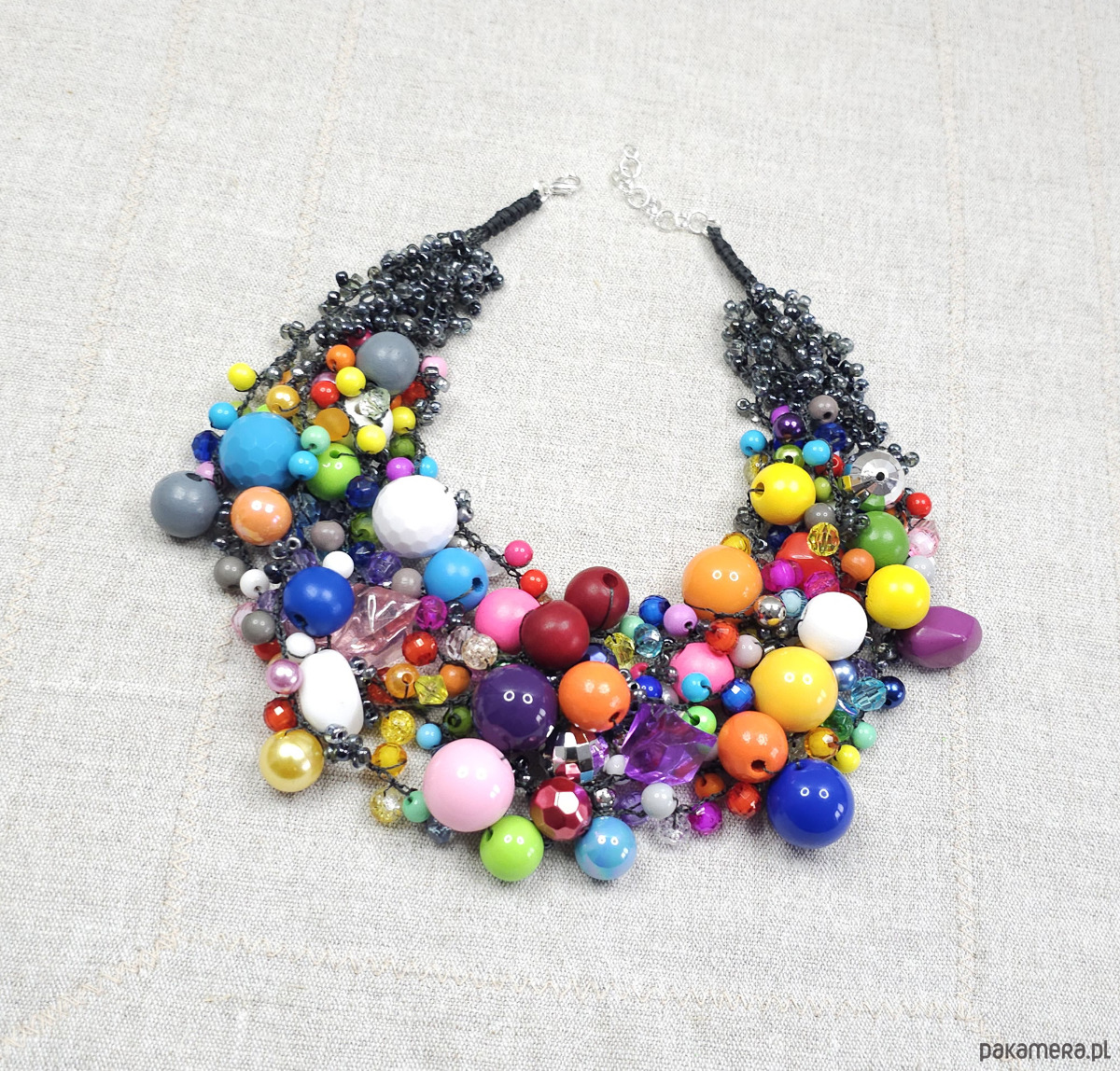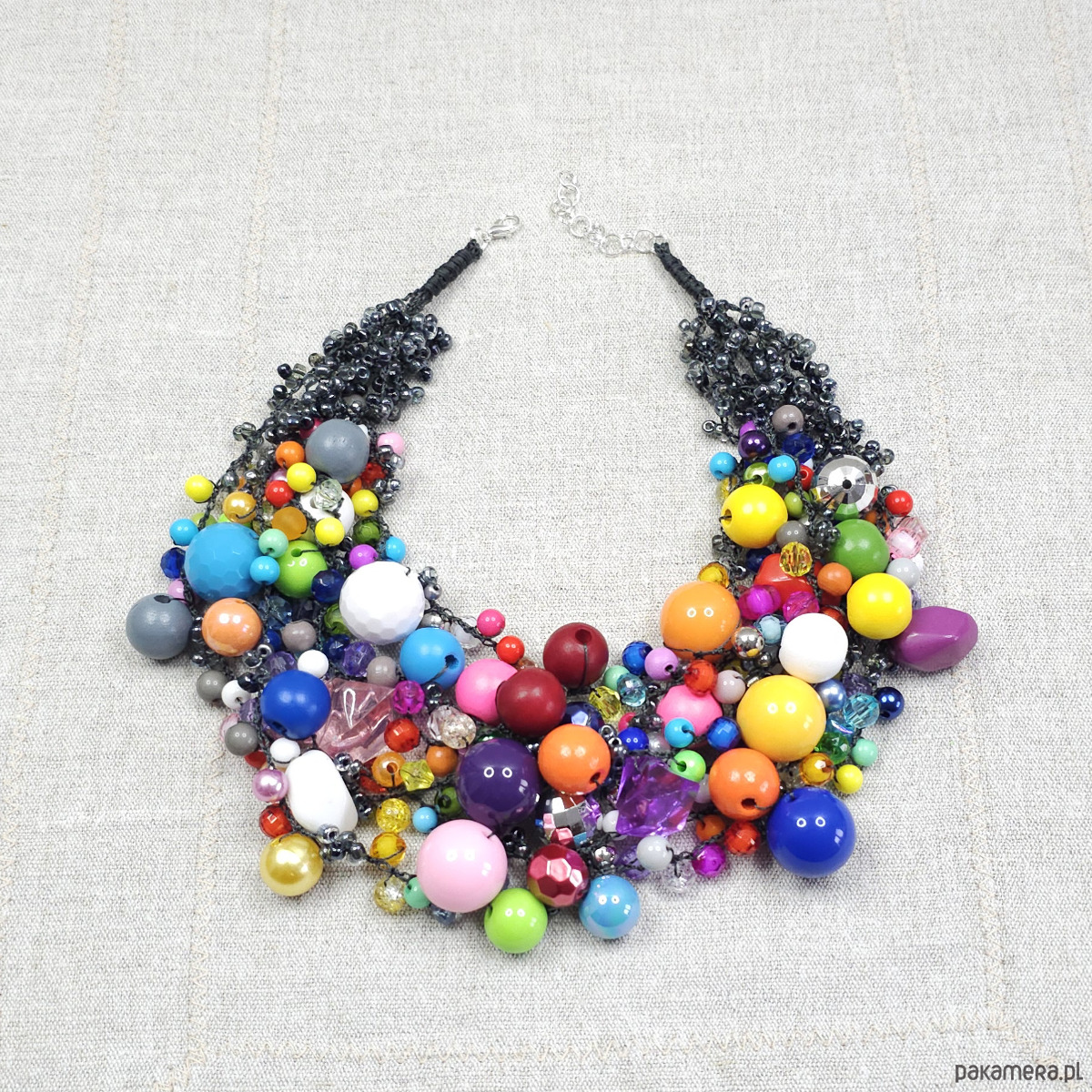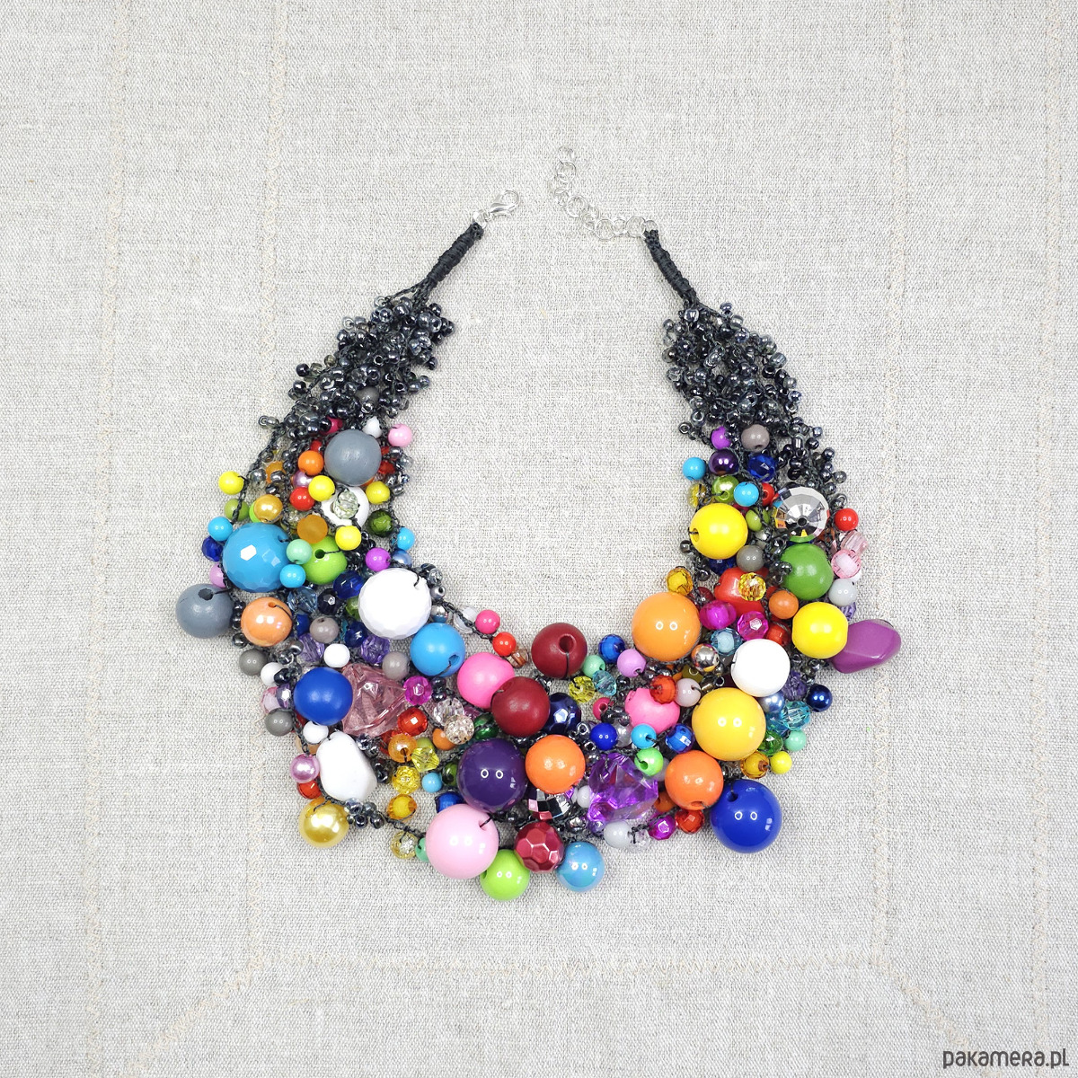 Dominują tu wszystkie kolory tęczy: soczysta czerwień, intensywny kobaltowy niebieski, energetyczna zieleń, radosna żółć i głęboki fiolet. Wszystkie te elementy są misternie wplecione w bazę z drobnych, grafitowych/czarnych koralików, które stanowią doskonałe tło dla eksplozji barw.