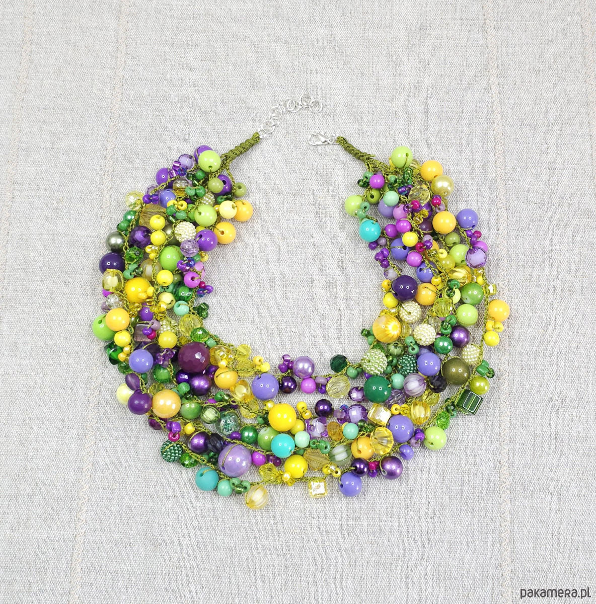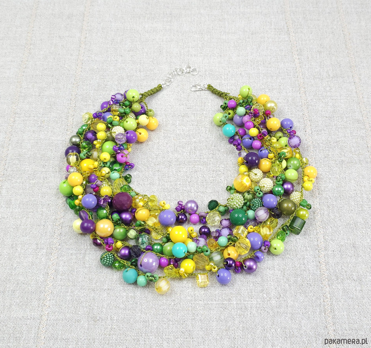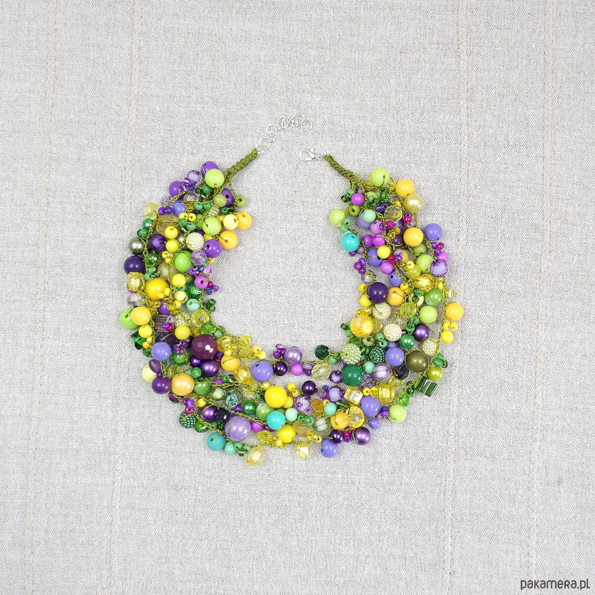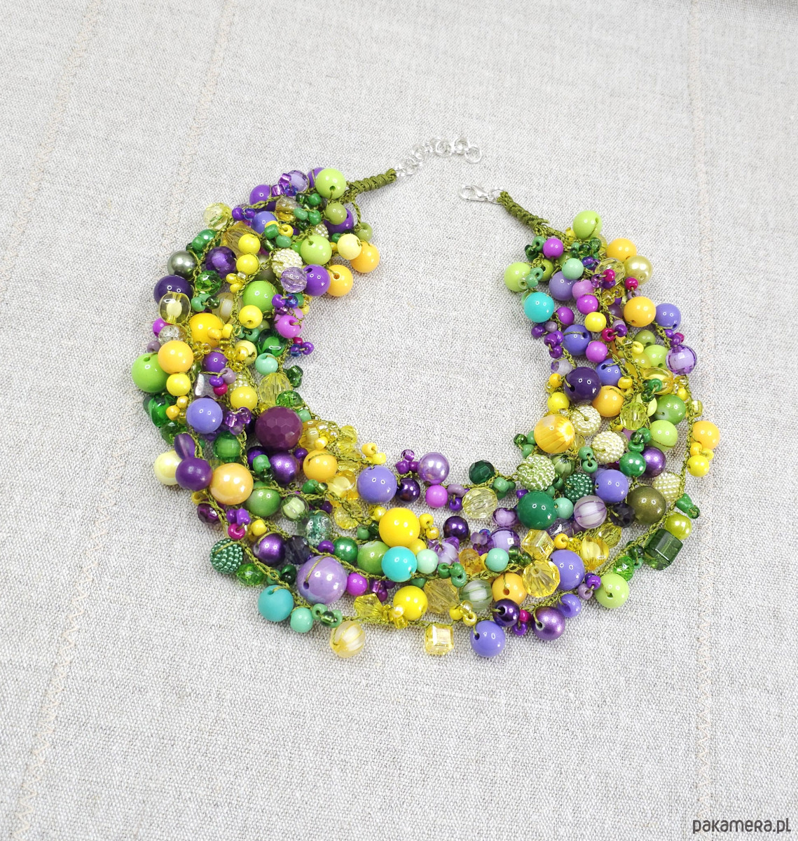 Ten biżuteryjny projekt to starannie skomponowana mieszanka koralików o różnych kształtach, wielkościach i fakturach. Dominujące odcienie energetycznej limonki, słonecznej żółci