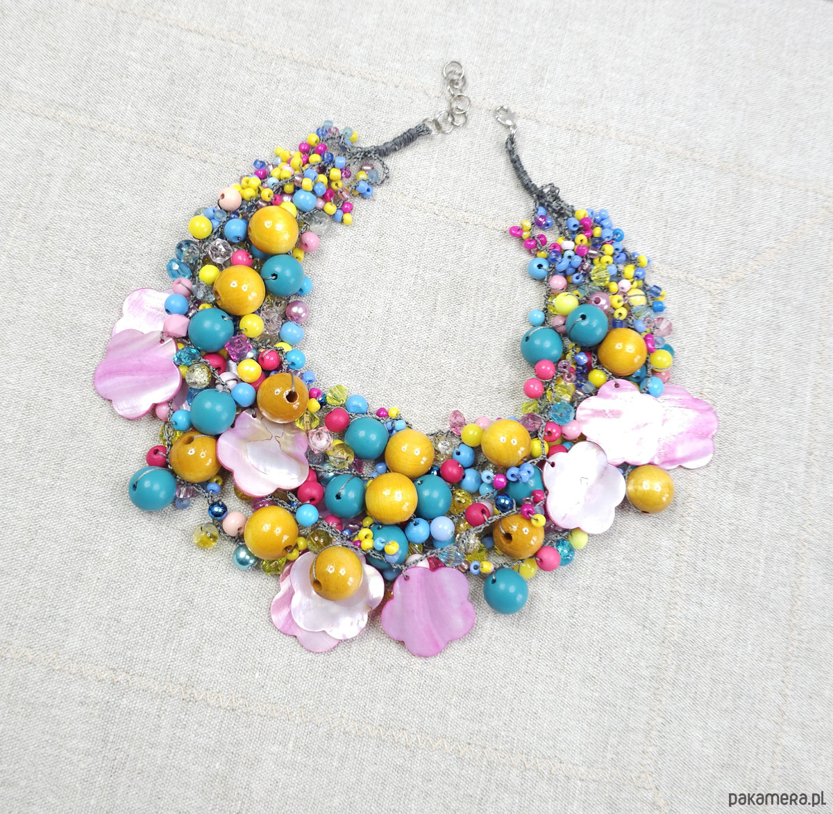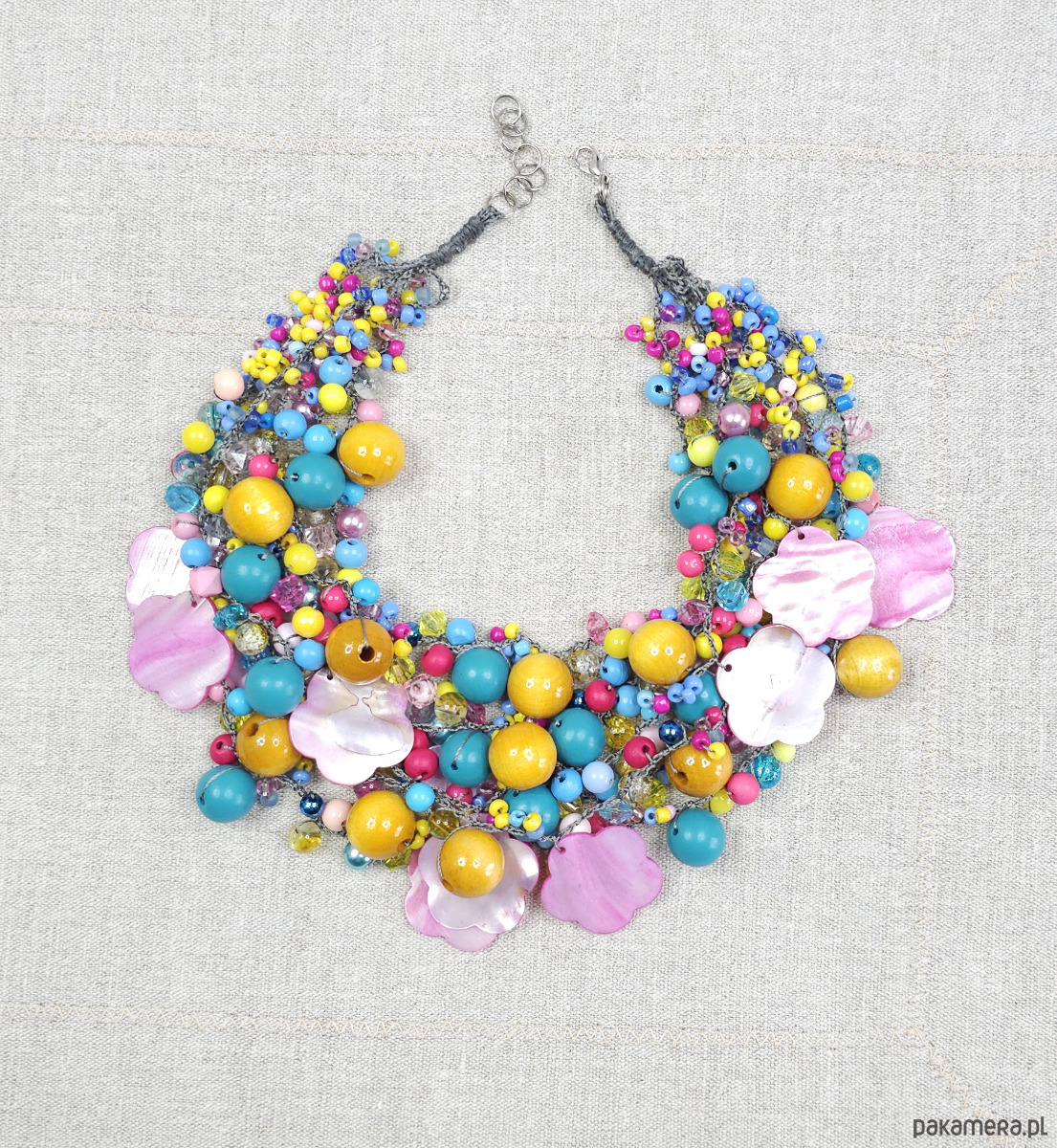 Bogata kompozycja żółtych i turkusowych koralików dopełniona różowymi kwiatami z masy perłowej.