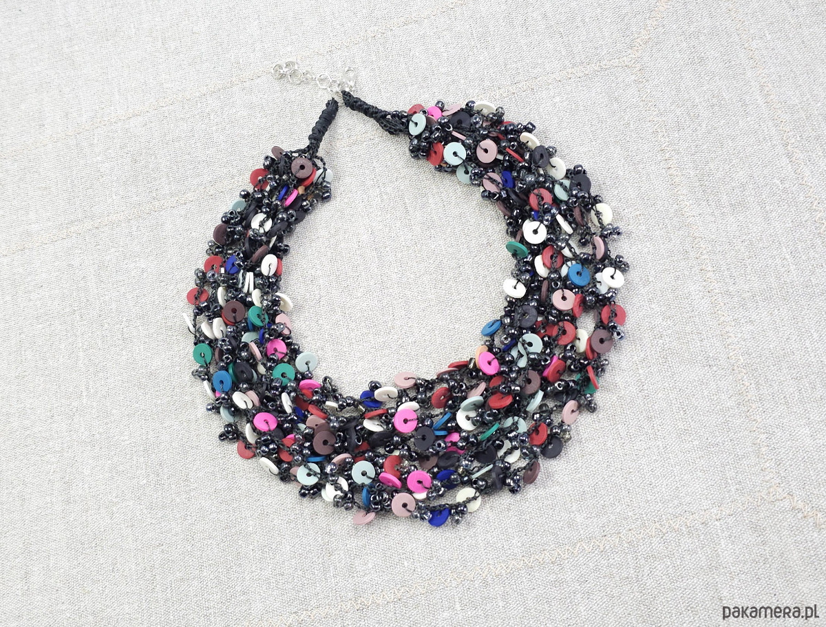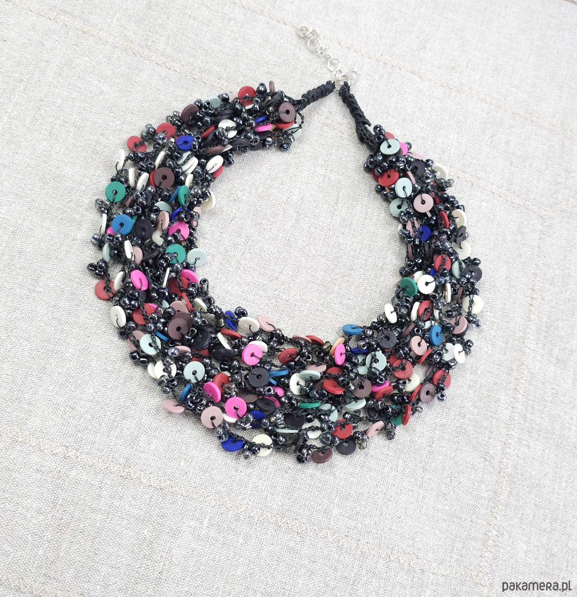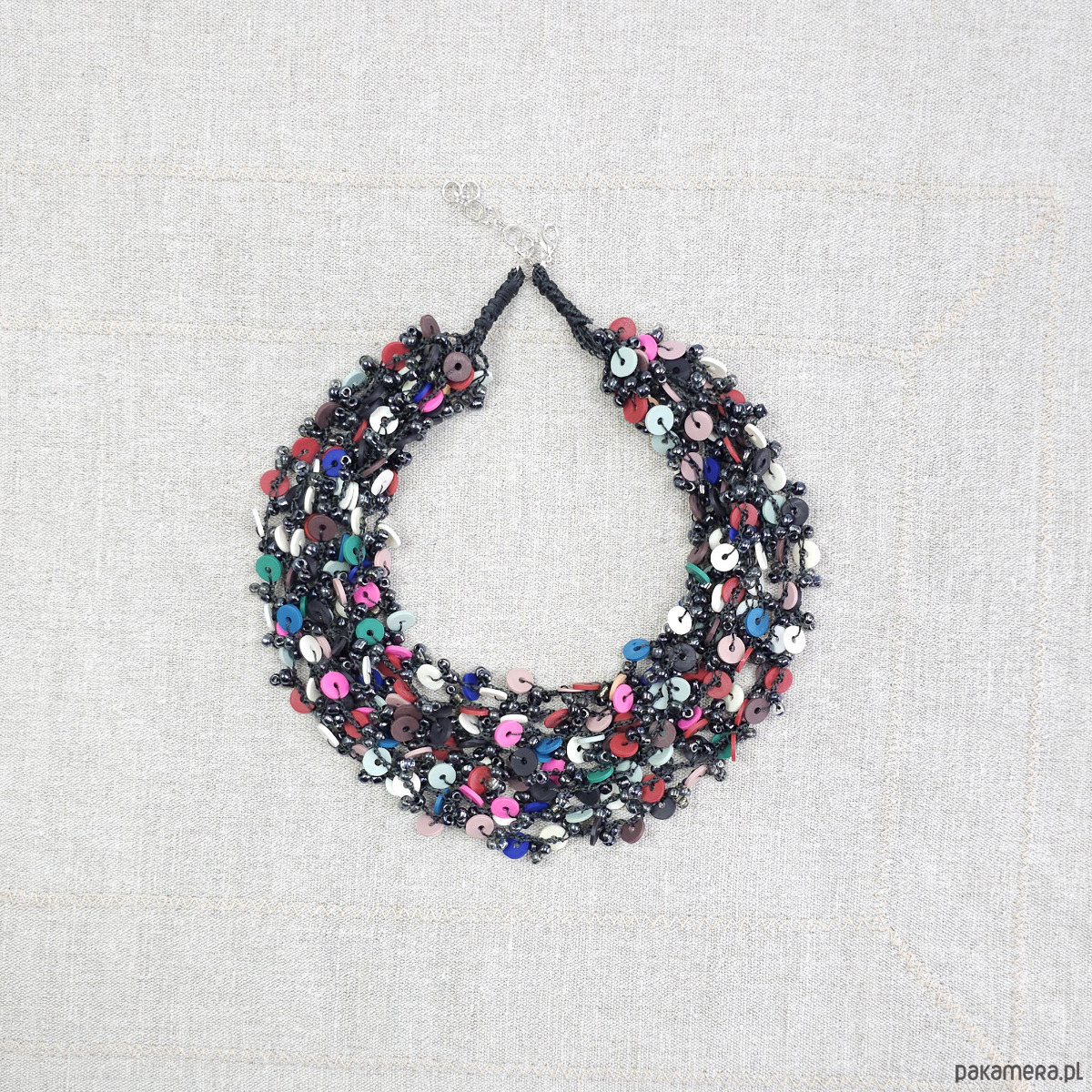 Ręcznie wykonany, bogaty naszyjnik o strukturze wielowarstwowej. Połączenie drobnych, ciemnych koralików szklanych z kolorowymi elementami z masy modelarskiej. Wyrazisty dodatek w stylu etno/boho, który ożywi każdą stylizację.