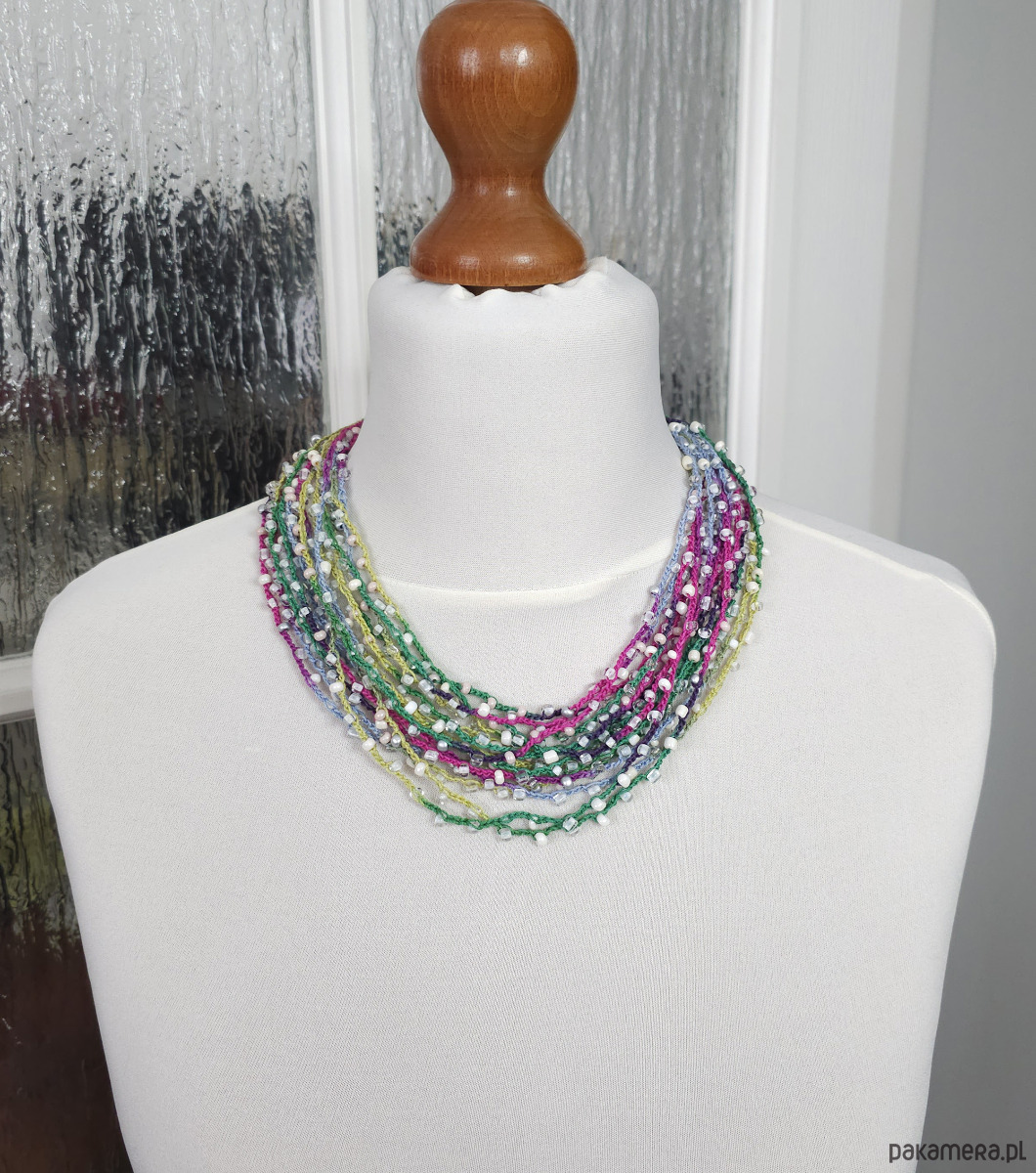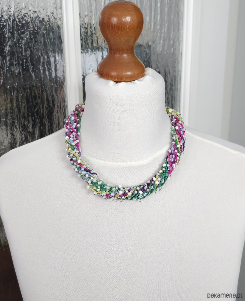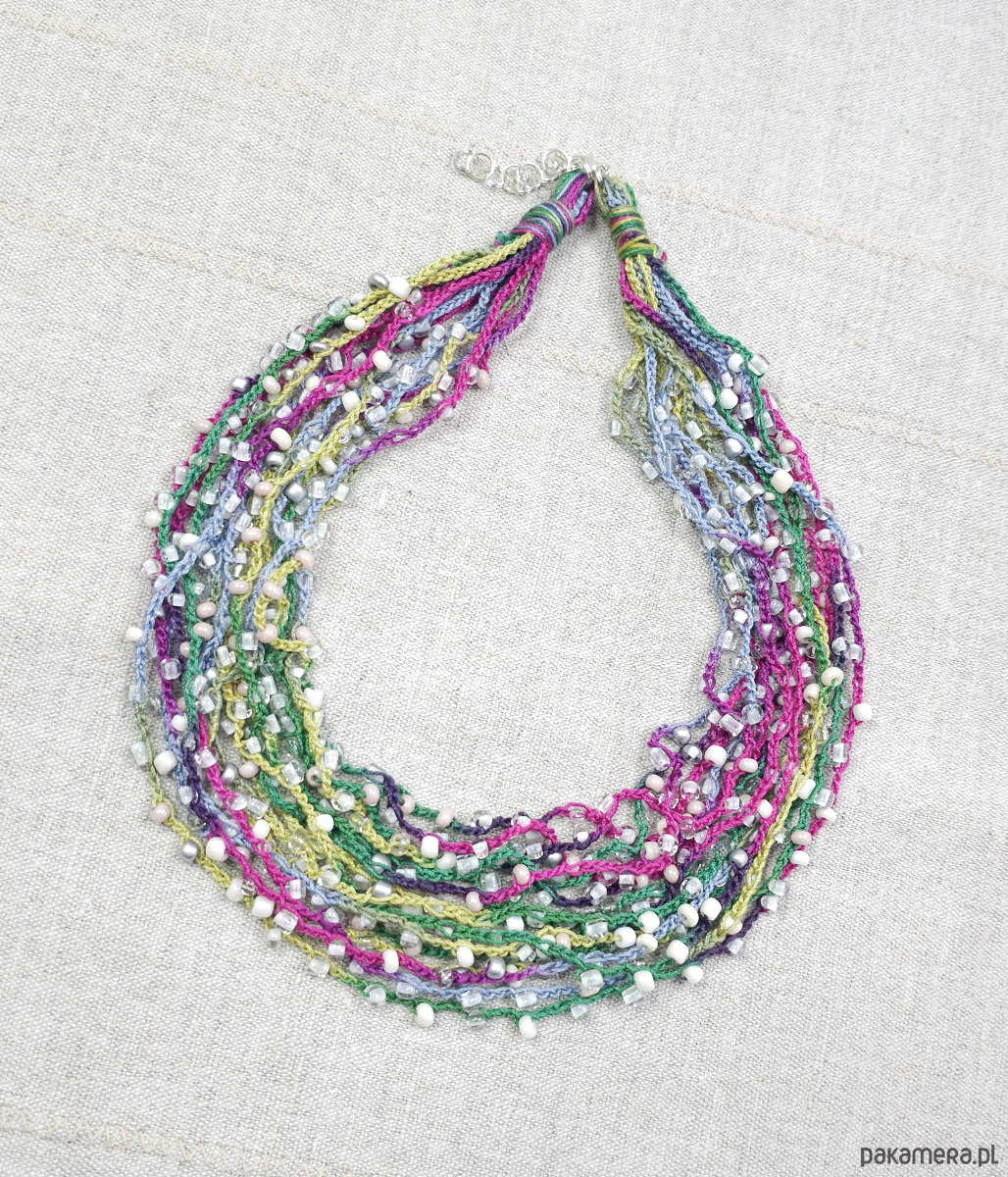 Lekki, kaskadowy naszyjnik wykonany z wielu rzędów bawełnianych nitek, na które misternie nawleczono drobne szklane koraliki. Całość tworzy subtelną, barwną strukturę o artystycznym wyrazie.