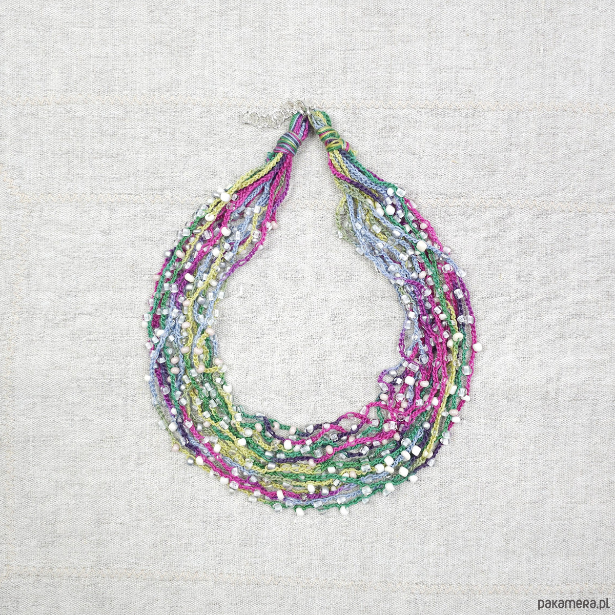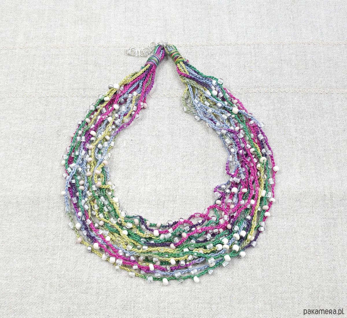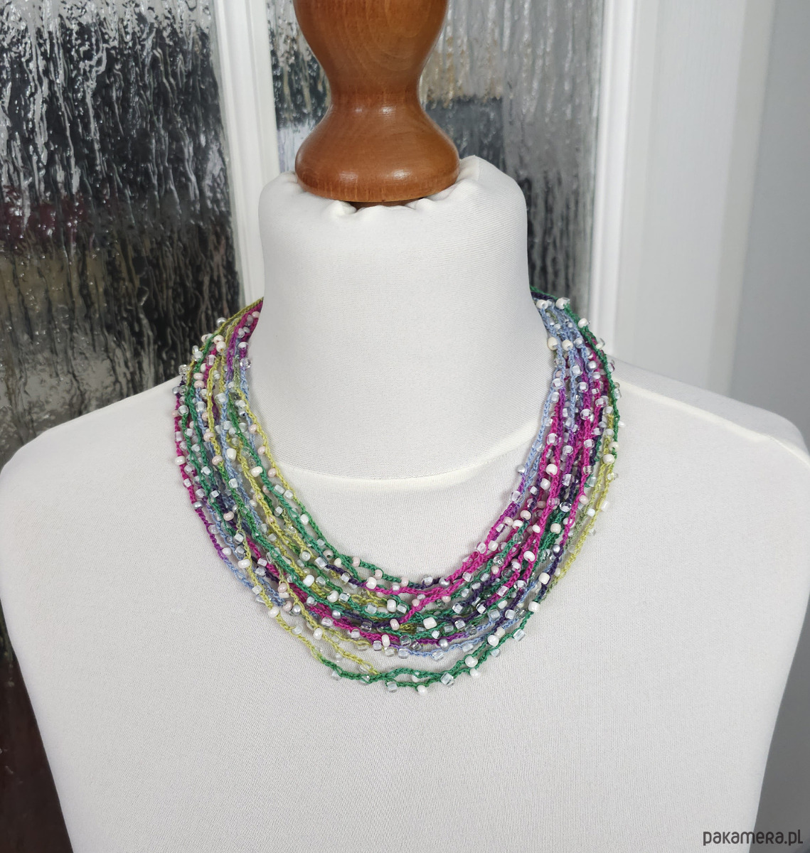 Lekki, kaskadowy naszyjnik wykonany z wielu rzędów bawełnianych nitek, na które misternie nawleczono drobne szklane koraliki. Całość tworzy subtelną, barwną strukturę o artystycznym wyrazie.