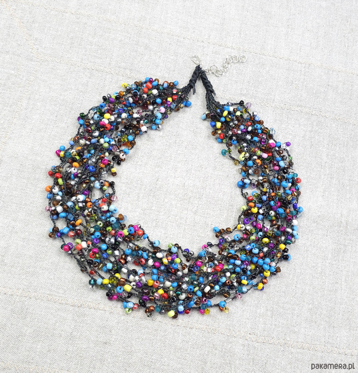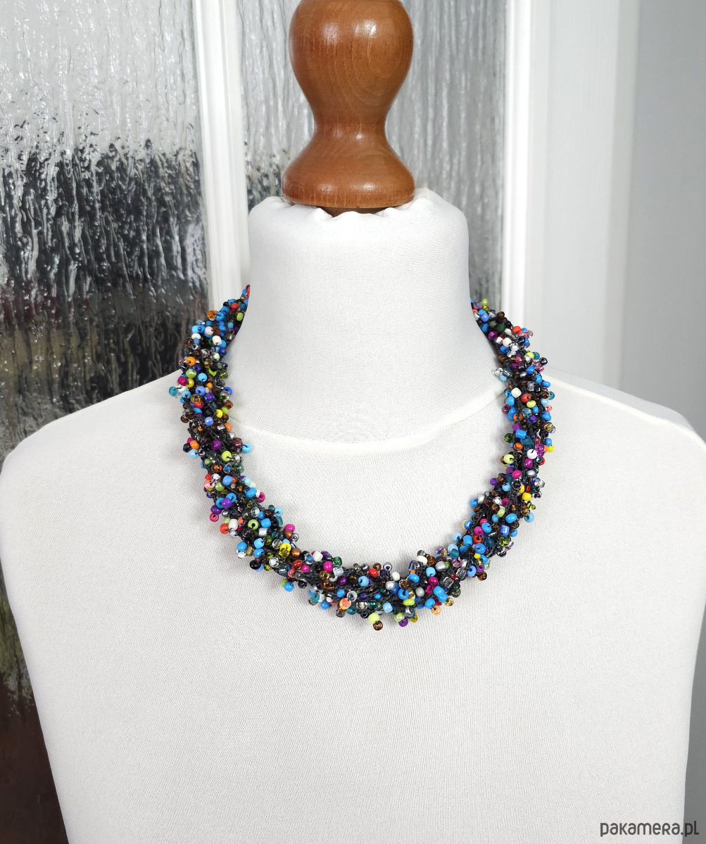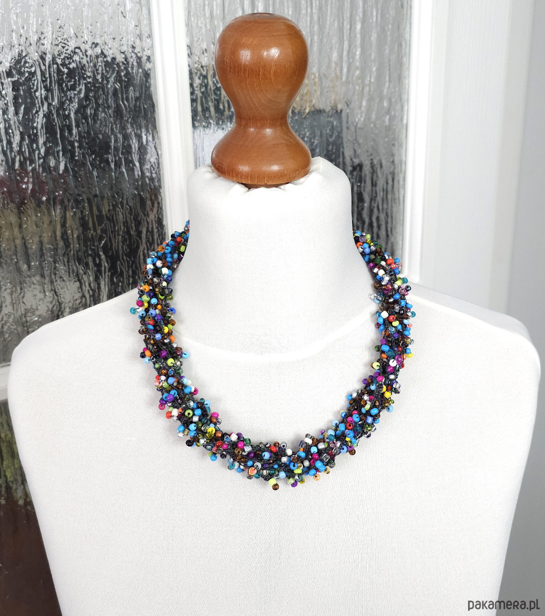 Ten wyjątkowy naszyjnik został wykonany ręcznie z setek drobnych, szklanych koralików w niemal każdym kolorze tęczy.