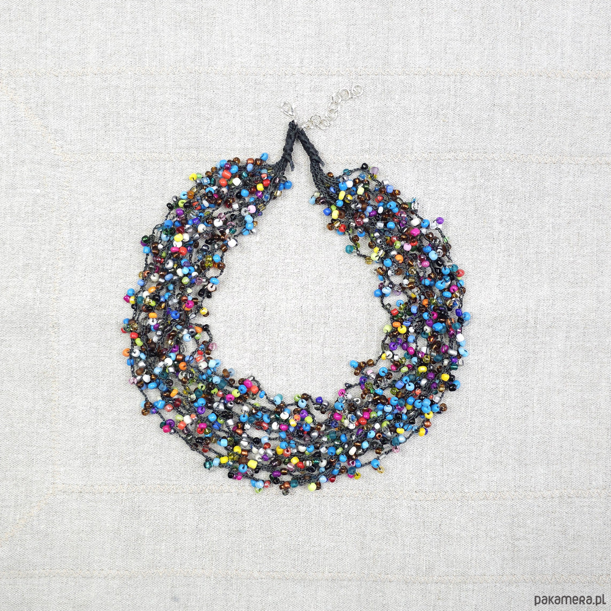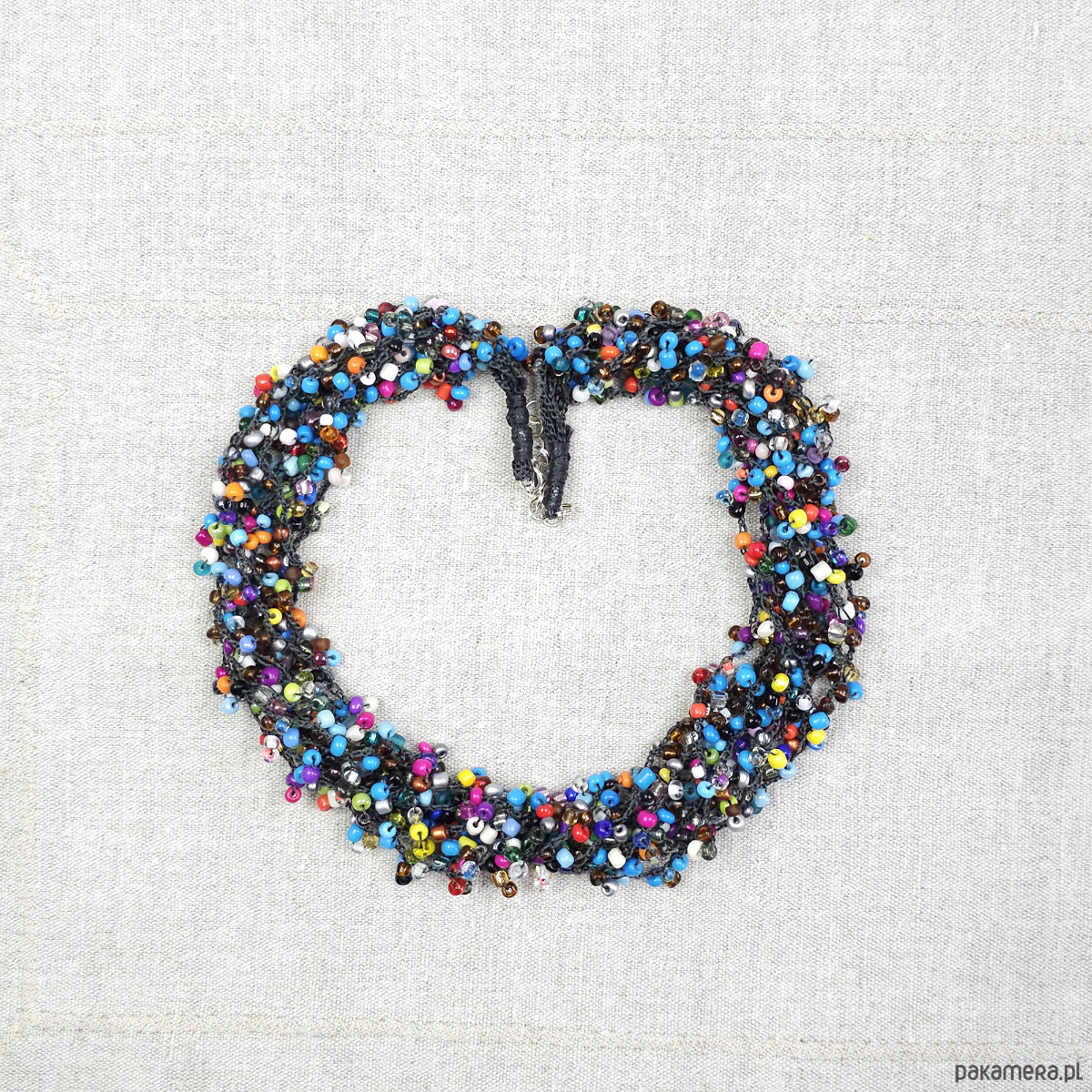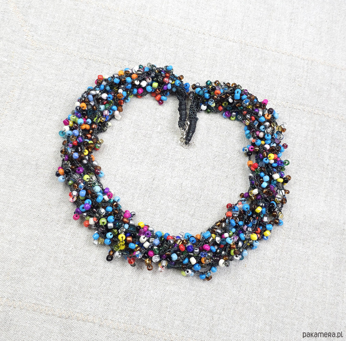 Ten wyjątkowy naszyjnik został wykonany ręcznie z setek drobnych, szklanych koralików w niemal każdym kolorze tęczy.