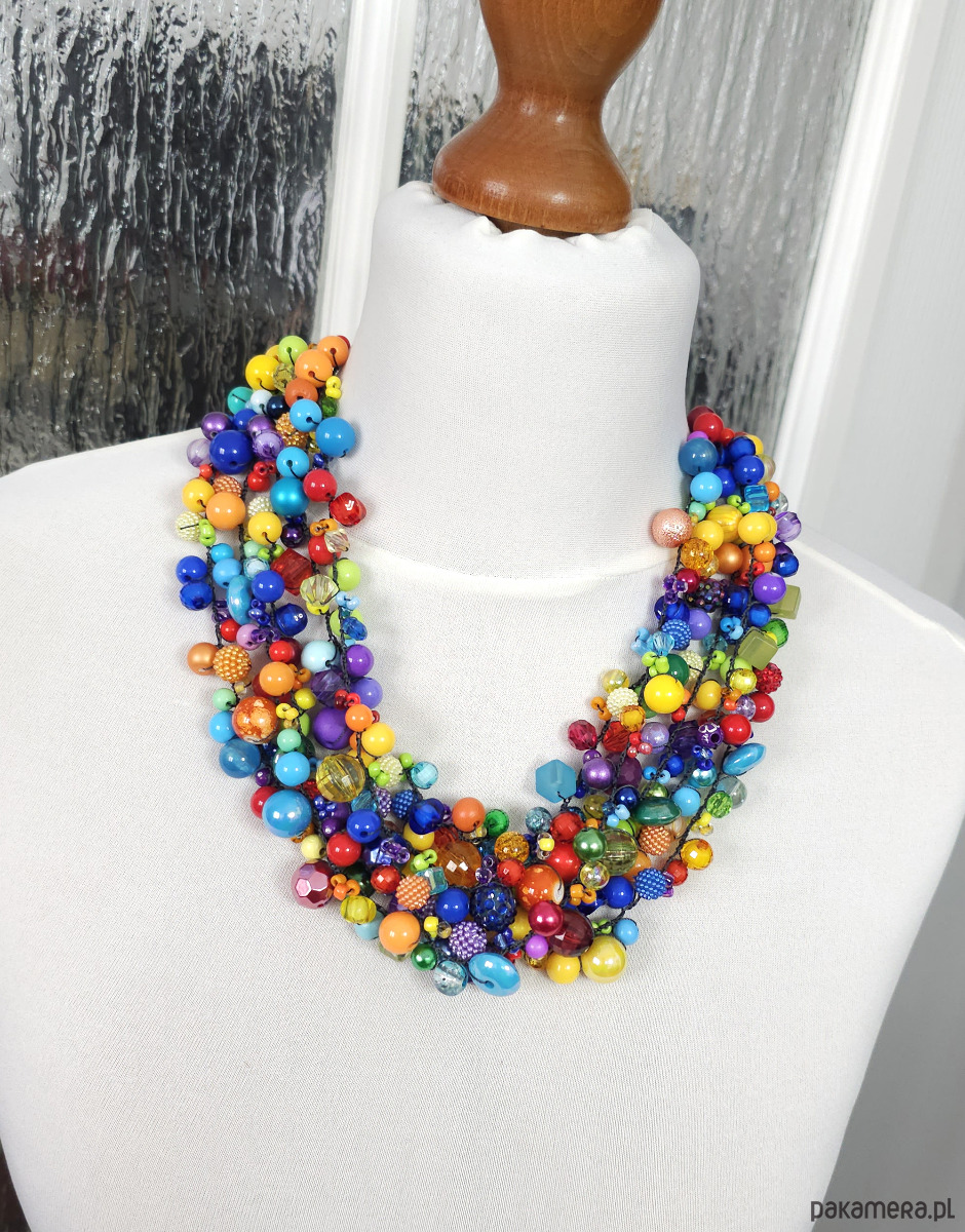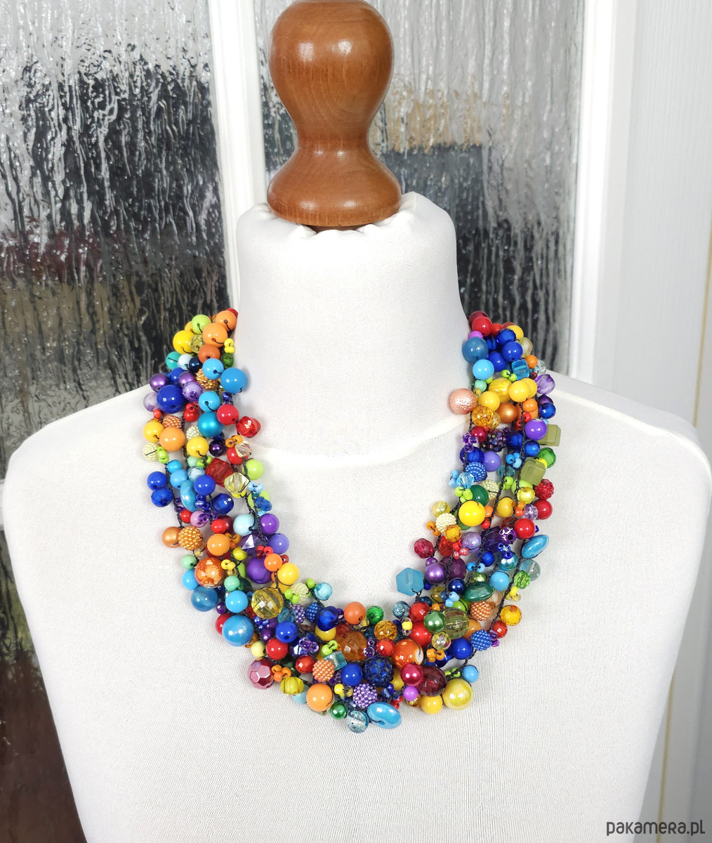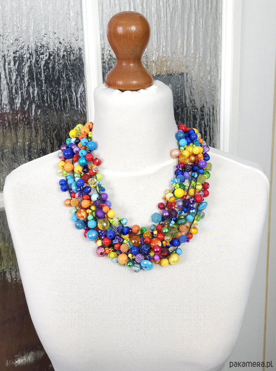 Bogaty naszyjnik wykonany z mieszanki koralików w pełnej palecie barw.