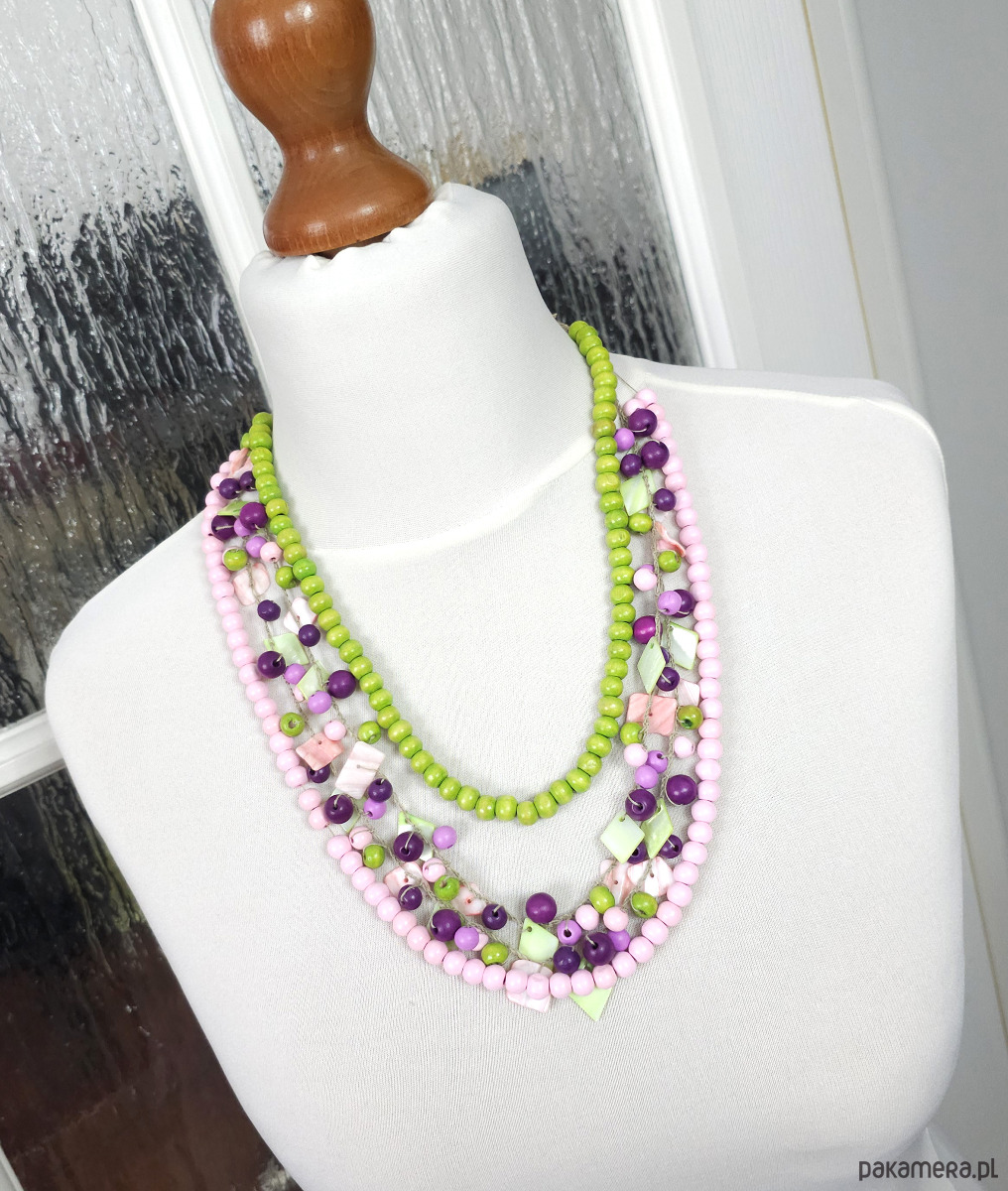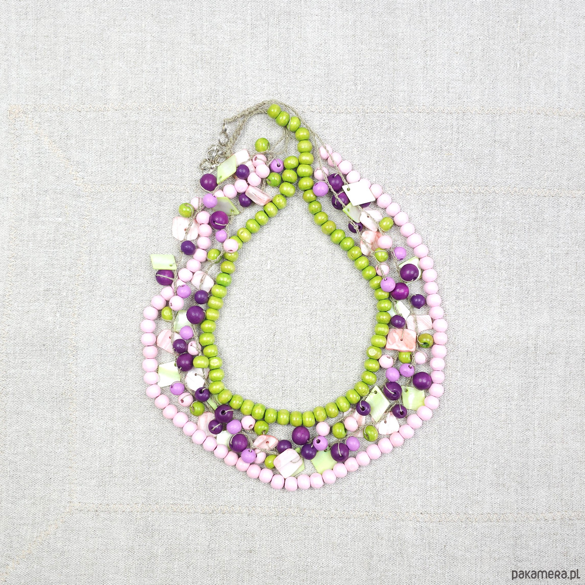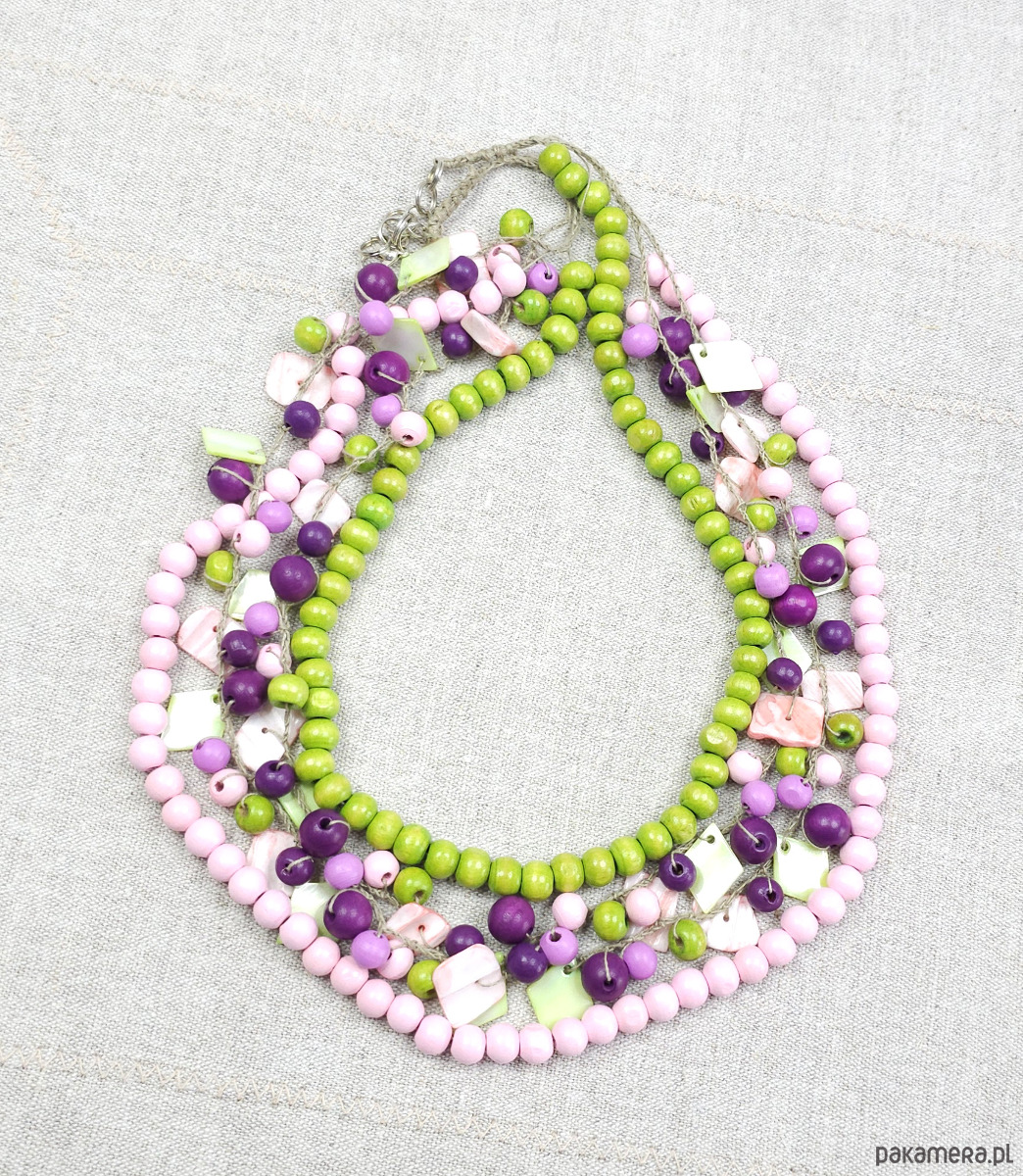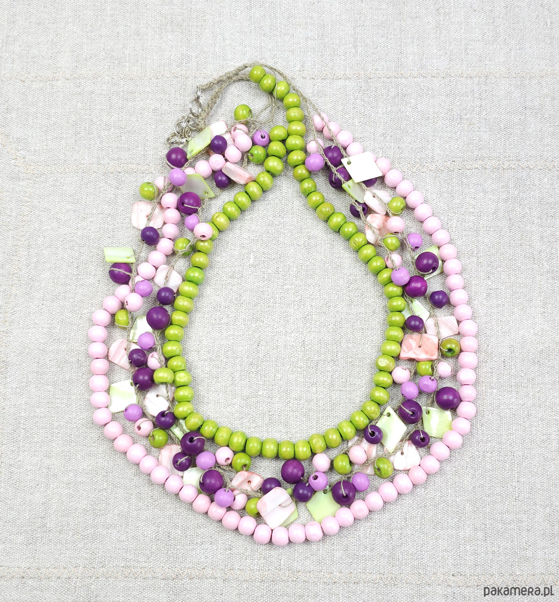 Wielowarstwowy naszyjnik wykonany z naturalnych materiałów: barwionego drewna, muszli oraz masy perłowej.