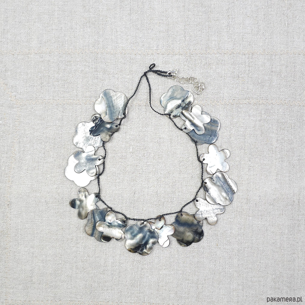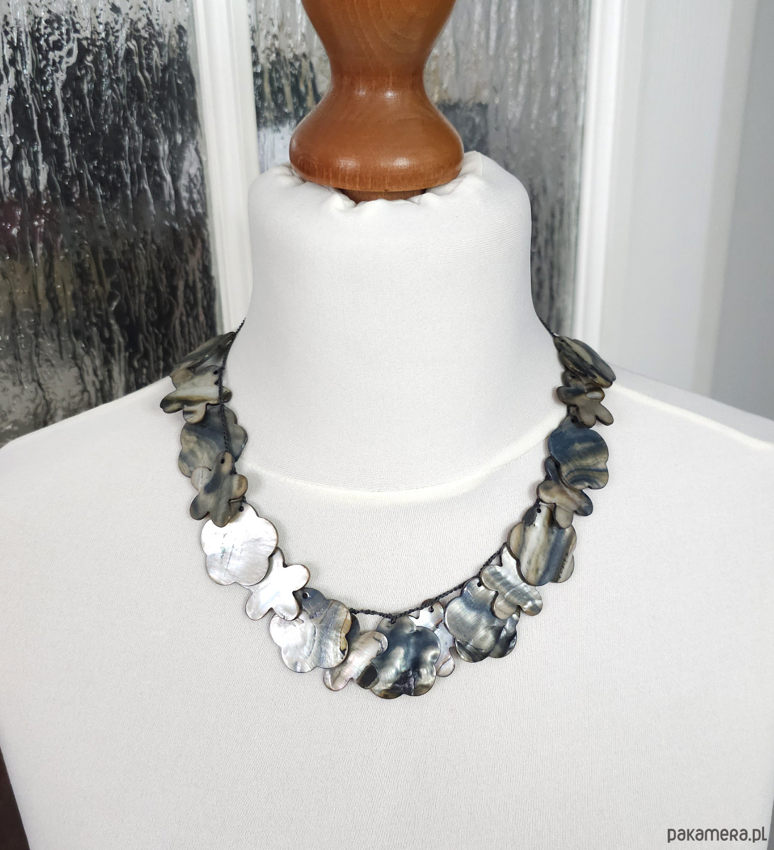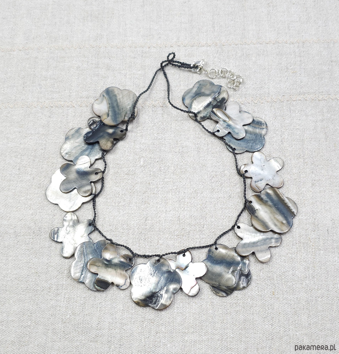 Krótki naszyjnik wykonany z elementów z naturalnej masy perłowej w kształcie kwiatów.