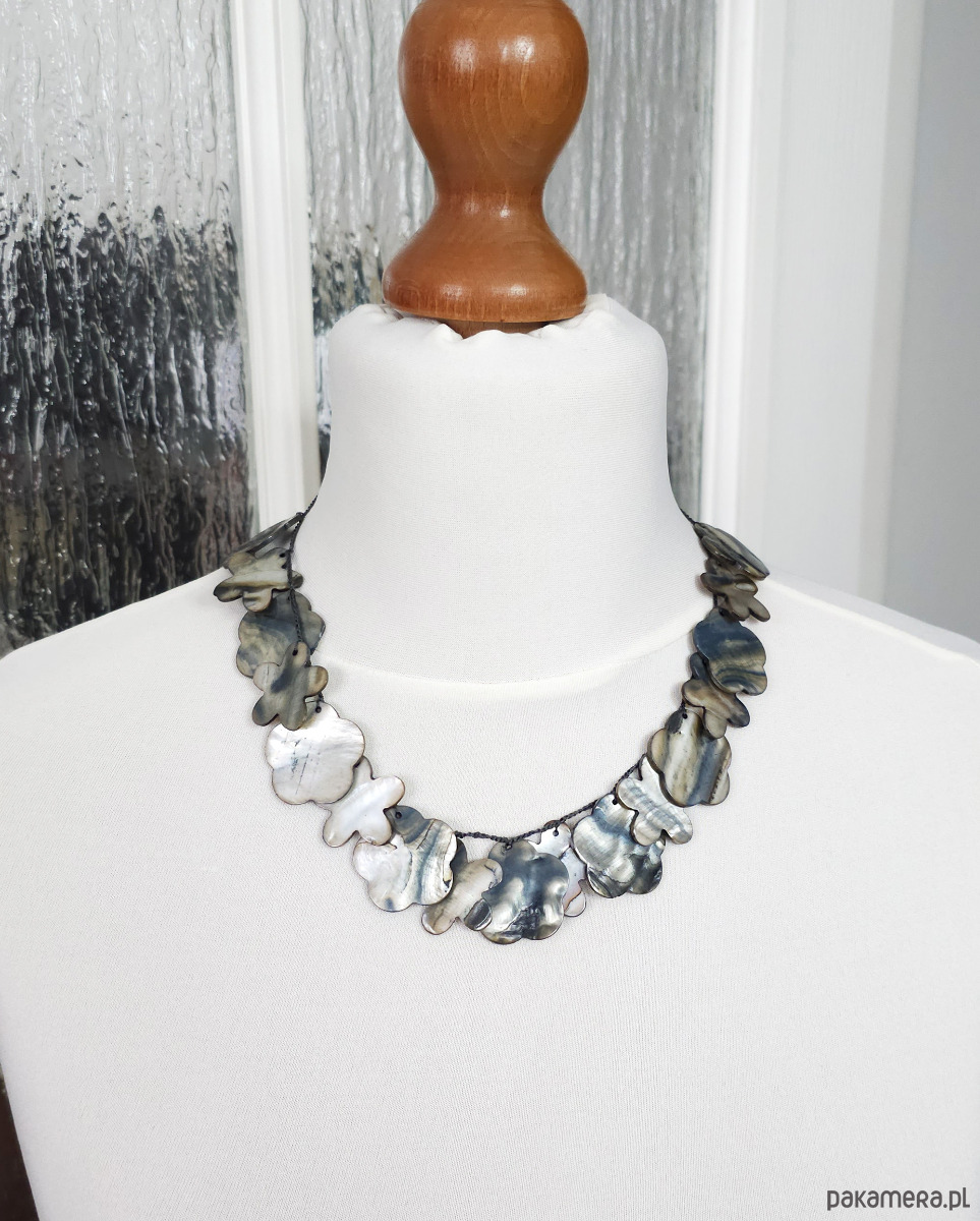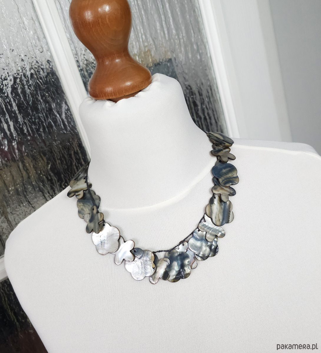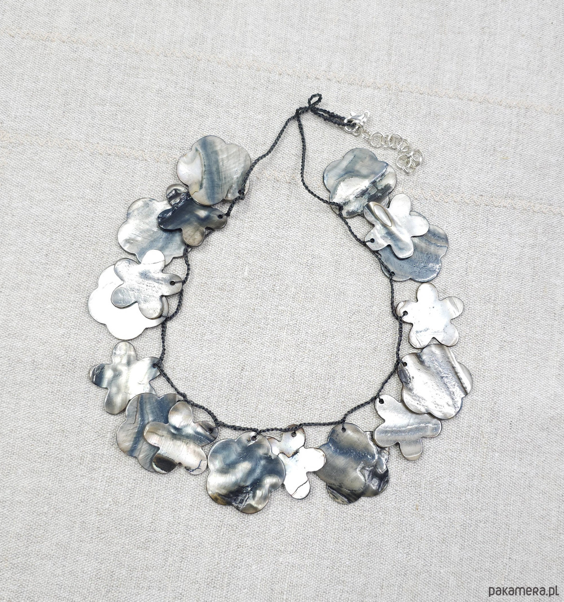 Krótki naszyjnik wykonany z elementów z naturalnej masy perłowej w kształcie kwiatów.