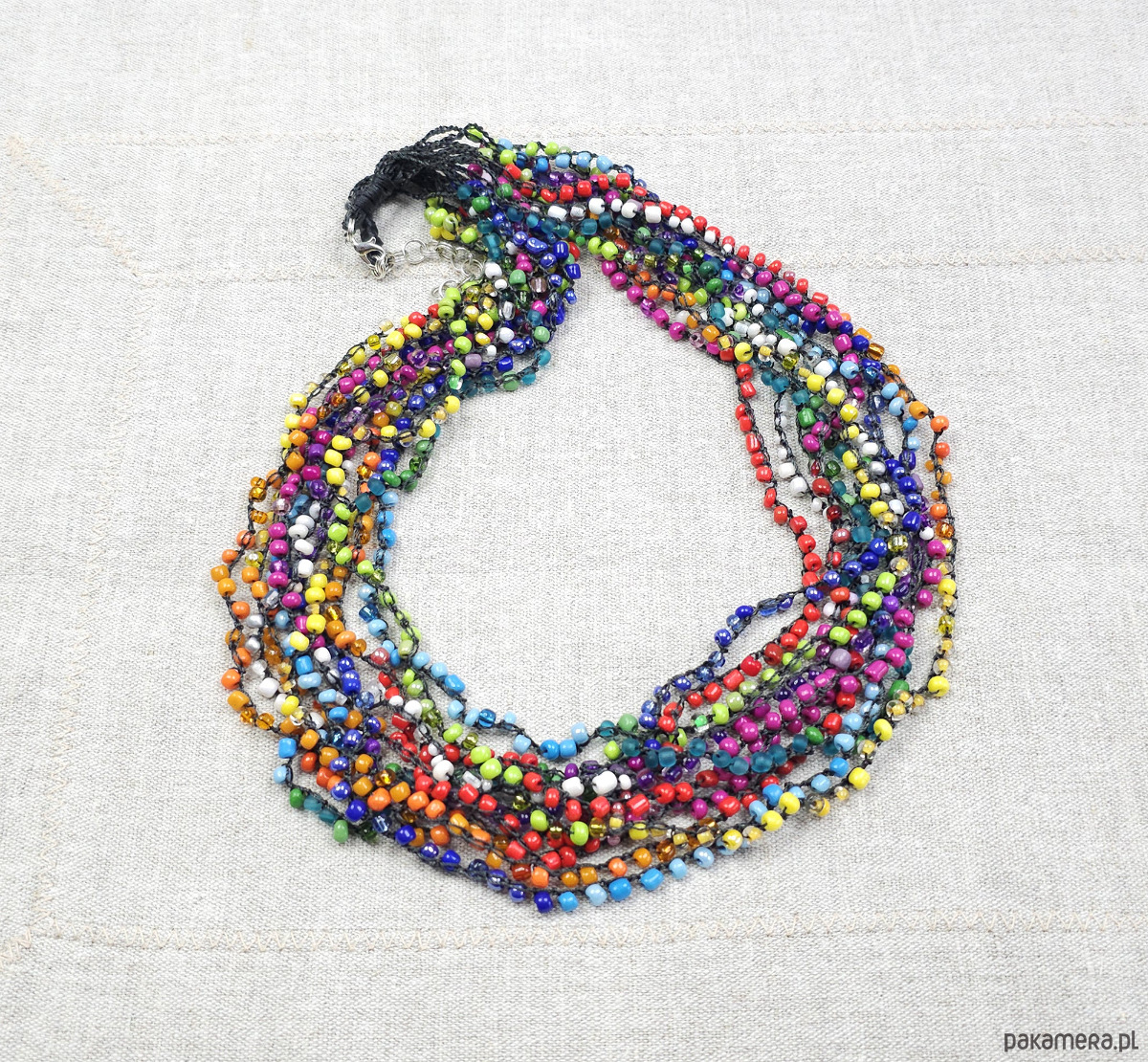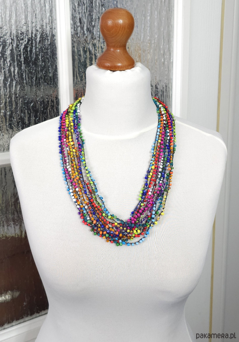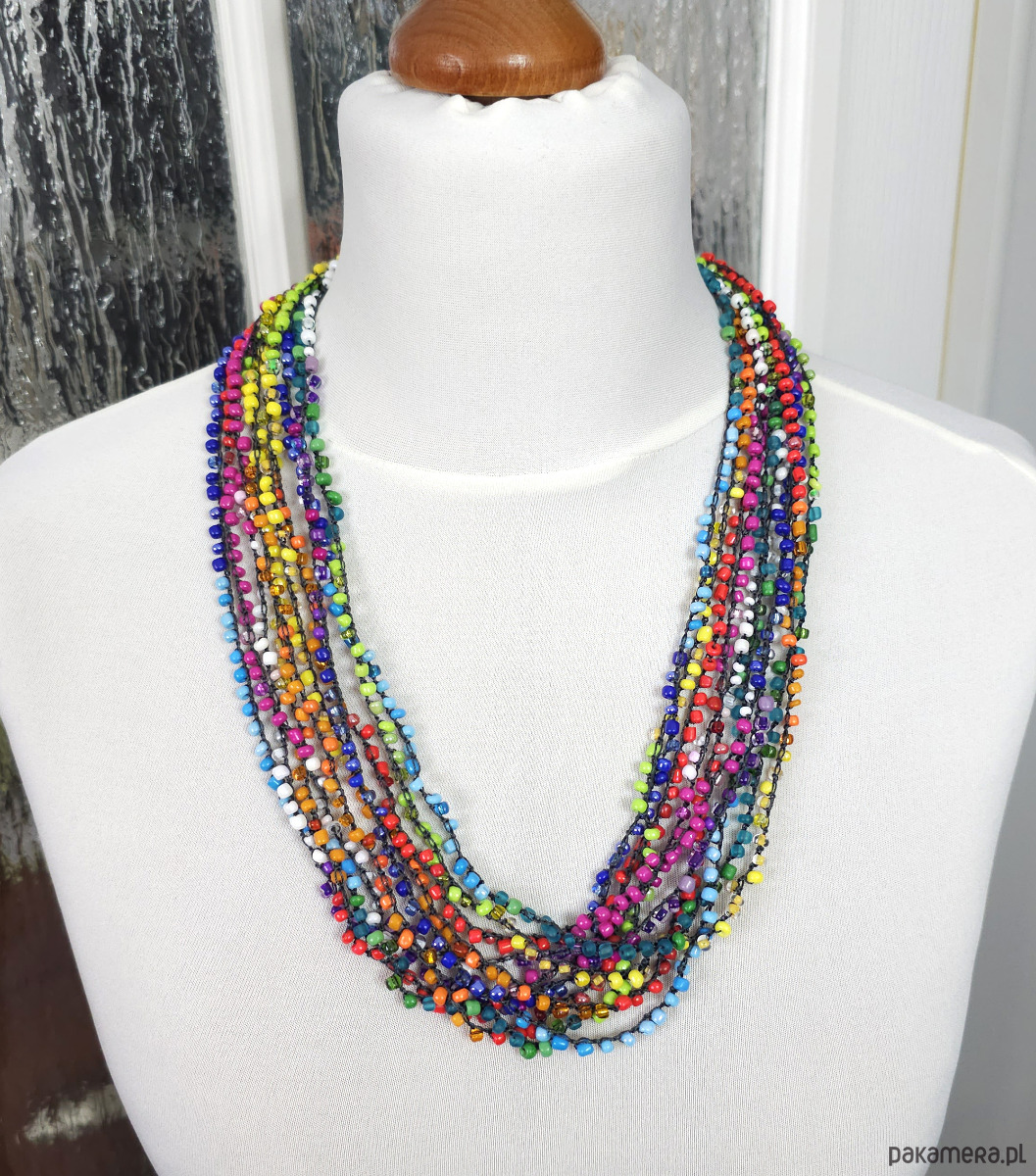 Ręcznie wykonany naszyjnik kaskadowy stworzony techniką szydełkową. Składa się z 10 splecionych sznurów drobnych, wielokolorowych koralików szklanych.