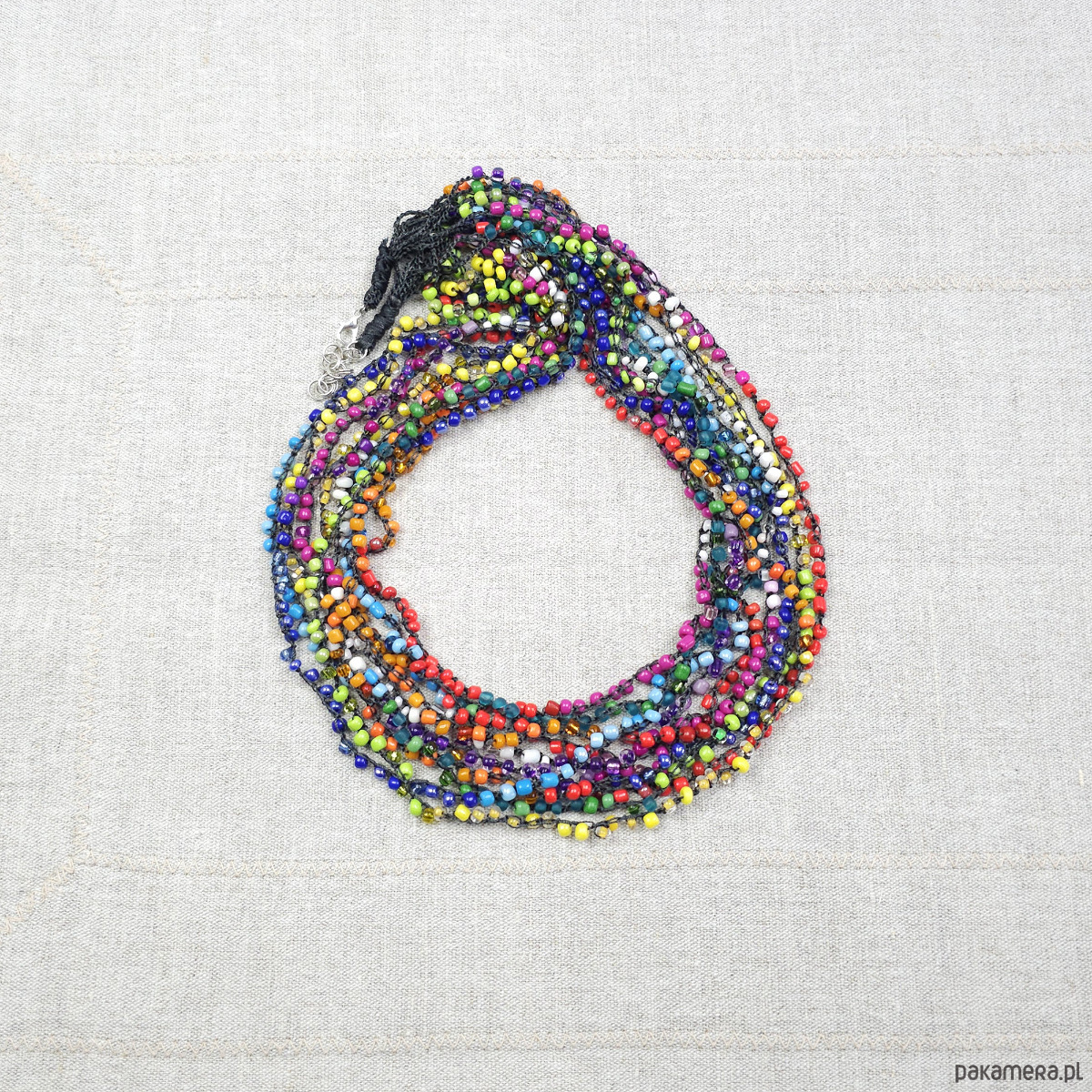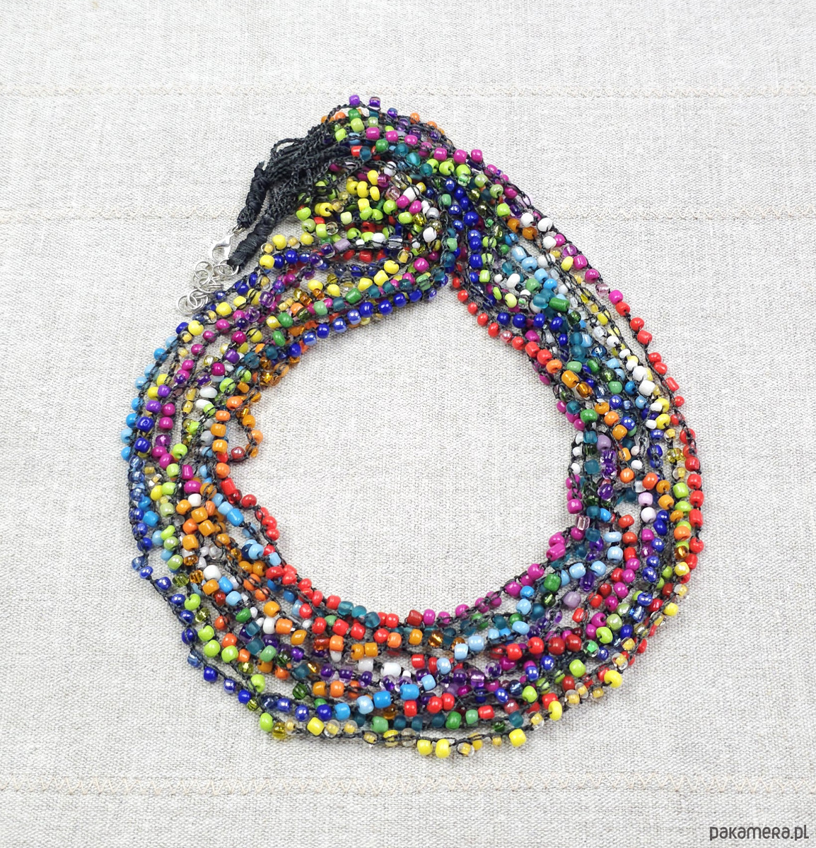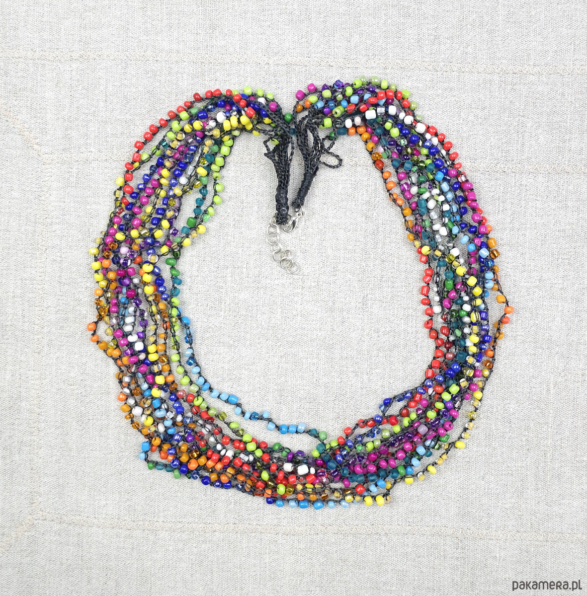 Ręcznie wykonany naszyjnik kaskadowy stworzony techniką szydełkową. Składa się z 10 splecionych sznurów drobnych, wielokolorowych koralików szklanych.