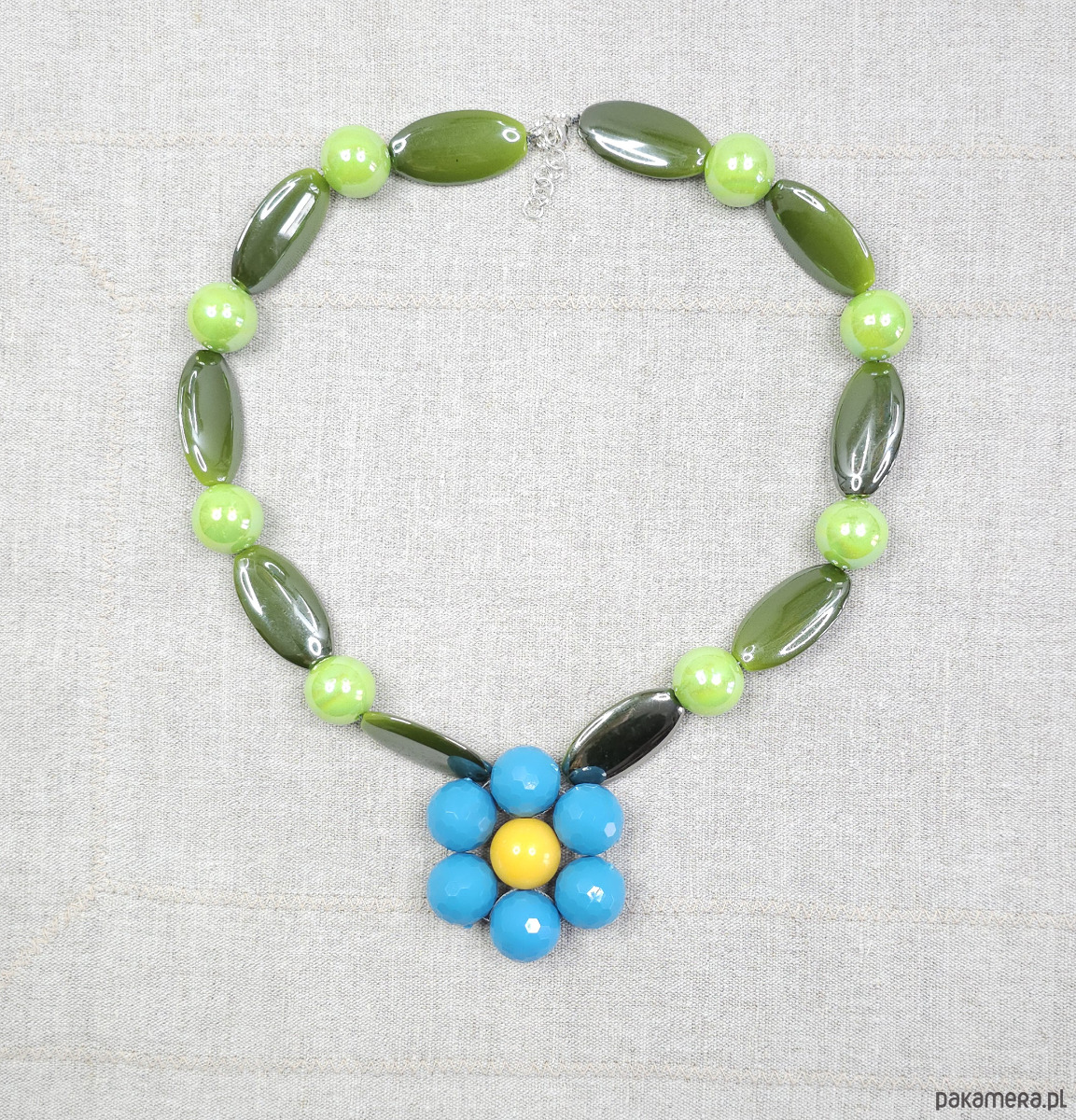 Sznur naszyjnika składa się z gładkich, oliwkowych koralików o migdałowym kształcie oraz limonkowych, lśniących perełek, które pięknie odbijają światło.