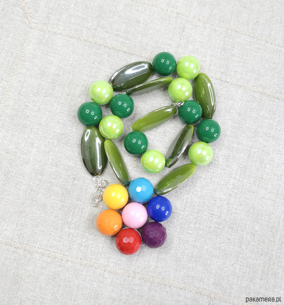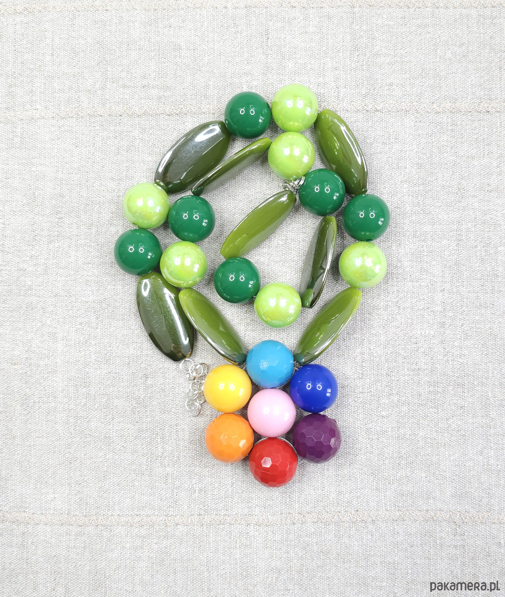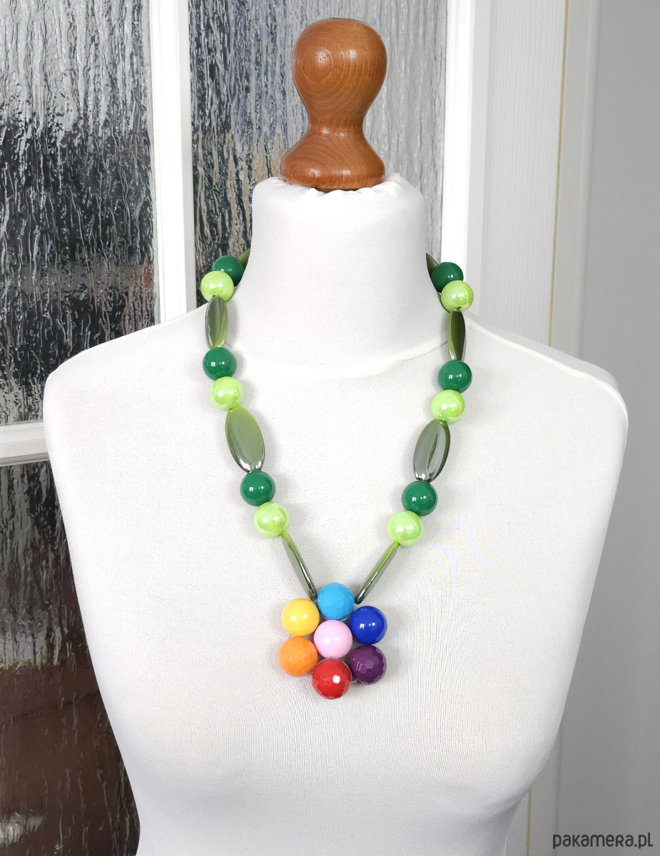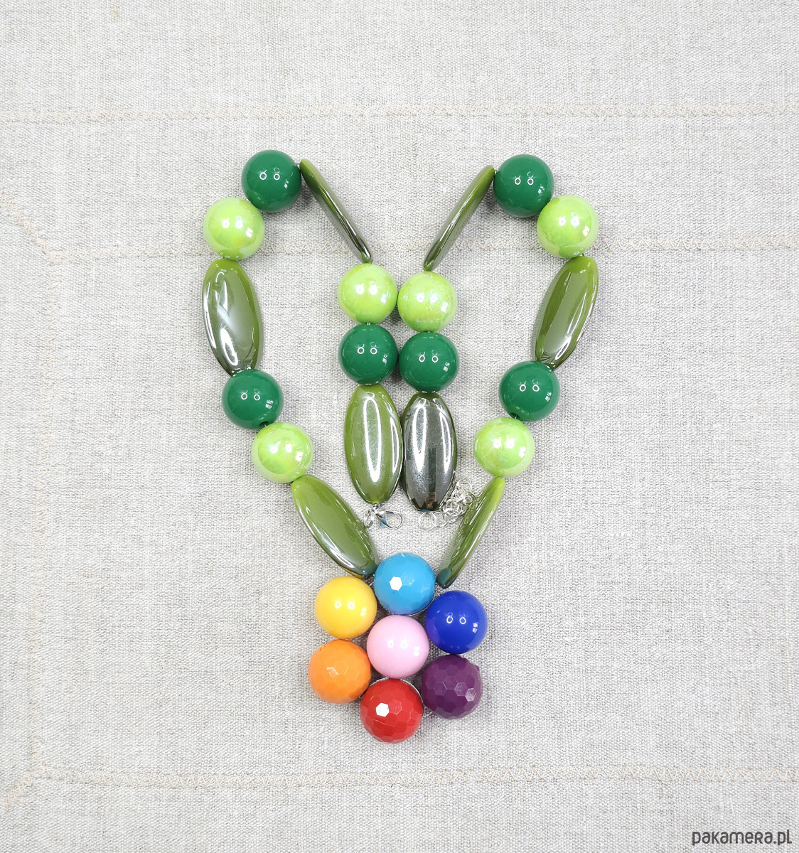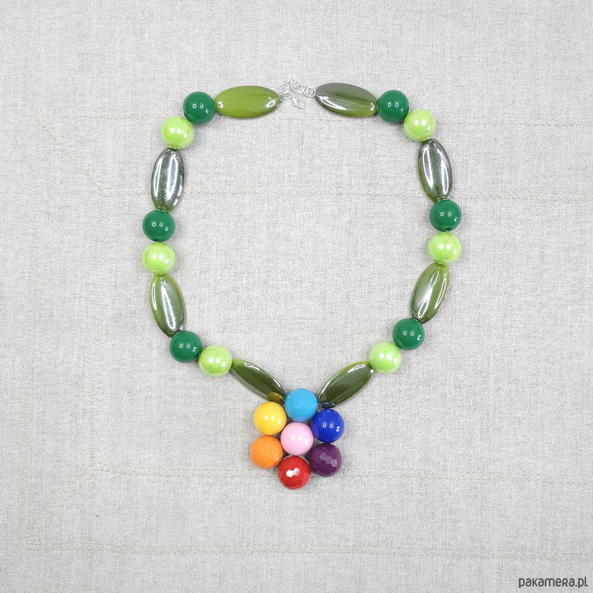 Naszyjnik prezentuje się niezwykle efektownie dzięki kontrastowi soczystej zieleni z wielobarwnym kwiatem.