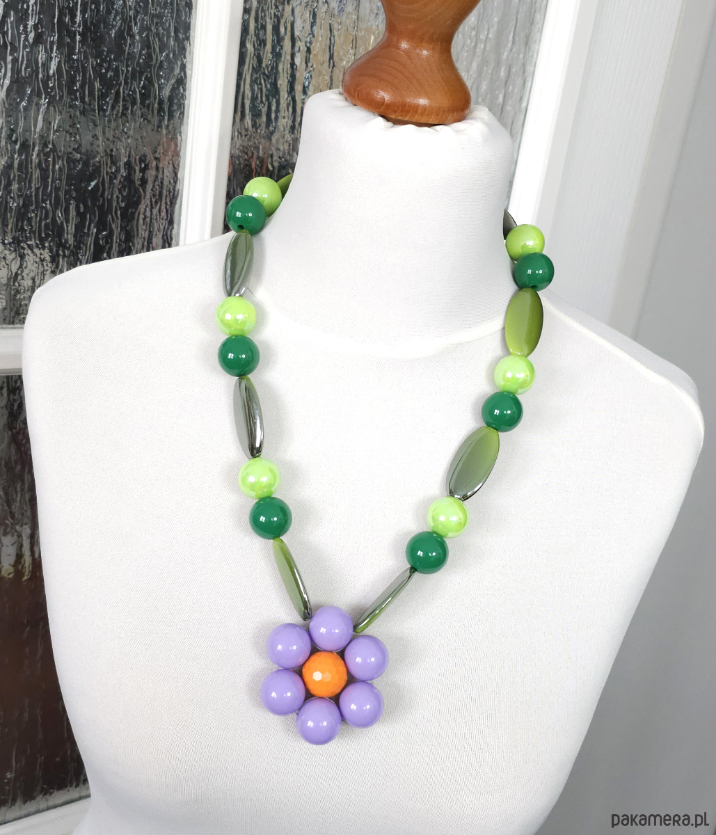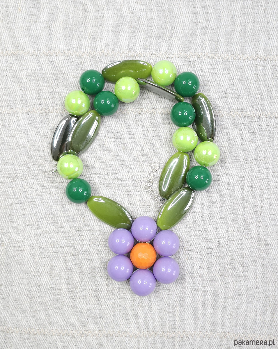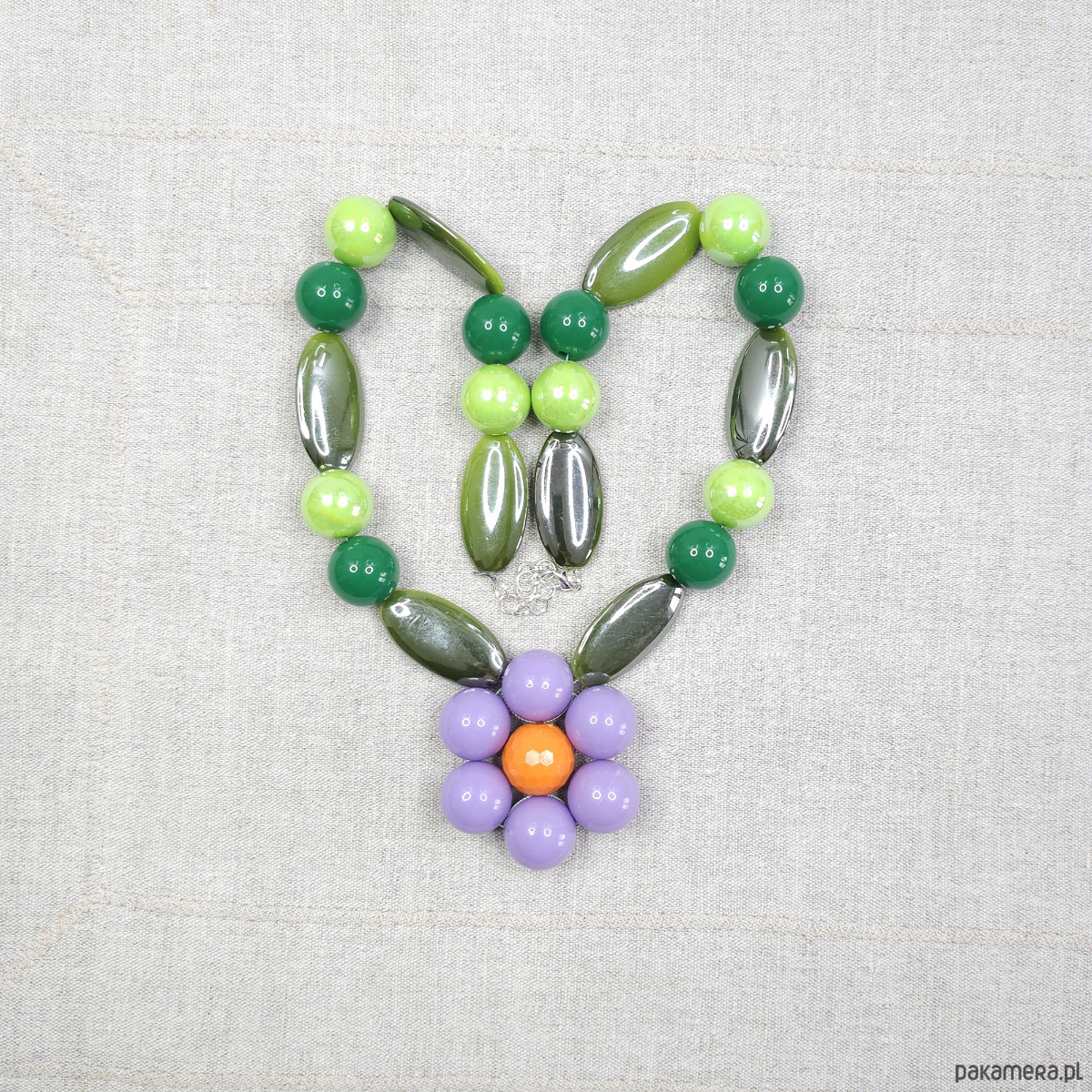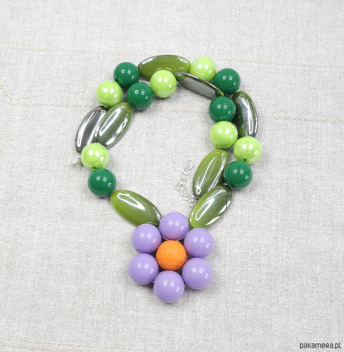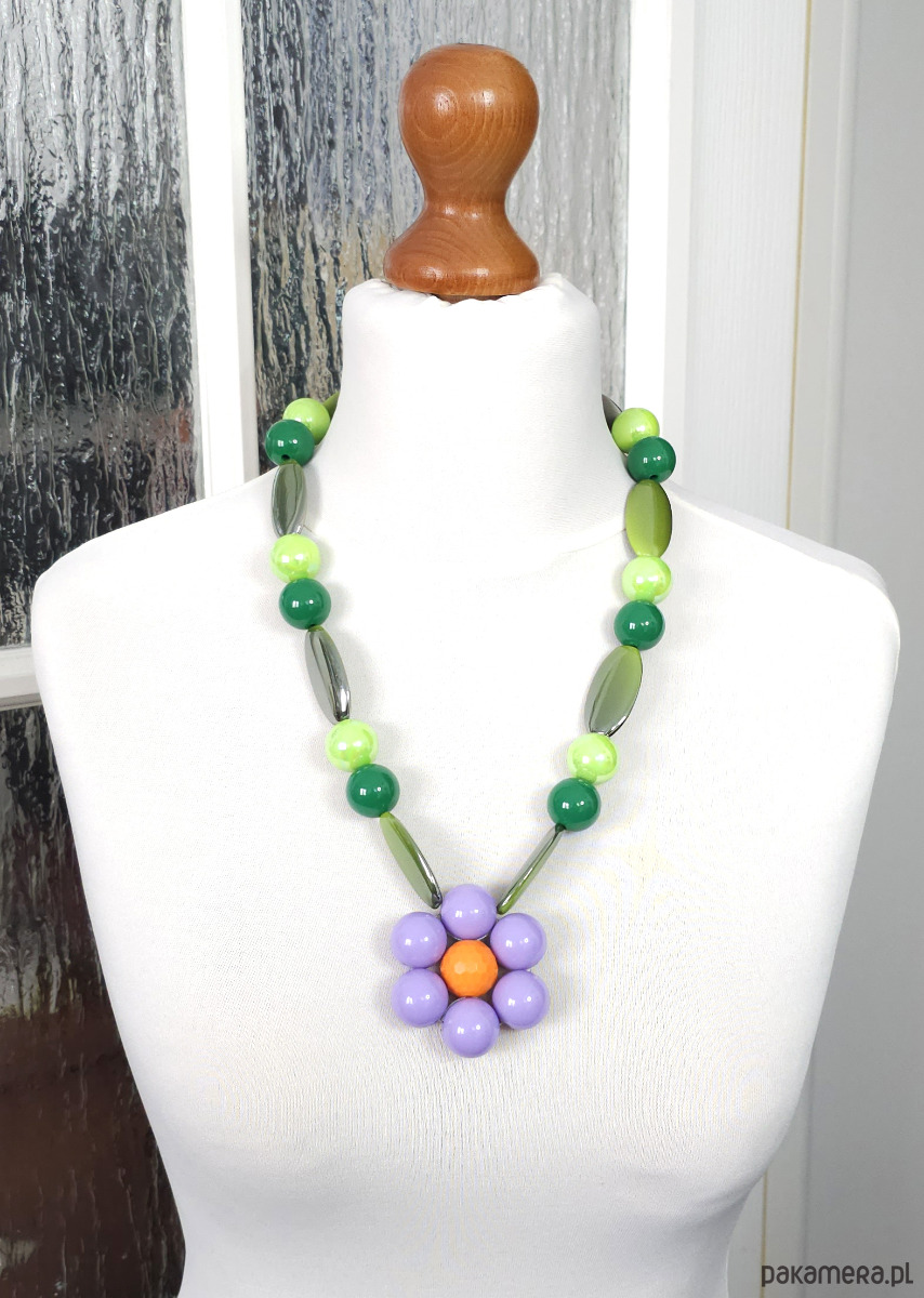 Naszyjnik prezentuje się niezwykle efektownie dzięki kontrastowi soczystej zieleni z fioletem i pomarańczem.
