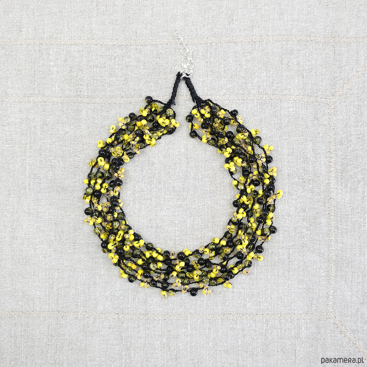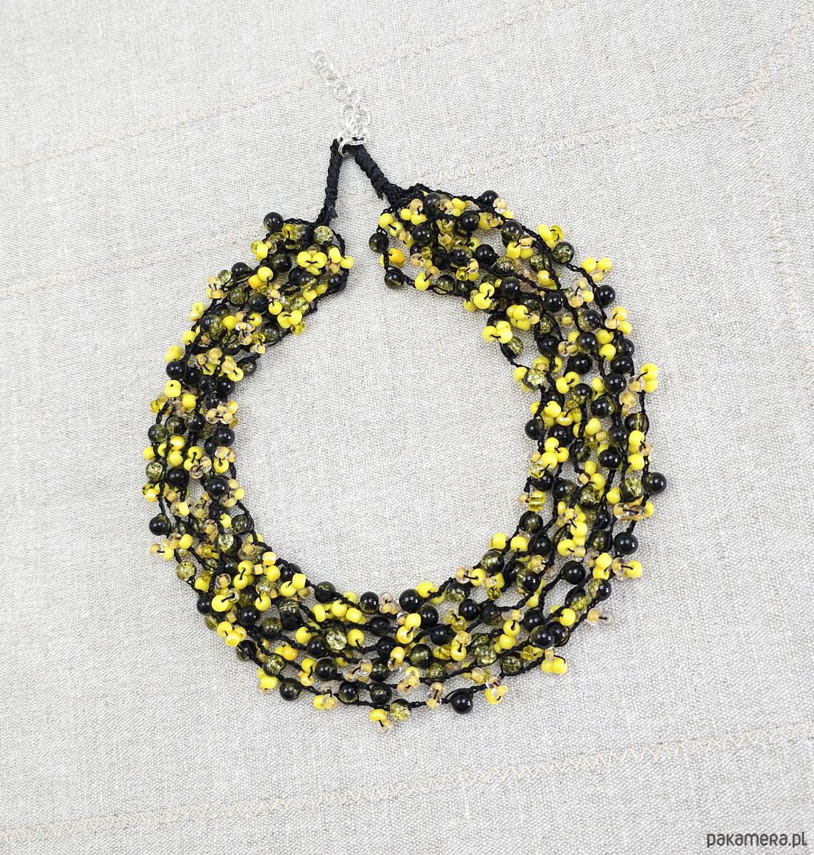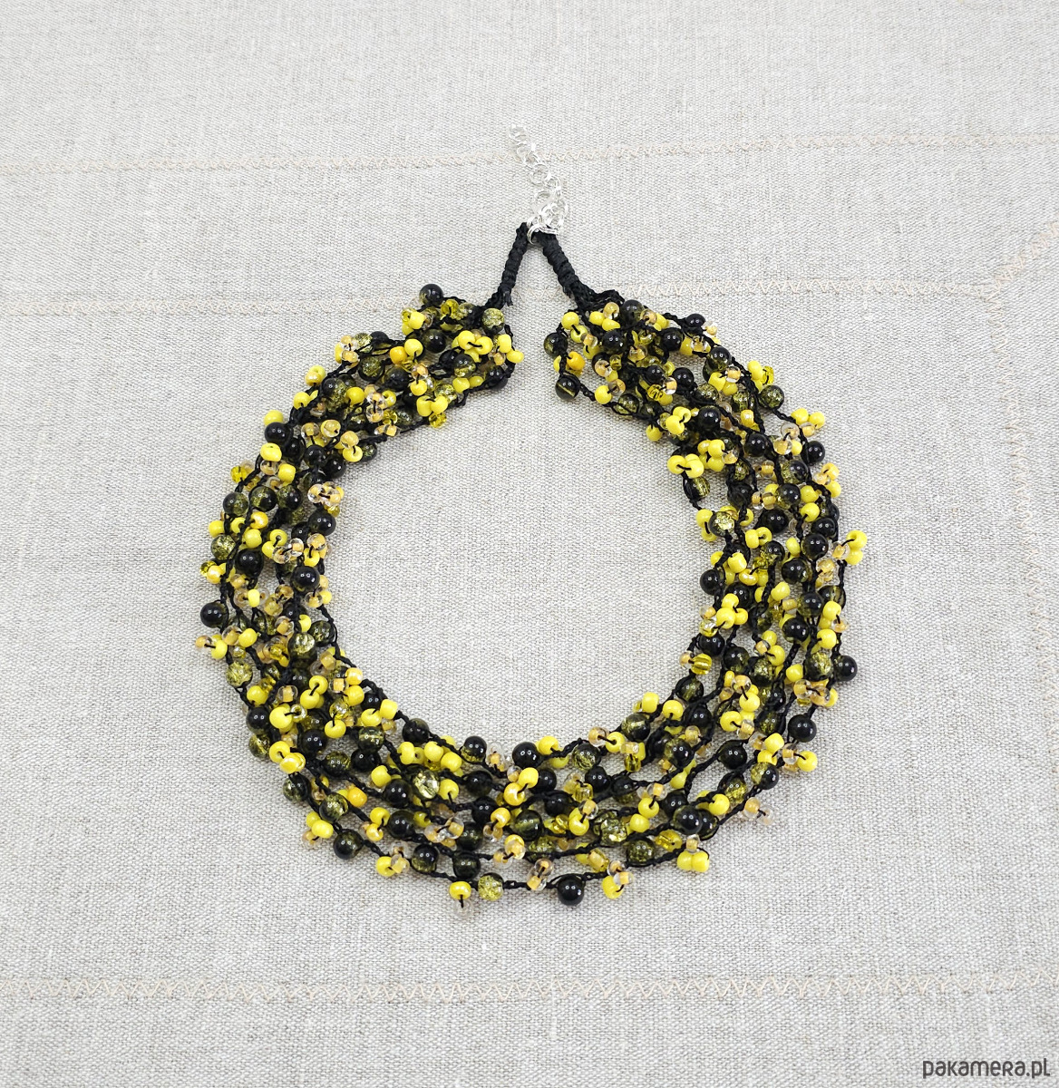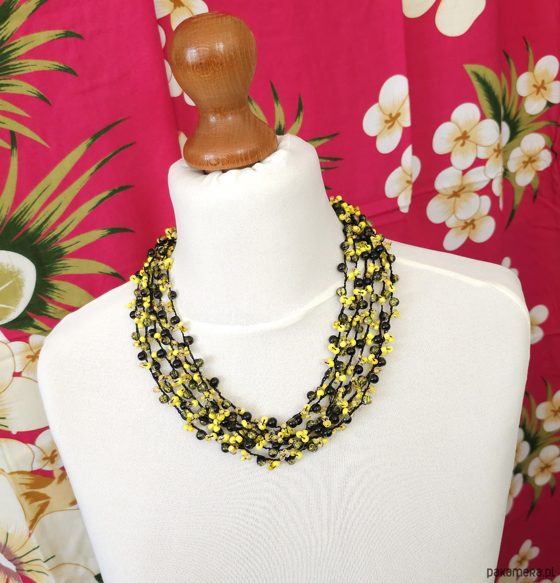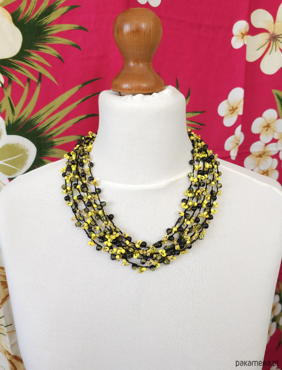 Wyrazisty naszyjnik wykonany z drobnych koralików.