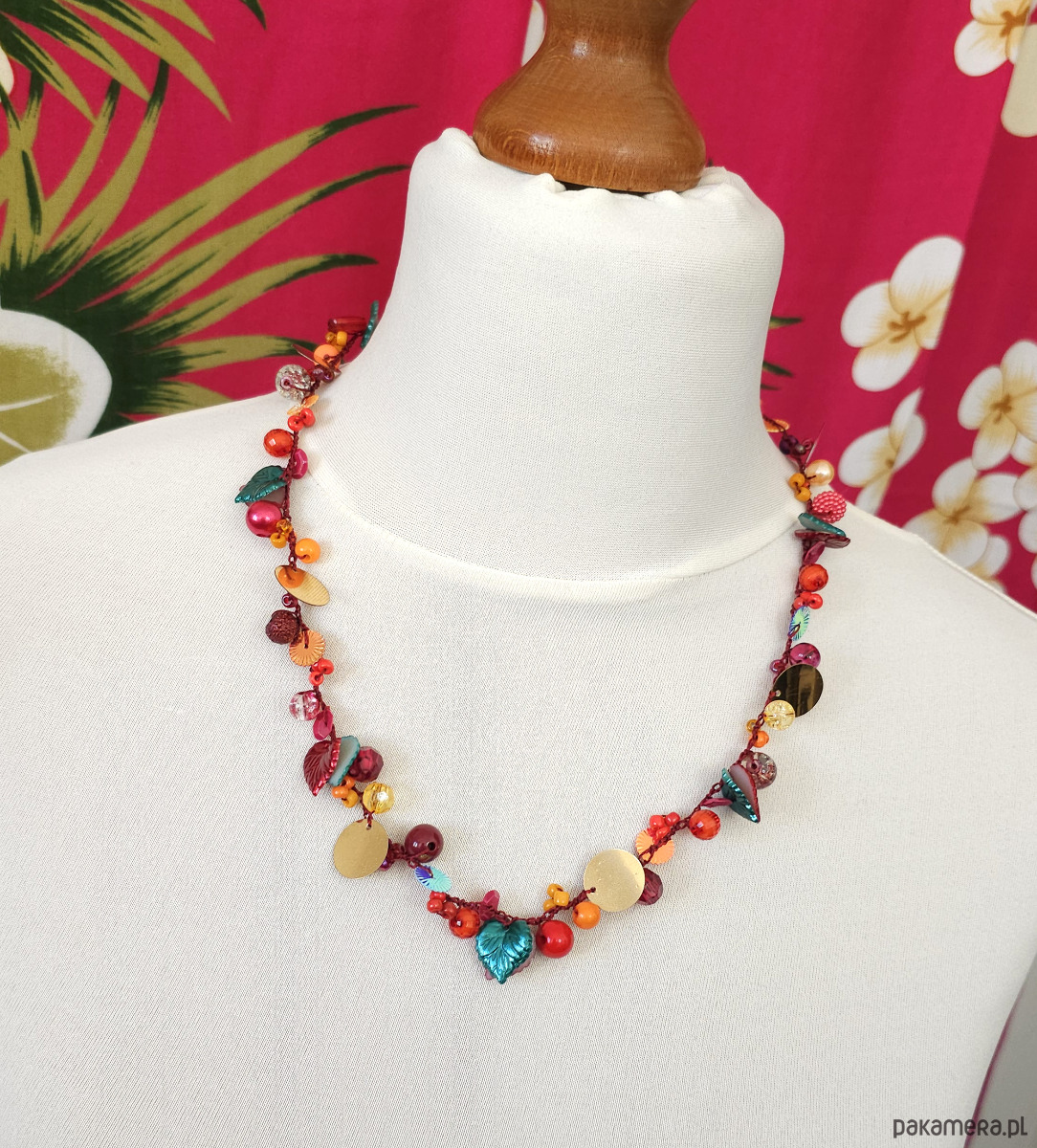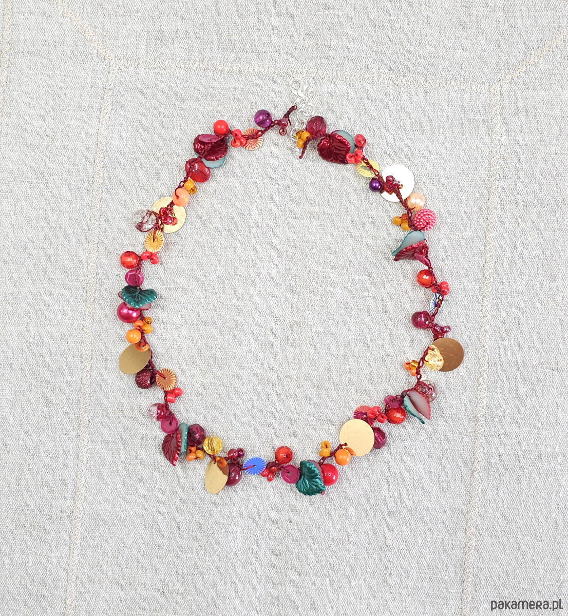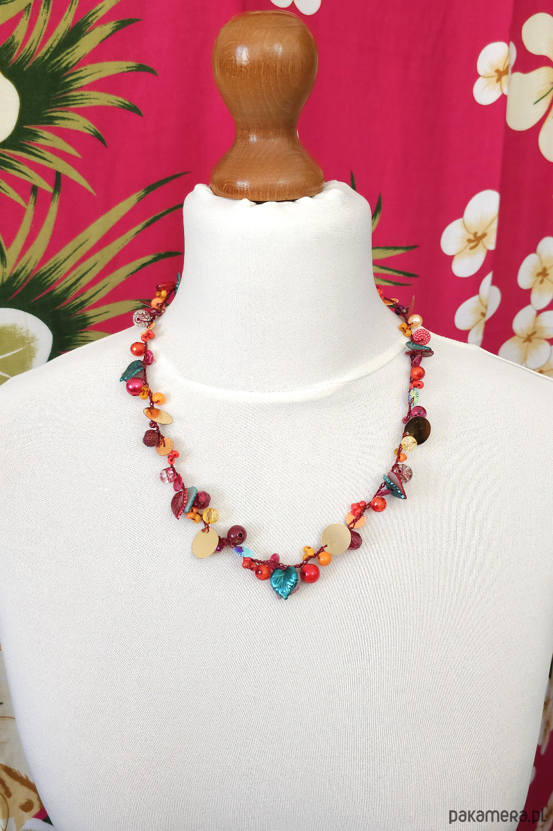 Wielofunkcyjny sznur biżuterii. Dzięki swojej długości może być noszony jako klasyczny naszyjnik lub owijana bransoletka (multi-wrap). Kolorystyka oscyluje wokół ciepłych tonów: czerwieni, burgundu, pomarańczy i fioletu, z mocniejszymi akcentami morskiej zieleni.