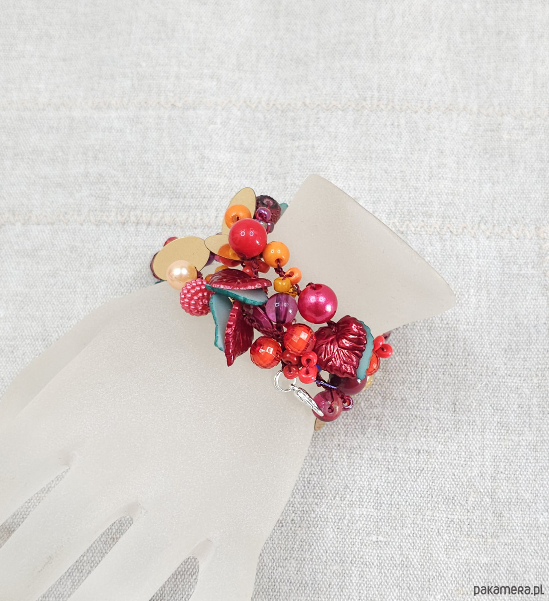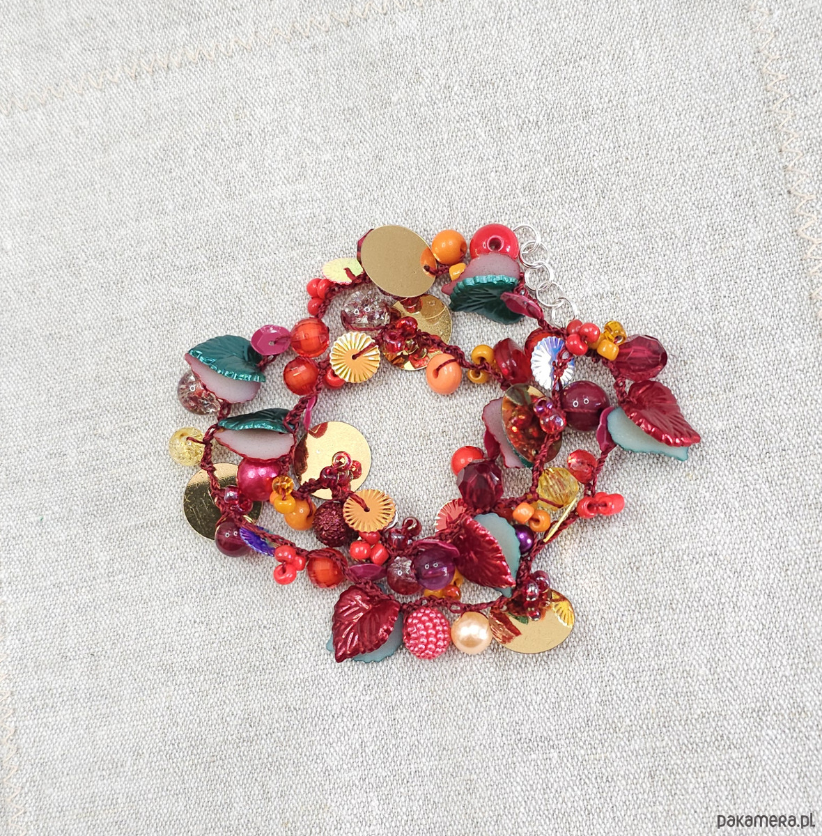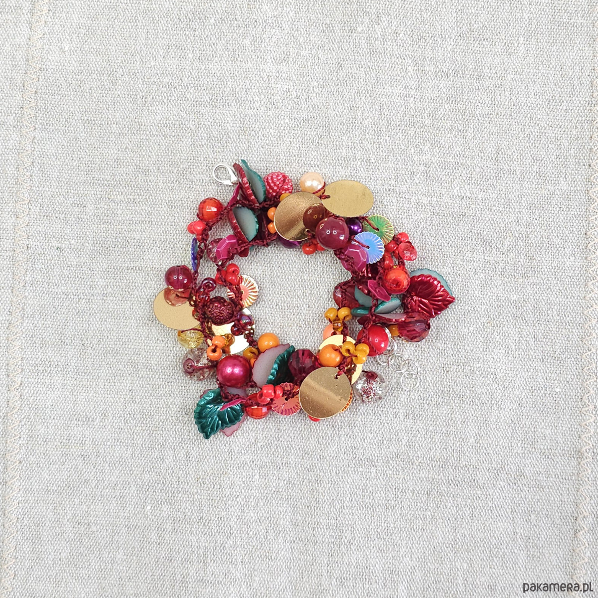 Wielofunkcyjny sznur biżuterii. Dzięki swojej długości może być noszony jako klasyczny naszyjnik lub owijana bransoletka (multi-wrap). Kolorystyka oscyluje wokół ciepłych tonów: czerwieni, burgundu, pomarańczy i fioletu, z mocniejszymi akcentami morskiej zieleni.