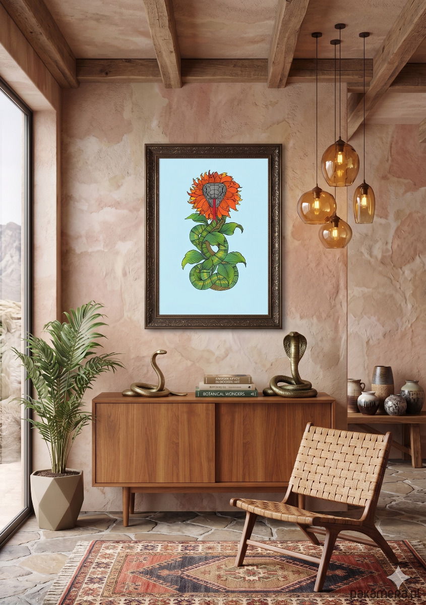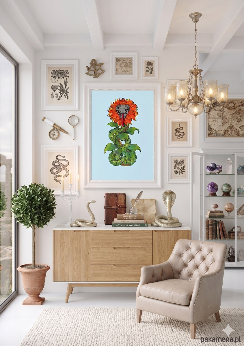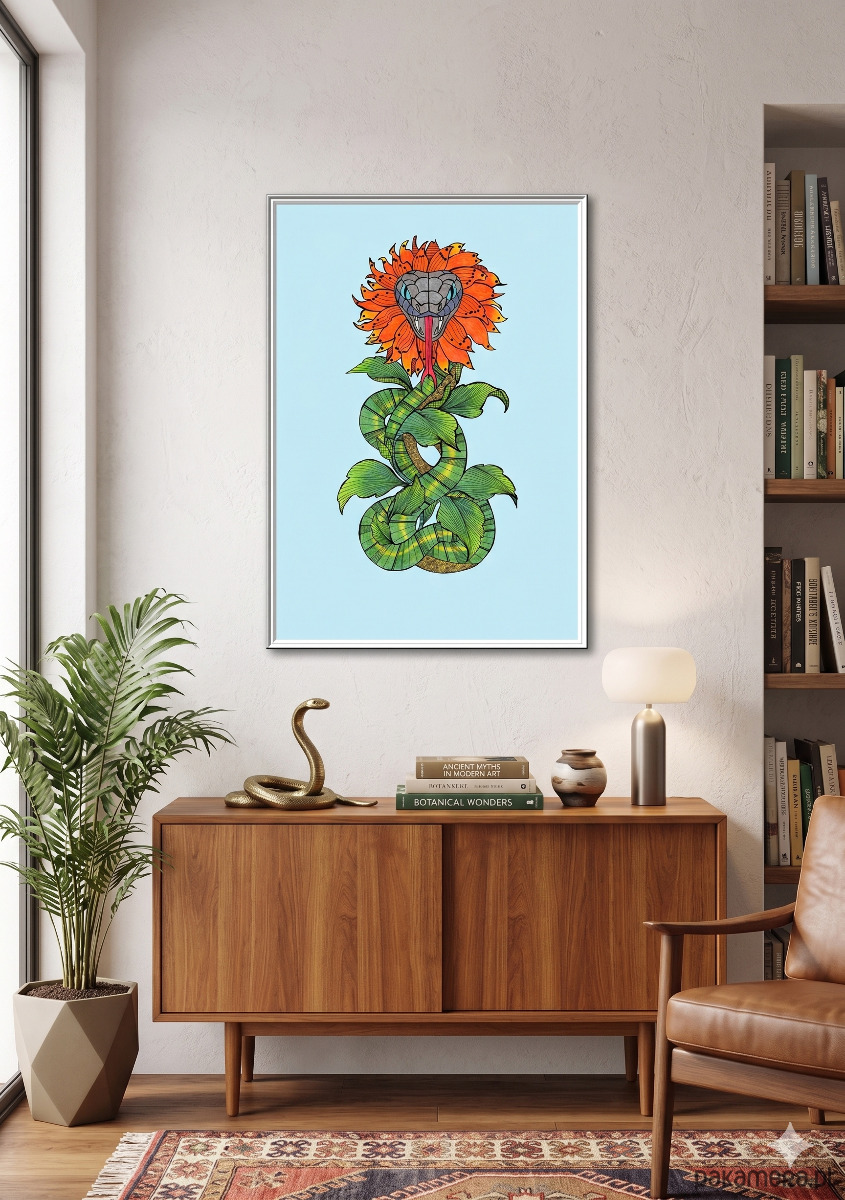 Będzie idealnym punktem centralnym w pomieszczeniu typu loft lub w pokoju kogoś, kto kocha nietuzinkowe dekoracje z nutką tajemnicy. Najlepiej zaprezentuje się w prostej ramie, która podkreśli drapieżność ilustracji.