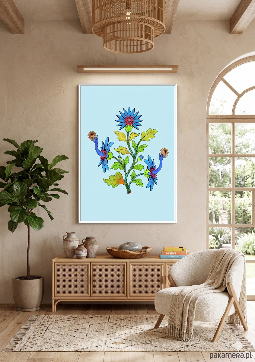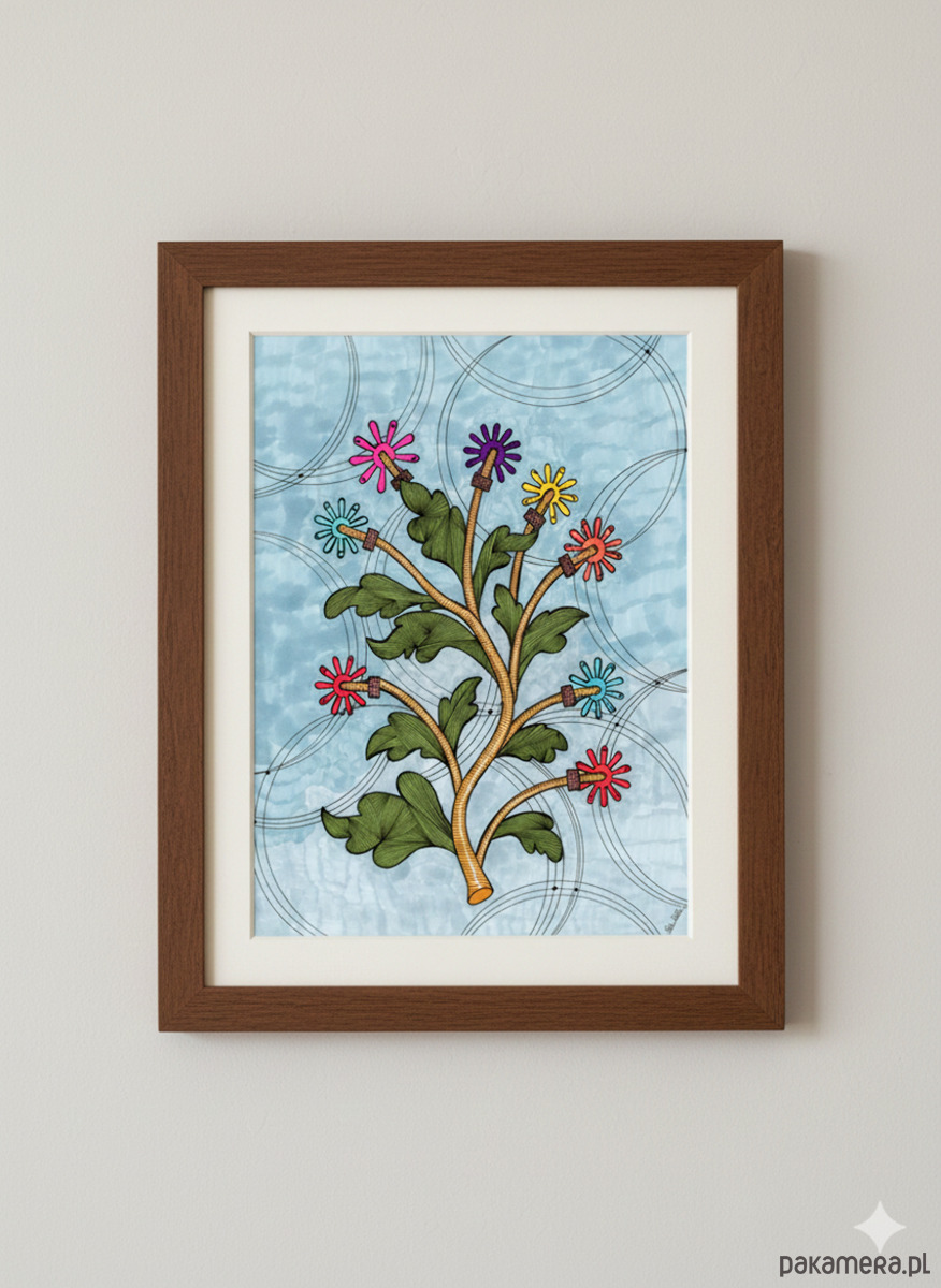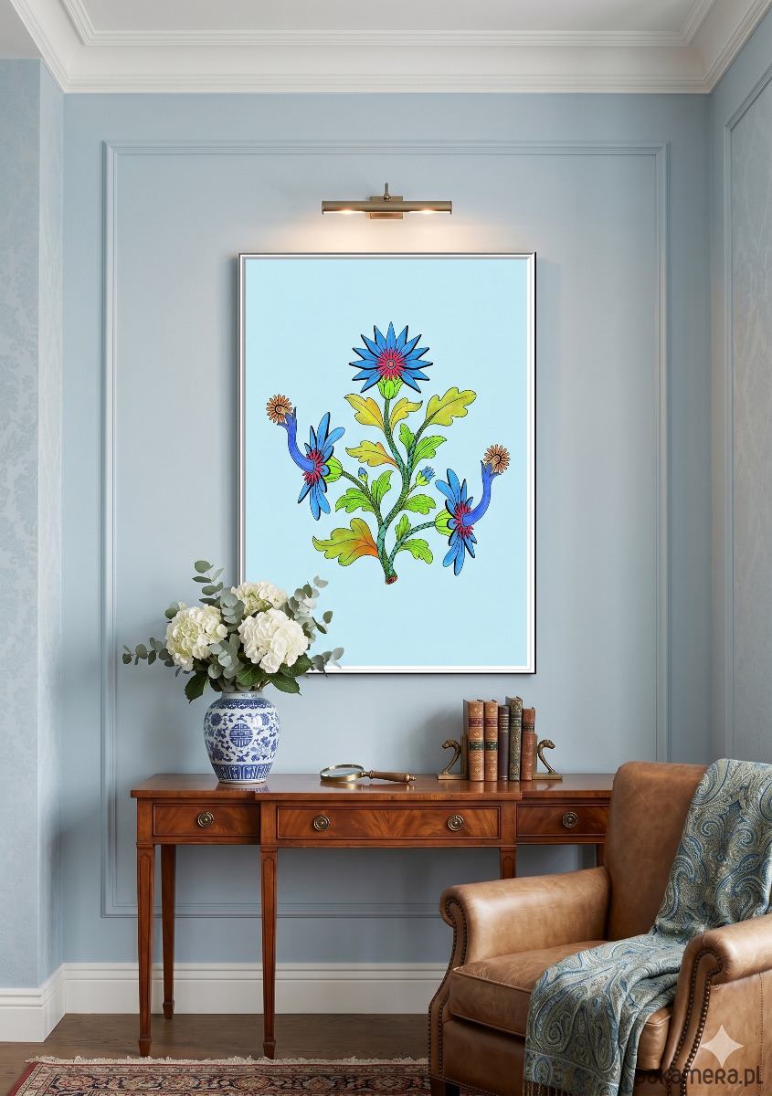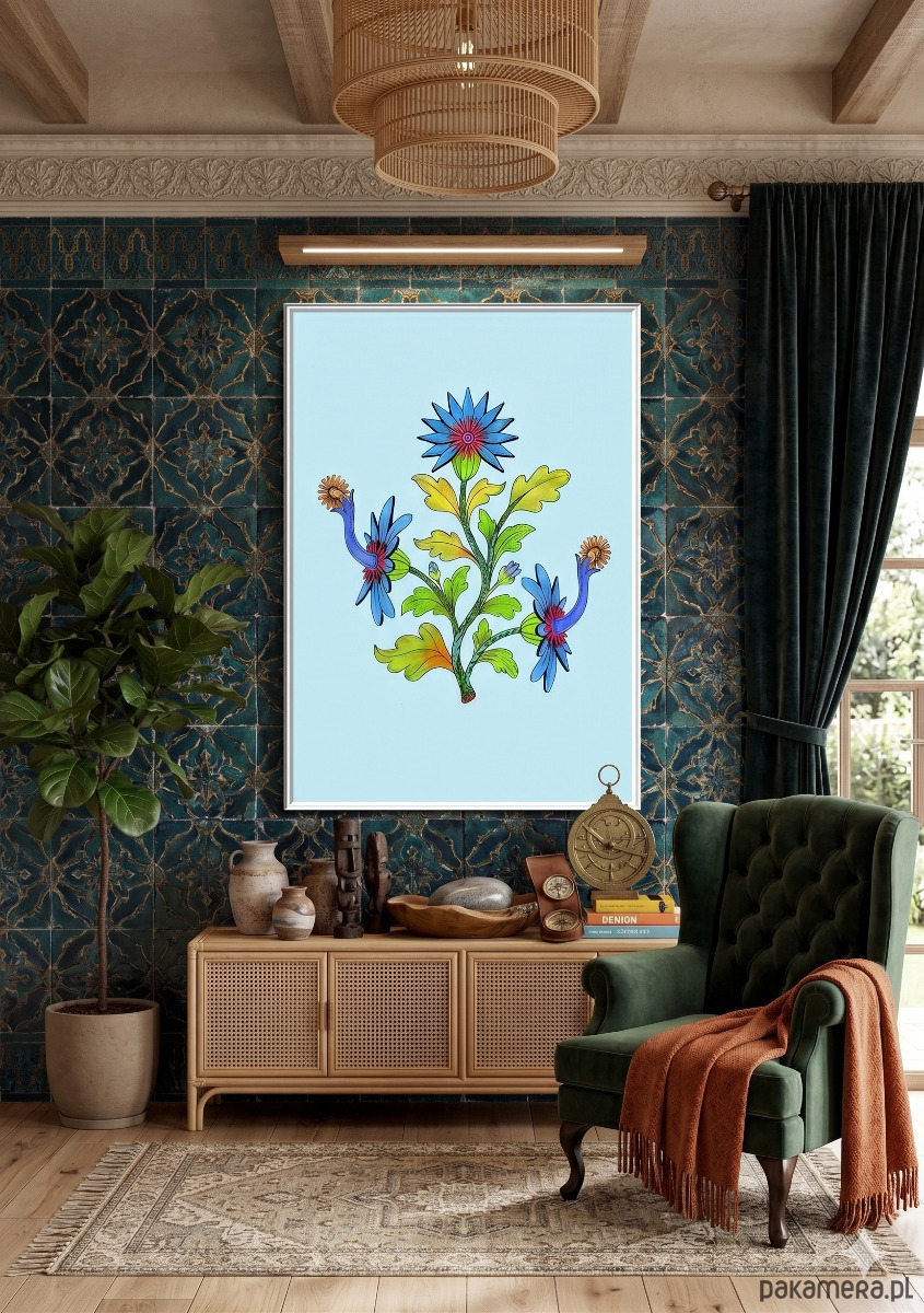 Dobrze zaprezentuje się w metalowej lub minimalistycznej, czarnej ramie na tle surowego betonu lub cegły.