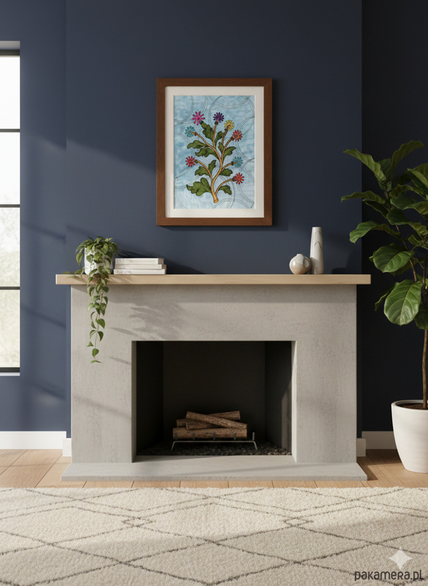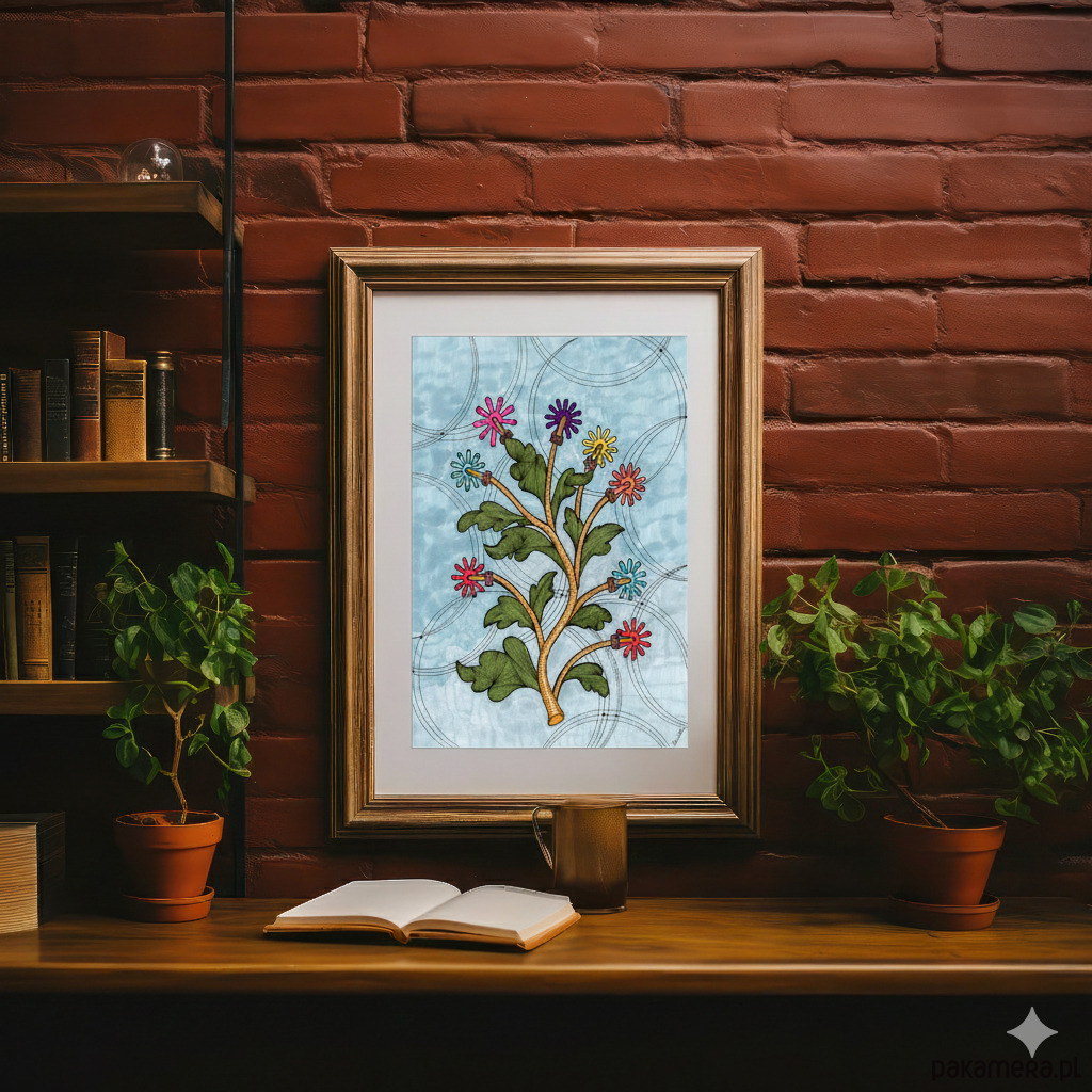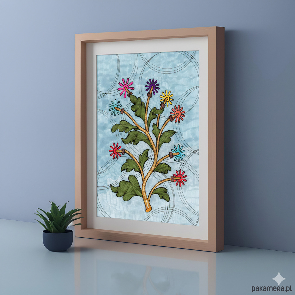 Dobrze zaprezentuje się w metalowej lub minimalistycznej, czarnej ramie na tle surowego betonu lub cegły.