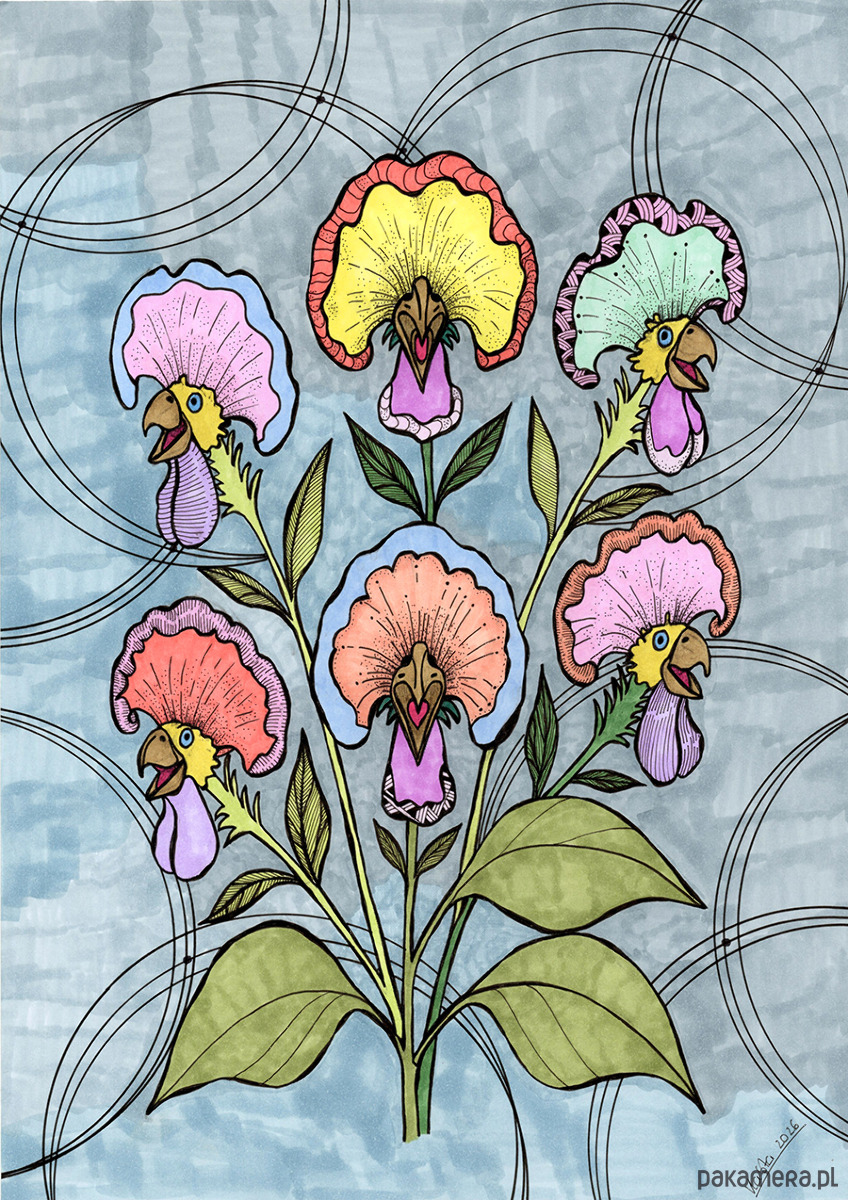 Tym razem na warsztat trafiła Kokoryczka. Nazwa ta nierozerwalnie kojarzy się z dumnym kogutem, dlatego w mojej interpretacji kwiaty zamieniły się w kolorowe ptasie głowy z charakterystycznymi grzebieniami i koralami.