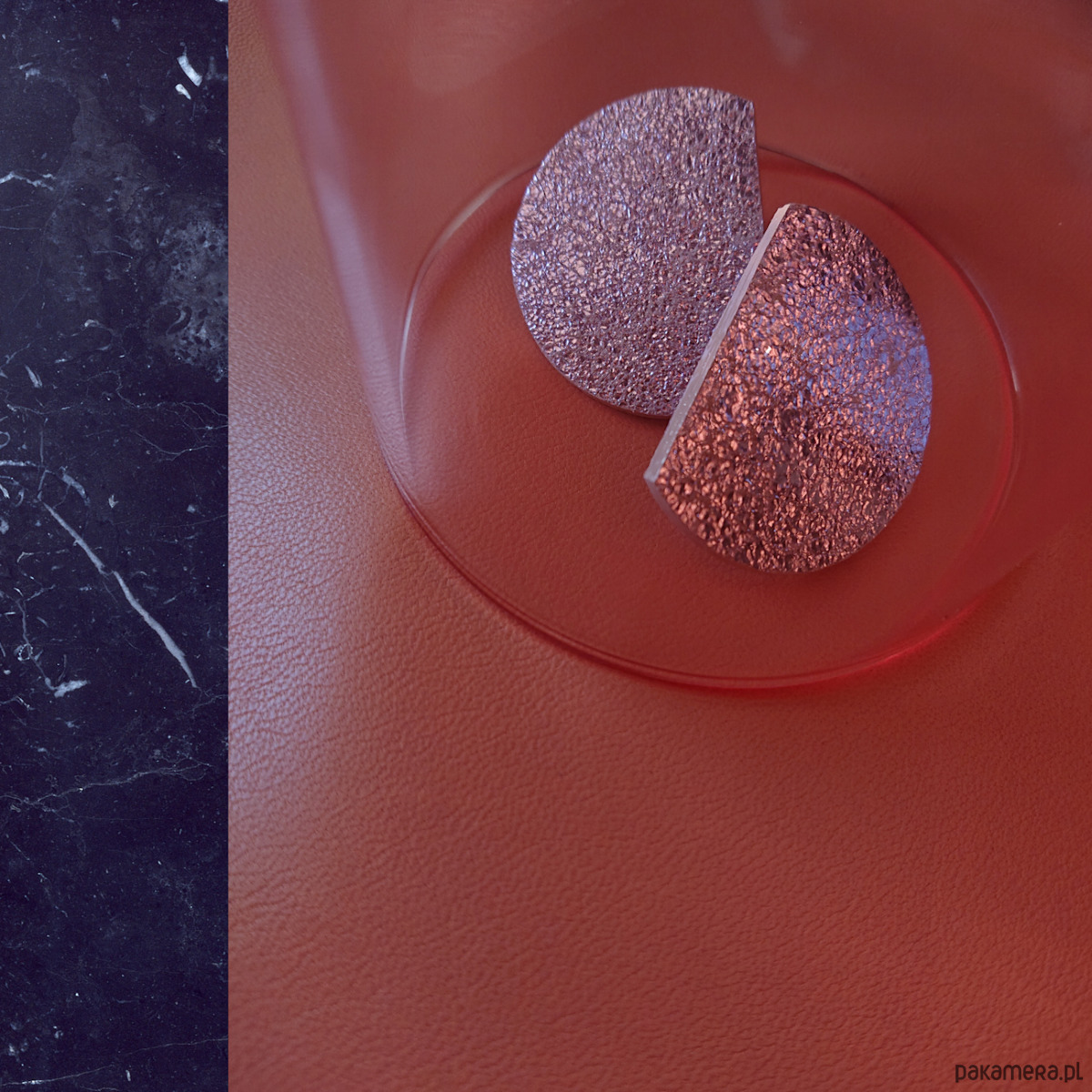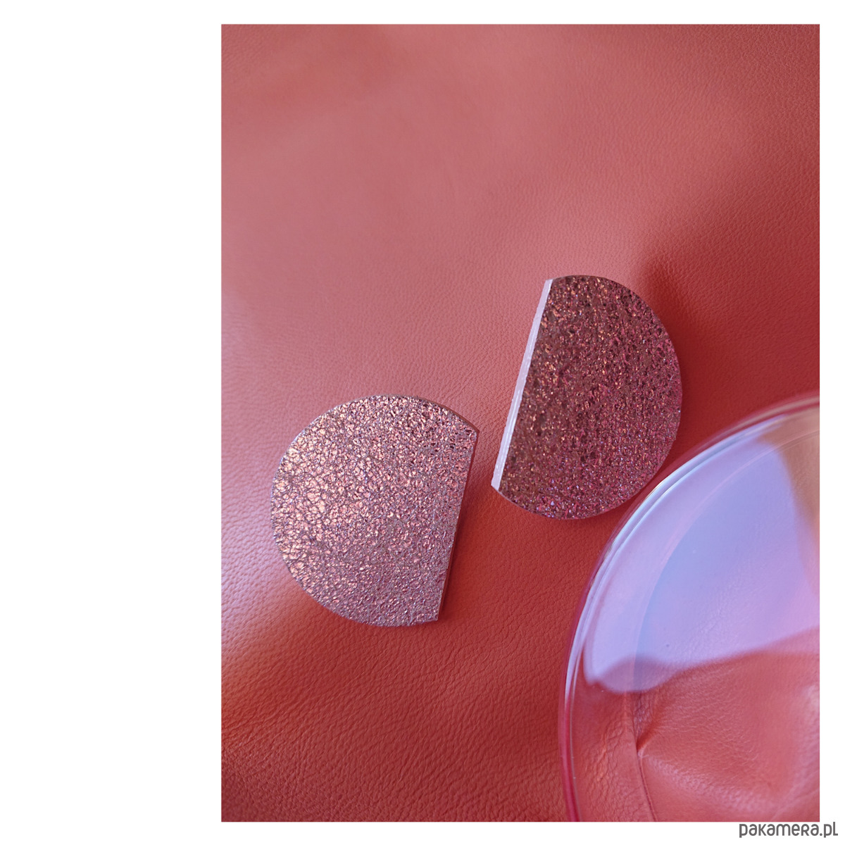 Geometryczne kolczyki wykonane ze skóry w kolorze jasnego brokatowego różu z fakturą przecierki.