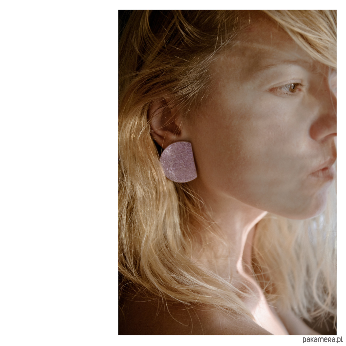 Geometryczne kolczyki wykonane ze skóry w kolorze jasnego brokatowego różu z fakturą przecierki.