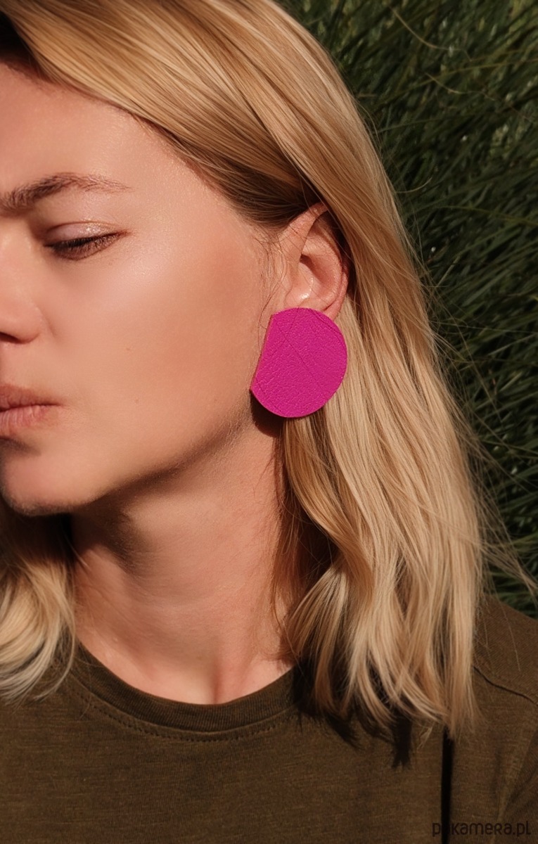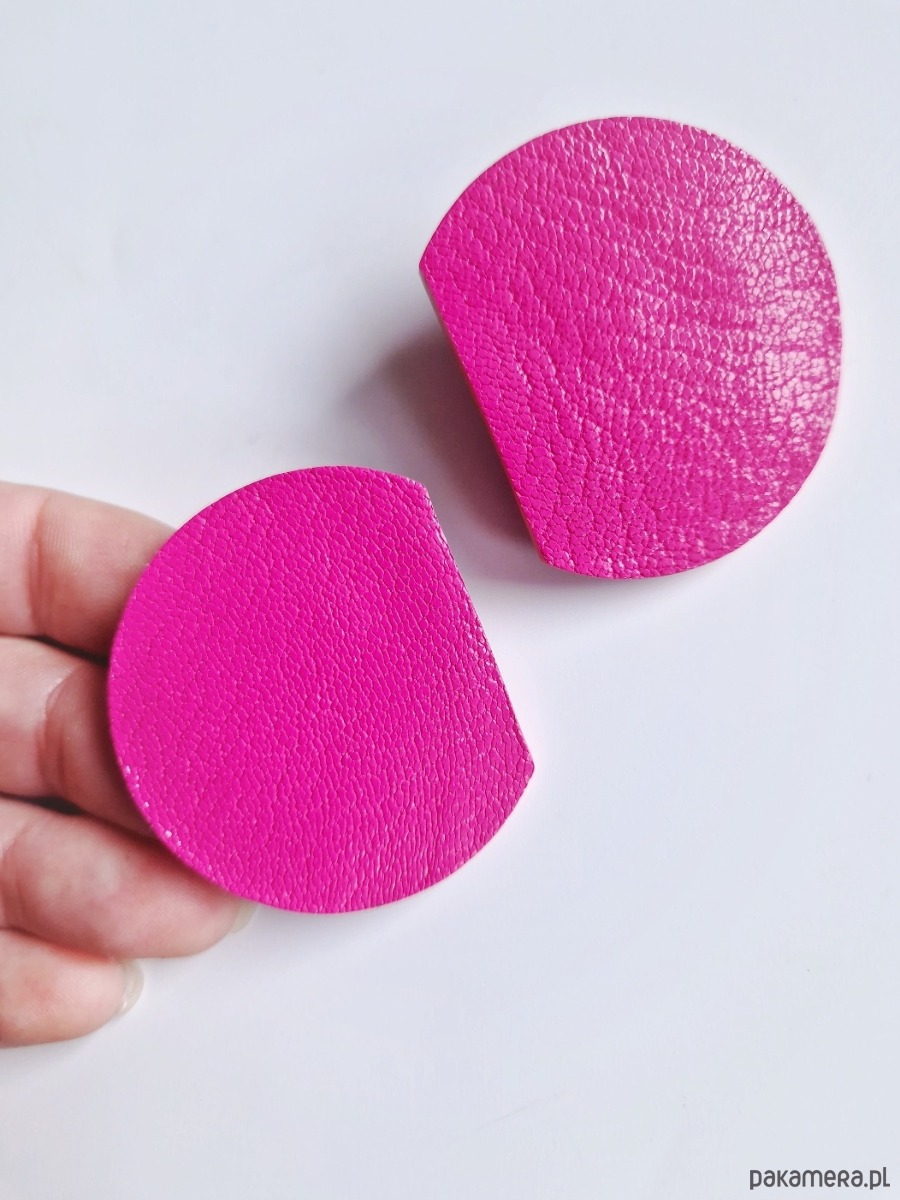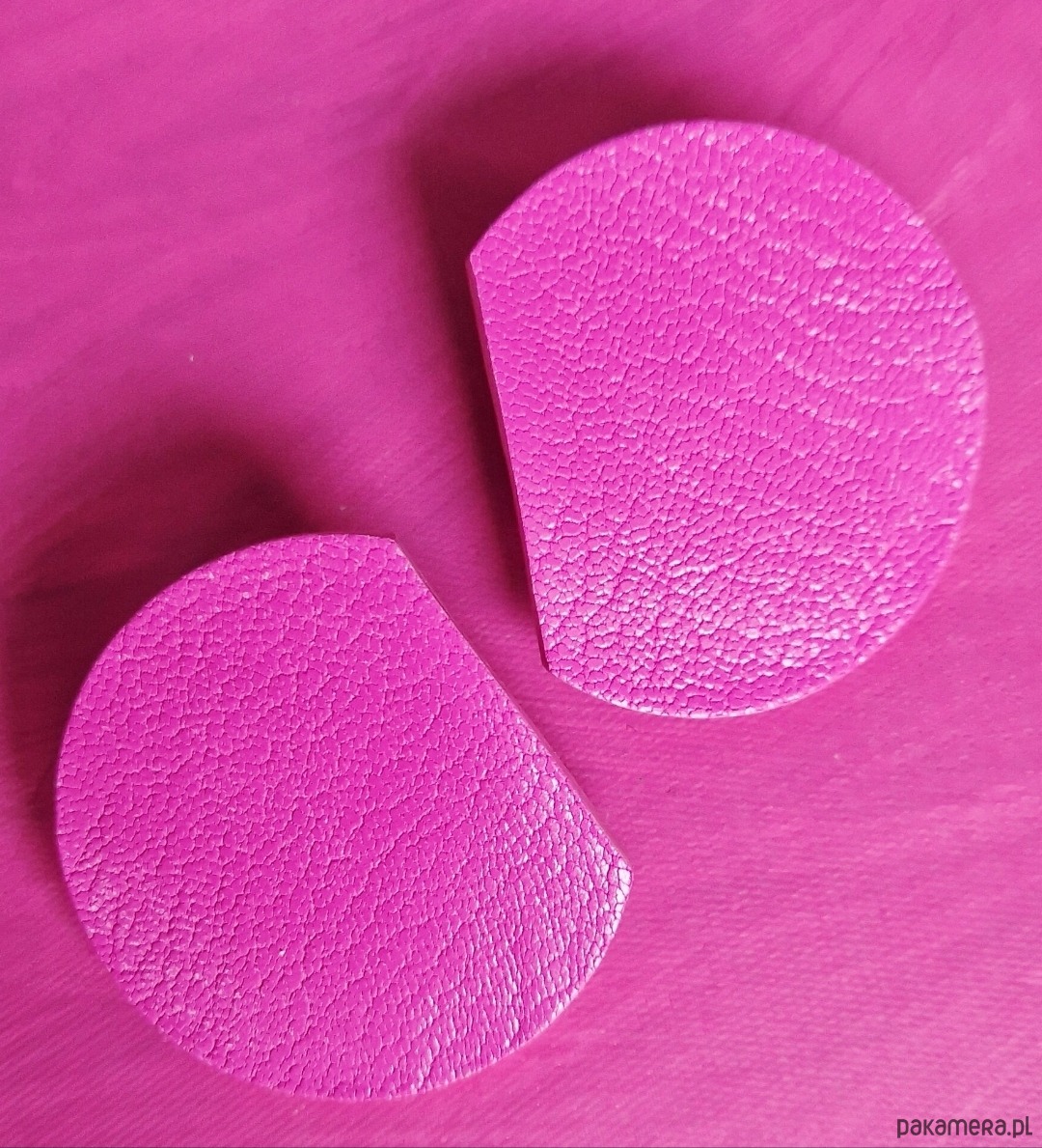 Duże geometryczne kolczyki wykonane z miękkiej skóry w kolorze fuksja.