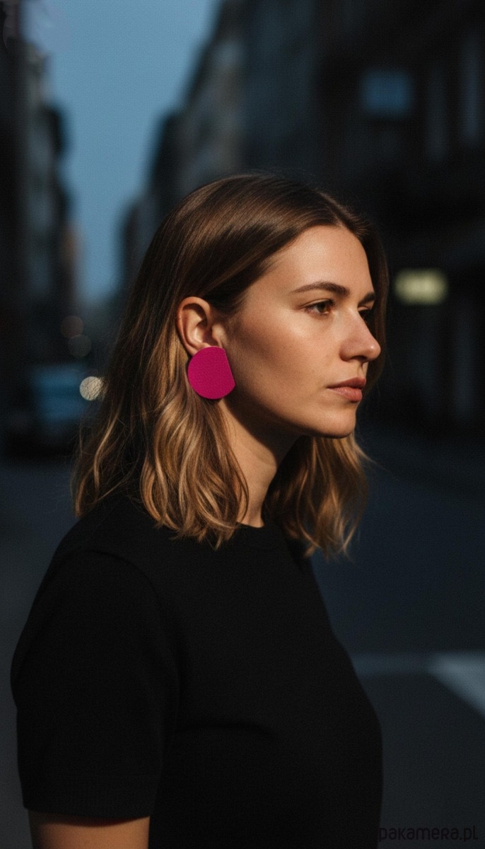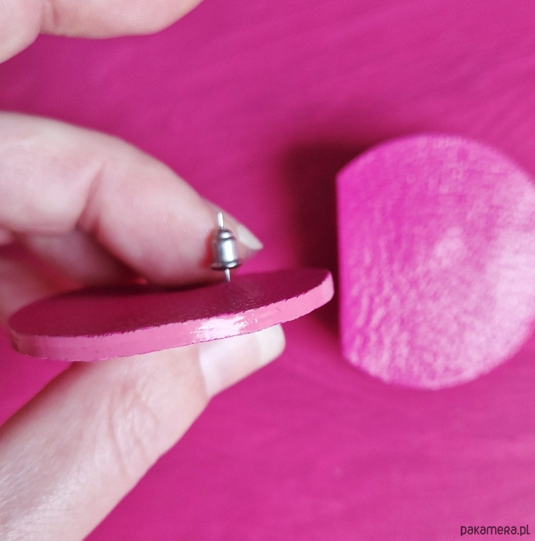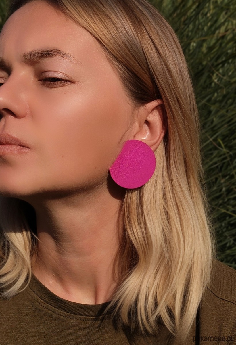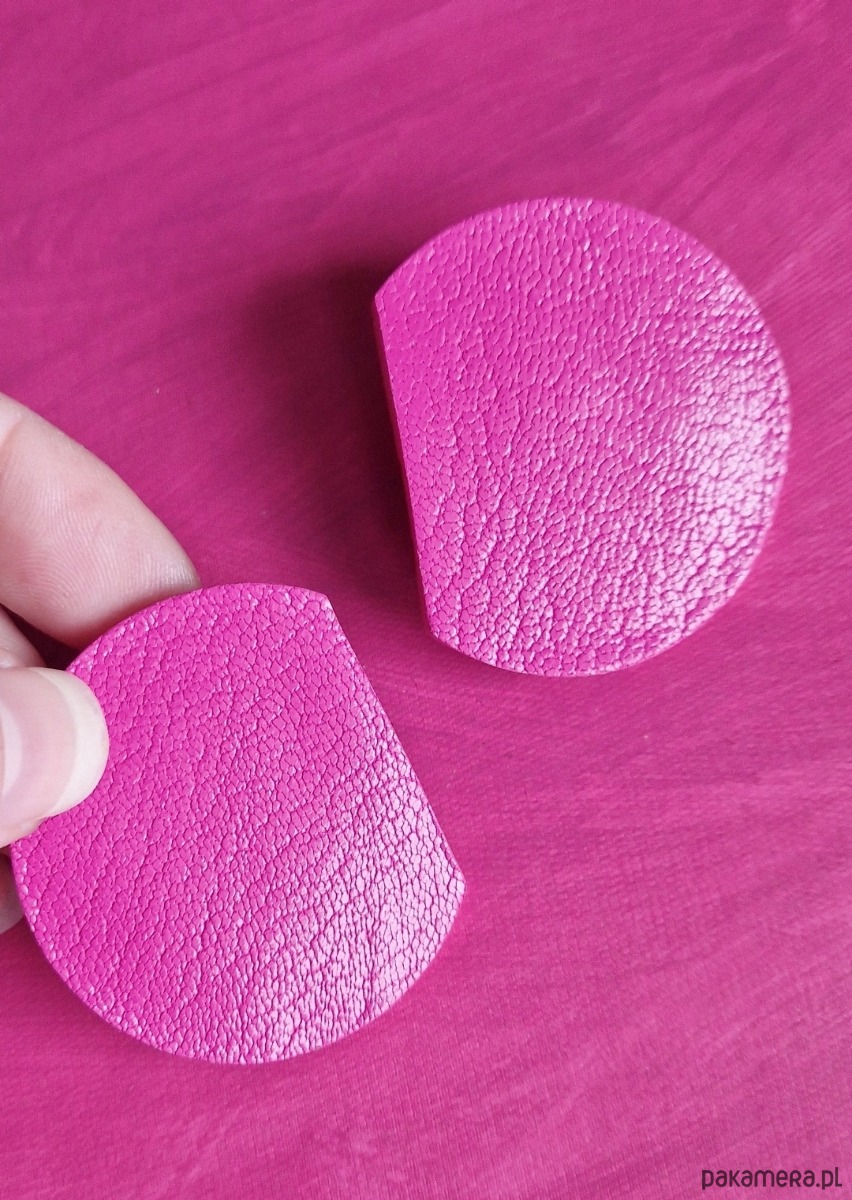 Duże geometryczne kolczyki wykonane z miękkiej skóry w kolorze fuksja.