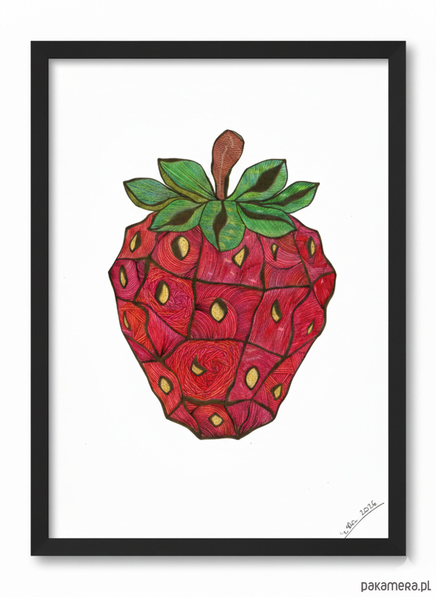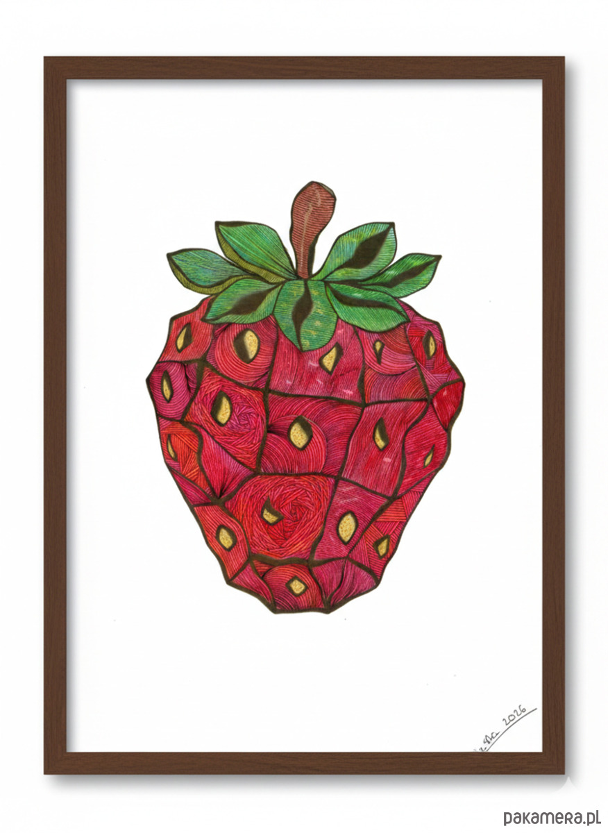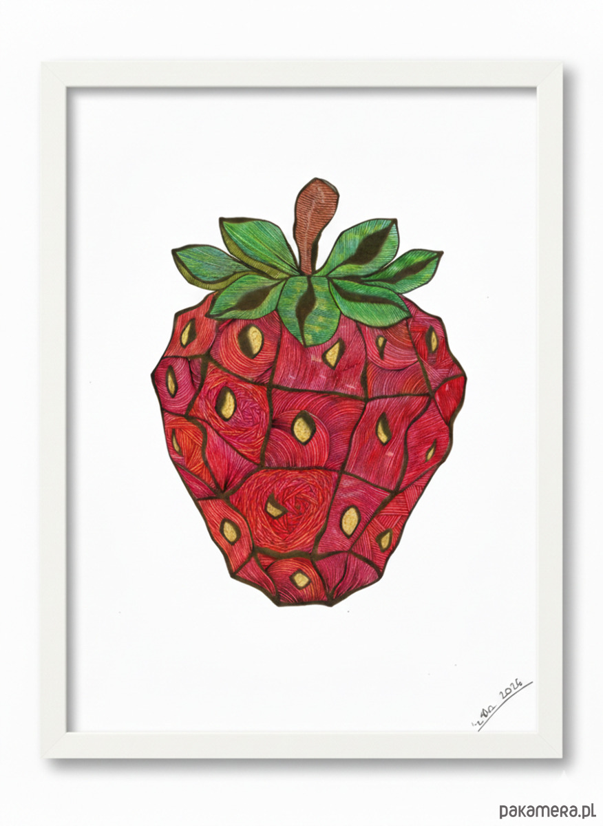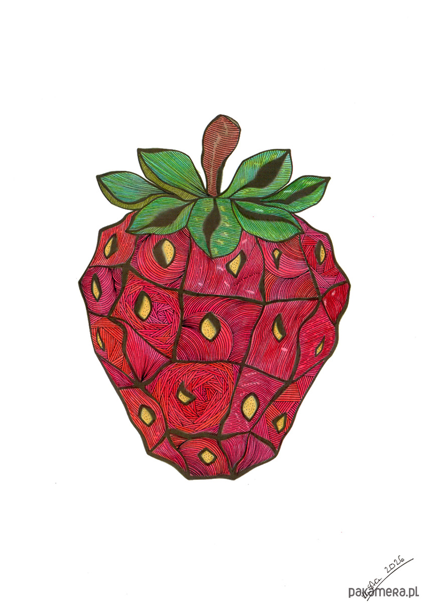 Wyrazista grafika przedstawiająca truskawkę.