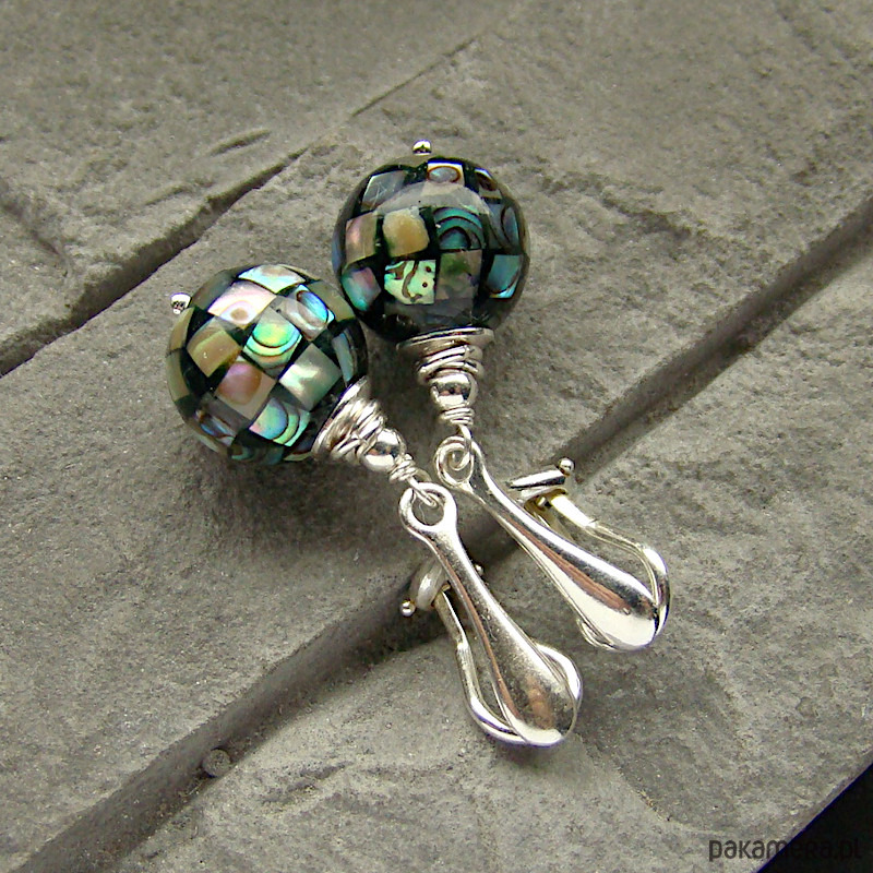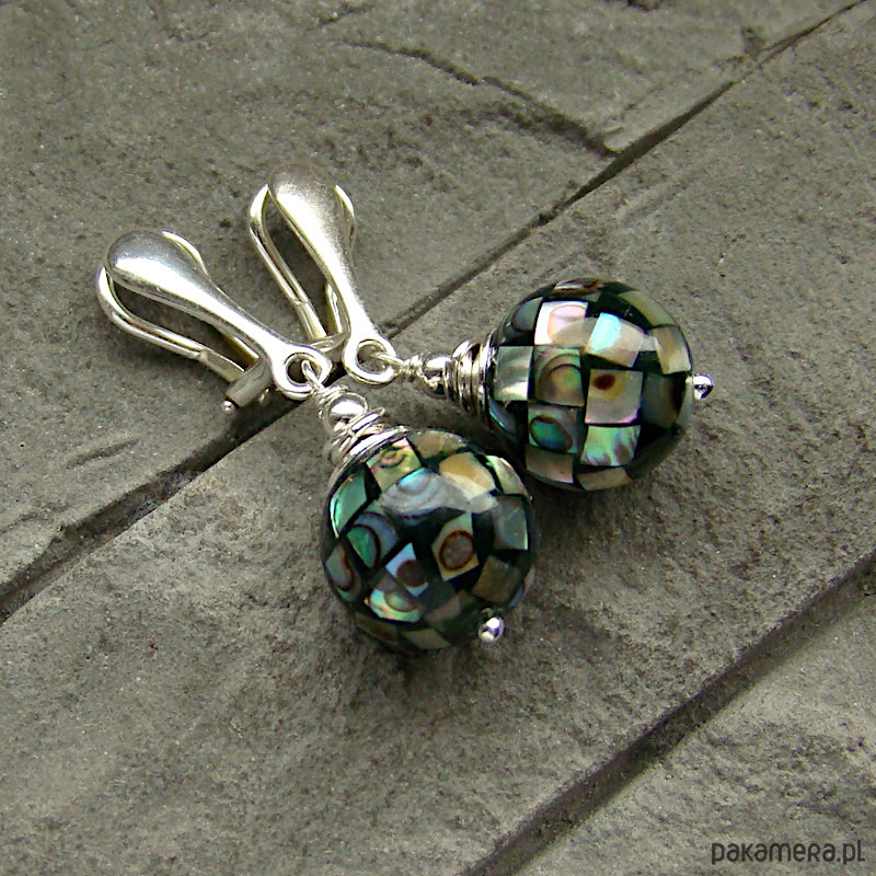 Przepiękne, kobiece i eleganckie klipsy na co dzień jak i na wielkie okazje. Wykonane w całości ze srebra próby 925 oraz mozaikowych kul z muszla Abalone wielkości 1,2 cm. Długość bez zapięć wynosi 2,2 cm. Zapiecia srebrne, wygodne. Zapakowane ozdobnie.