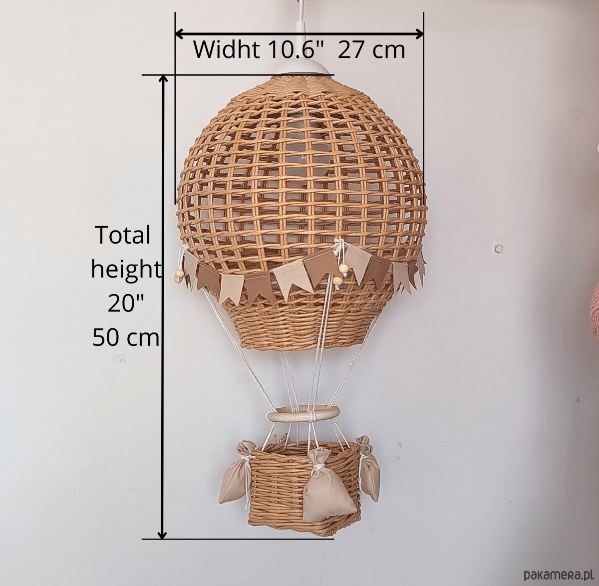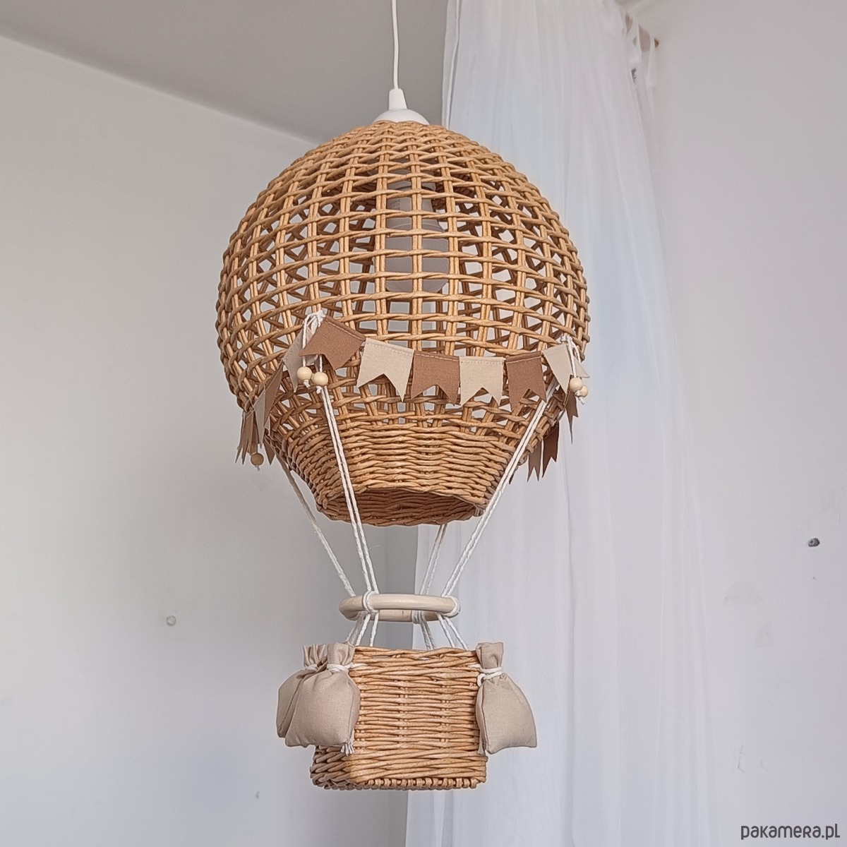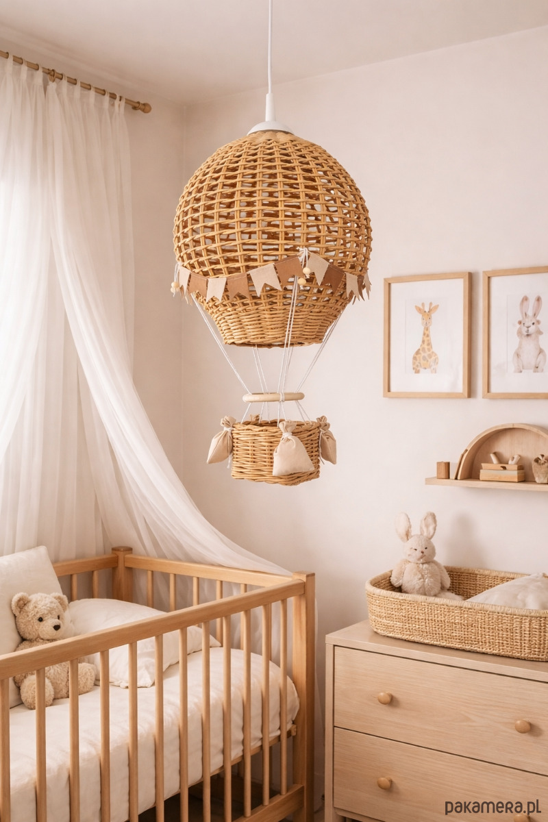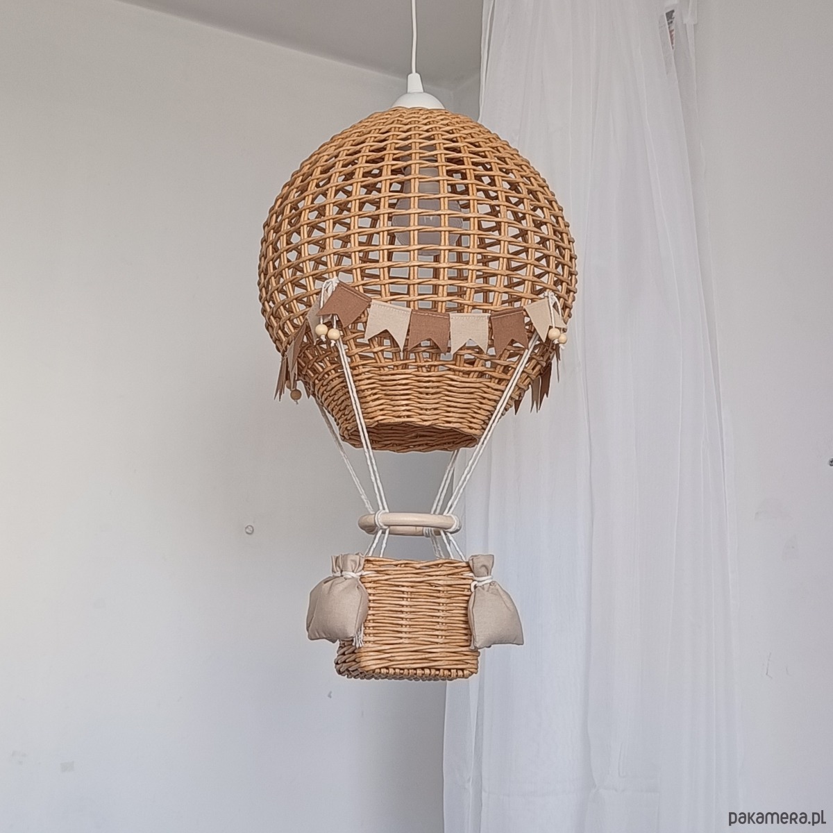 Abażur w kształcie balonu to urocza dekoracja, która wprowadza do pokoju dziecka ciepło, lekkość i bajkowy nastrój. Abażur przypomina unoszący się hot air balloon z koszykiem, ozdobiony bawełnianymi detalami oraz chorągiewkami, dzięki czemu doskonale komponuje się z wnętrzami w stylu boho, skandynawskim lub naturalnym.