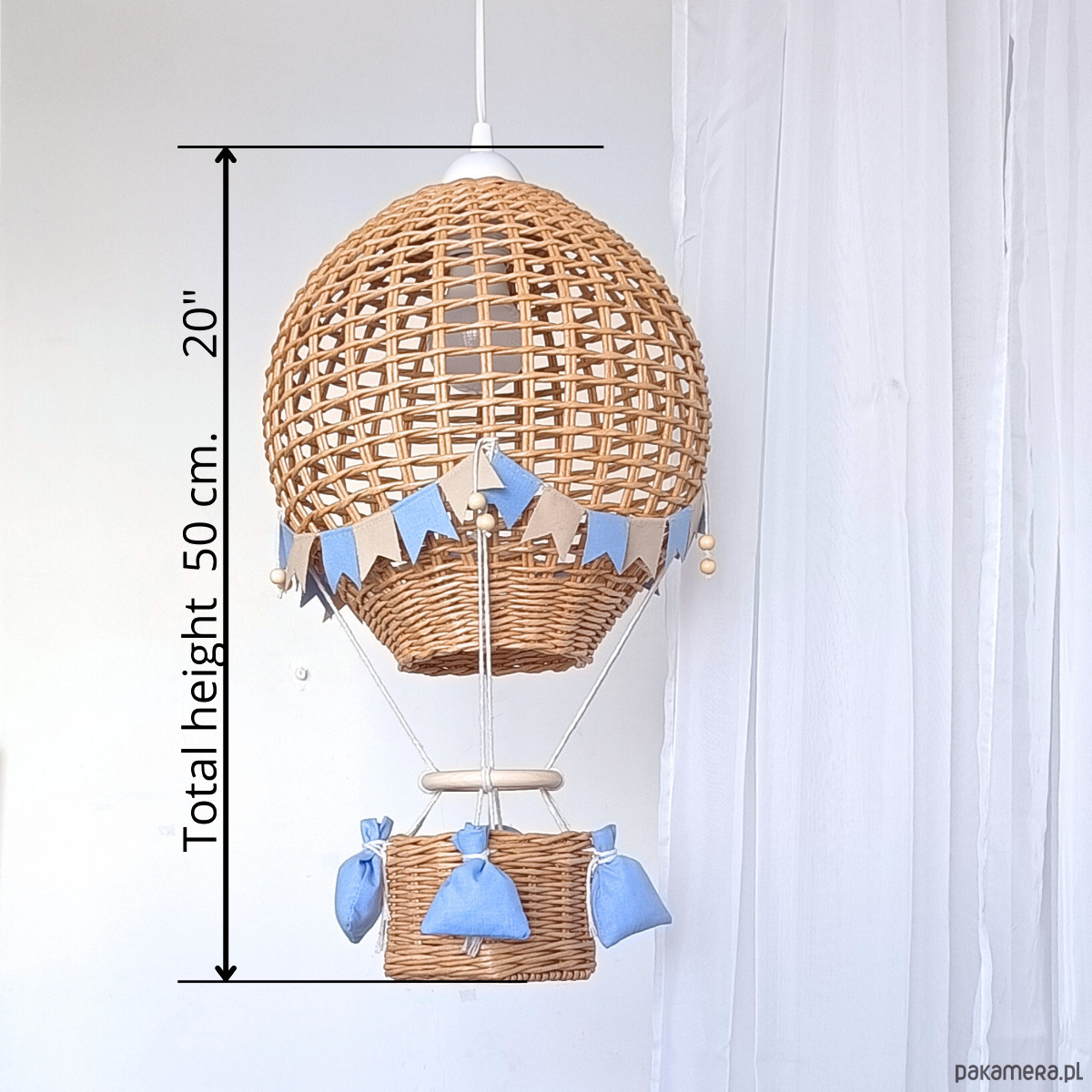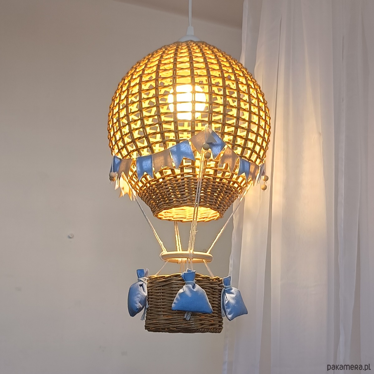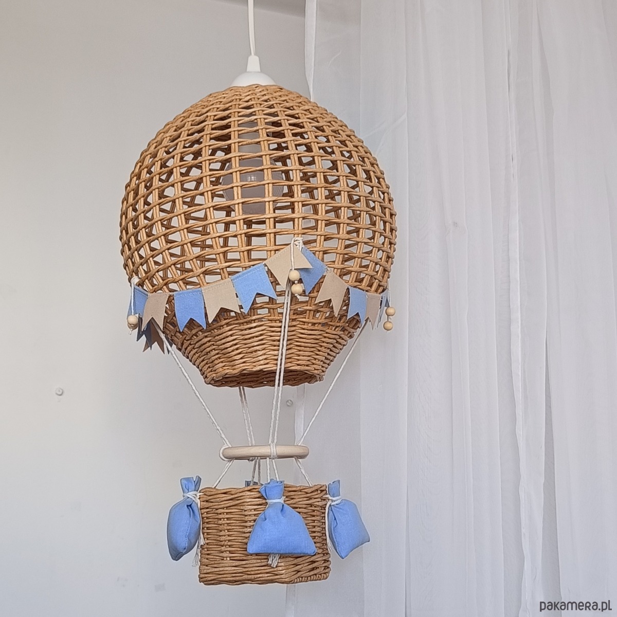 Abażur do pokoju dziecka – balon dekoracyjny z koszem (do pokoju chłopca) to wyjątkowa dekoracja, która wnosi do wnętrza ciepło, lekkość i bajkowy klimat. Inspirowany formą hot air balloon, abażur z koszykiem tworzy przytulną atmosferę, idealną do pokoju dziecka, a szczególnie do aranżacji dla chłopca.