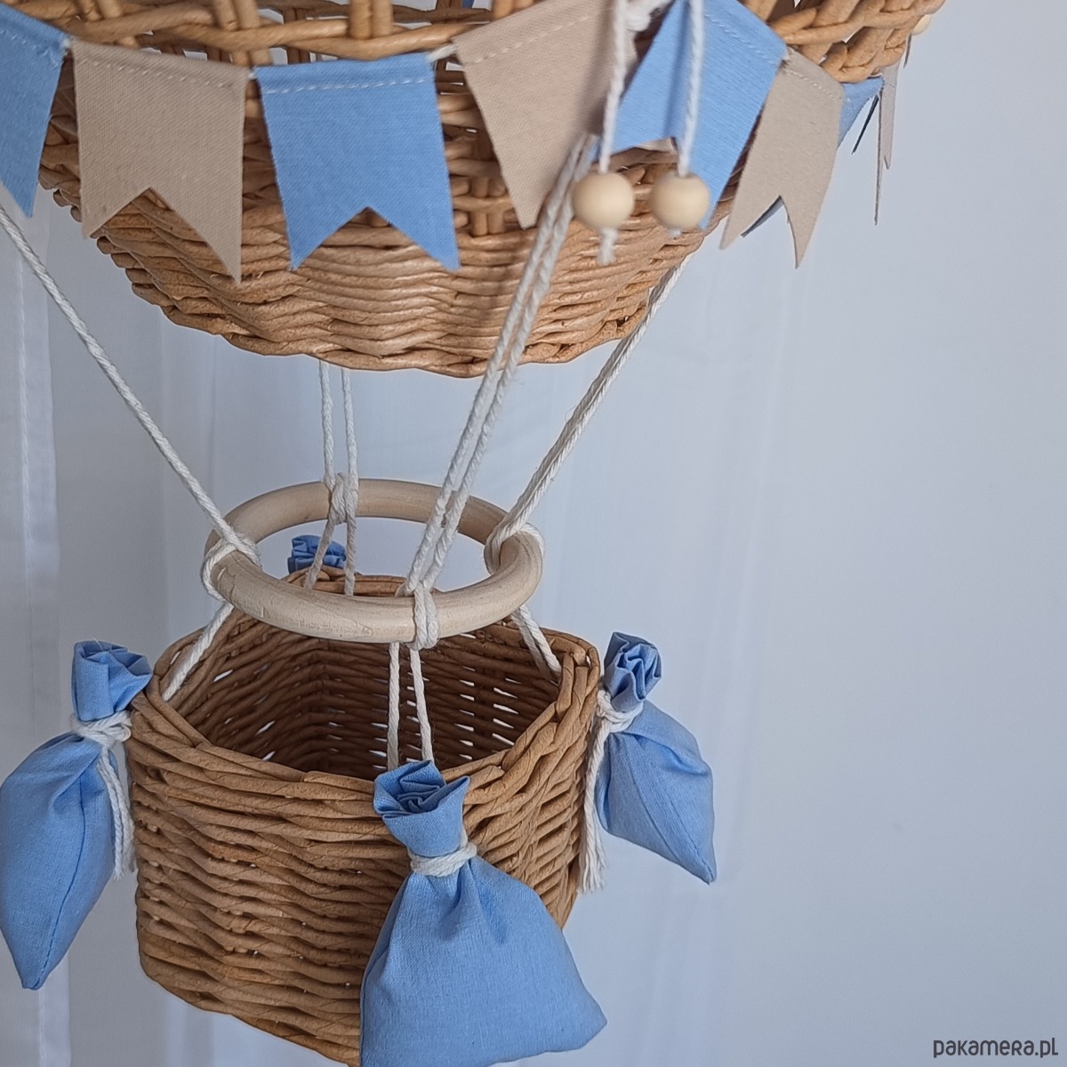 Ozdobiony bawełnianymi detalami oraz delikatnymi chorągiewkami, pięknie komponuje się z wnętrzami w stylu boho, skandynawskim oraz naturalnym.