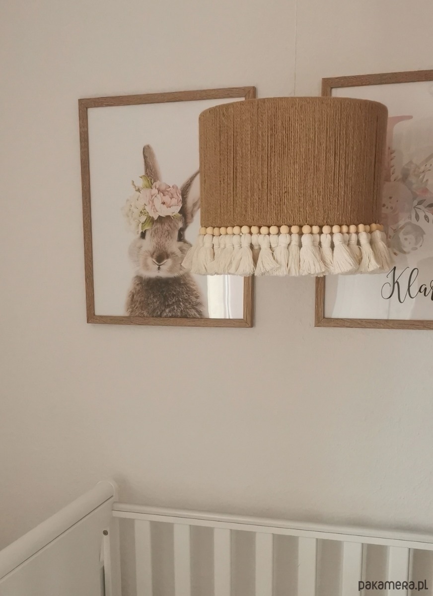 Lampa wisząca ręcznie pleciona, wykonana z juty oraz chwostów ze 100% bawełny, dodatkowe koraliki w kolorze naturalnym lub kolorowe dodają uroku lampie.