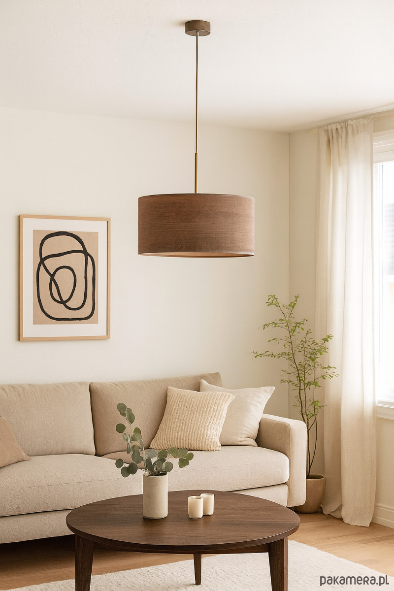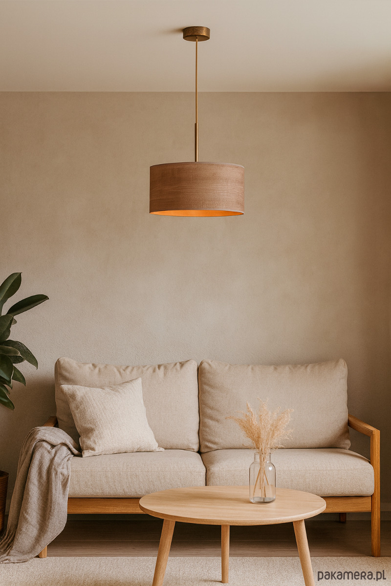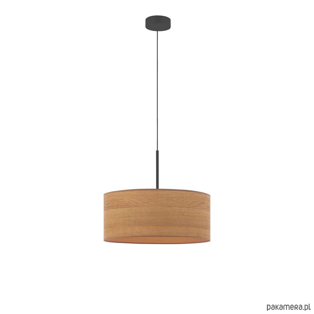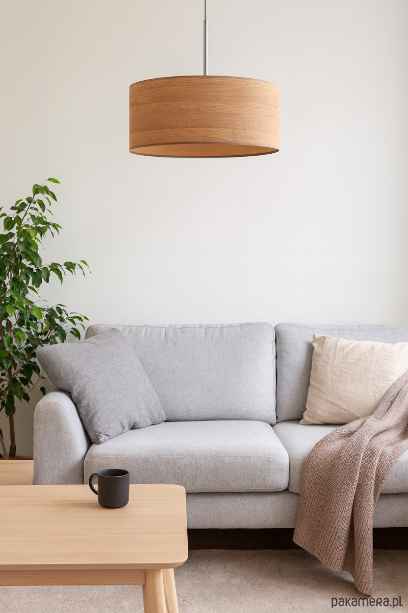 Abażurowa lampa wisząca SINTRA ECO to przykład idealnego połączenia minimalizmu, nowoczesności i stylu eco. Ten model inspirowany jest skandynawskim designem, w którym dominuje harmonia, światło i natura. Designerska lampa wisząca nad stół SINTRA ECO wyróżnia się cylindrycznym abażurem o średnicy 40 cm i wysokości 20 cm wykonanym z trwałego tworzywa PVC o strukturze drewna przypominającej naturalny fornir. Takie wykończenie sprawia, że drewniana lampa wisząca pięknie rozprasza światło, tworząc ciepły, nastrojowy klimat w pomieszczeniu. Zawieszenie z możliwością regulacji długości (do 120 cm) pozwala dopasować wysokość lampy do potrzeb danego wnętrza. Jedną z największych zalet nowoczesnej lampy wiszącej SINTRA ECO jest możliwość personalizacji – zarówno pod względem kolorystyki abażura jak i zawieszenia. Do wyboru są trzy warianty forniru oraz kilka kolorów stelaża