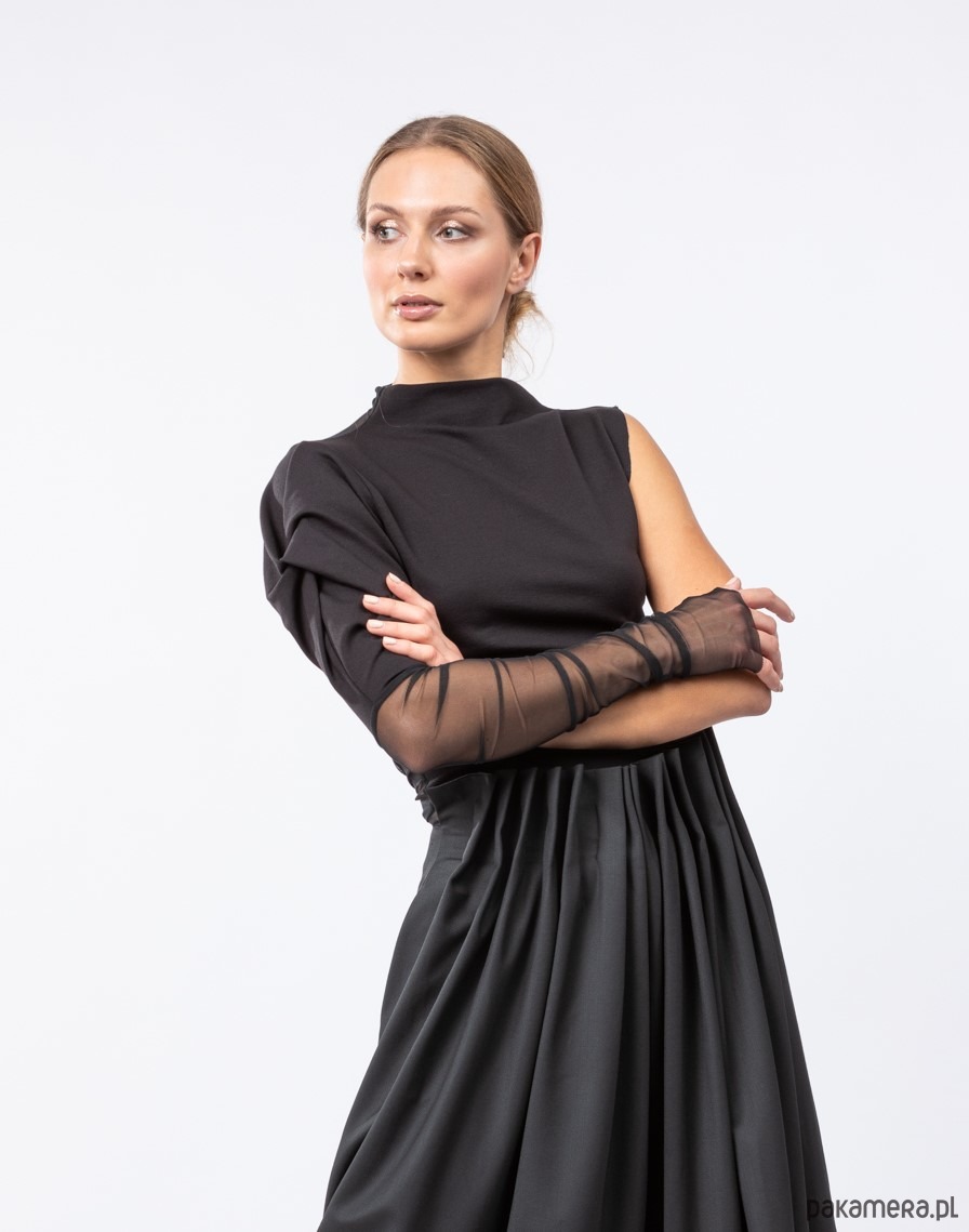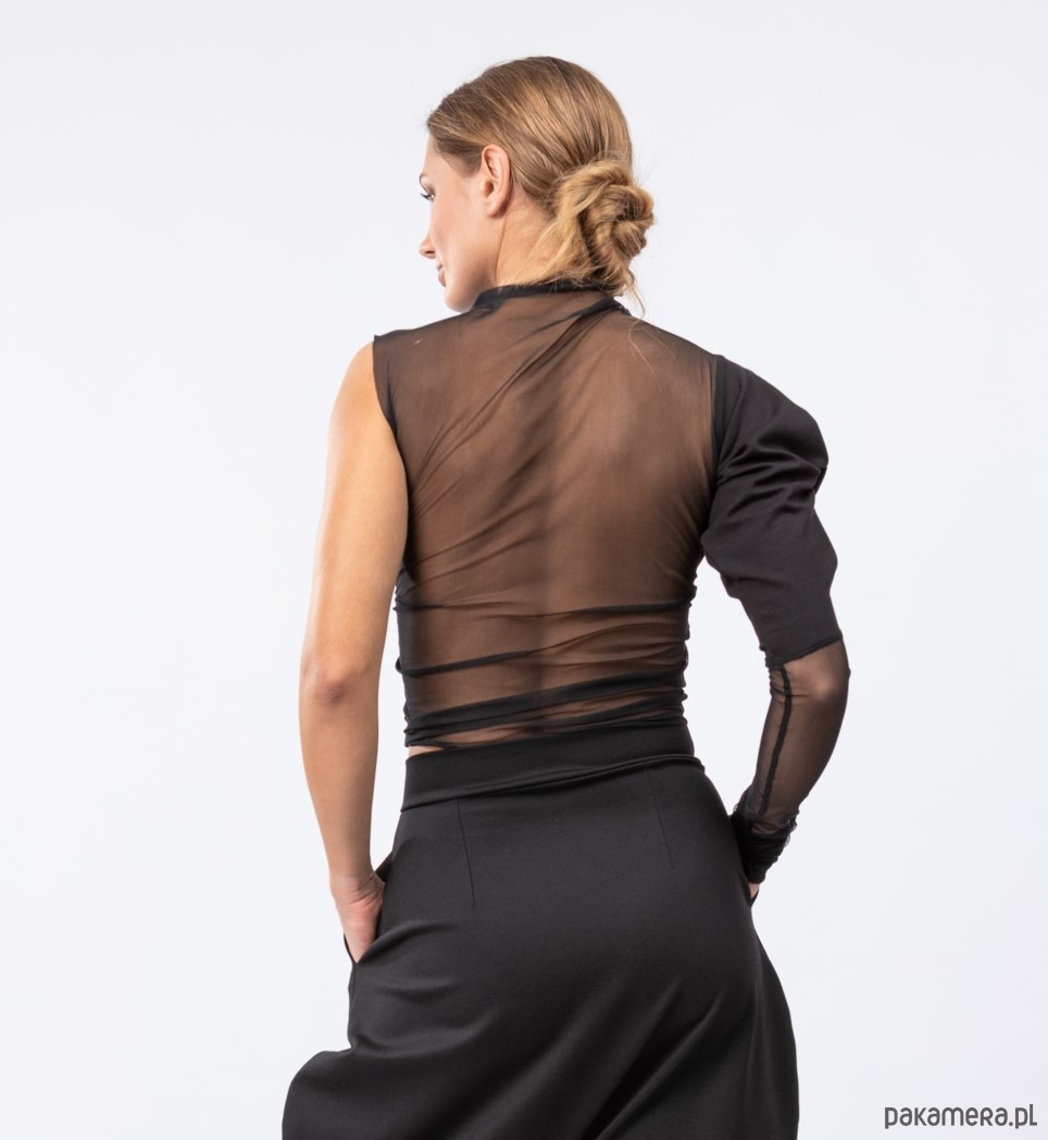 asymetryczna bluzka z kolekcji Milano2023 z jednym, bufiastym rękawem,który powstał w efekcie skęcenia węzła, przedłużonym elastycznym tiulem, uszyta z grubszej dzianiny typu morgan /wiskoza, nylon, elastan/oraz z efektownym tyłem tiulowym,